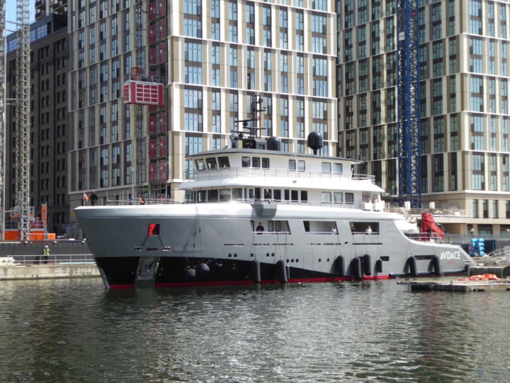 AVDACE romagic. 24 * *Click a Photo Above   once Big, click Right    Arrow in corner >   to start Slide Show   or Fast F/FW  > L:46.6x9.4m (152x30ft+) Thursday 04 July 2024 Super Yacht arrived 10am the high tide was 12 noon, but this yacht decided to take a chance and come in early to West India Dock. Only staying one day and leaving 6pm Friday.