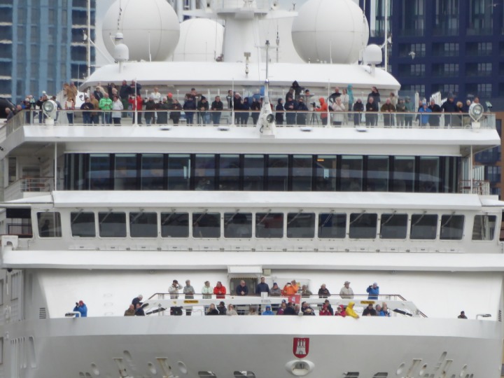 HANSEATIC NATURE romagic. 25 * *Click a Photo Above   once Big, click Right    Arrow in corner >   to start Slide Show   or Fast F/FW  > L: 138x22m (455x72ft+) Saturday 18 October 2025 Cruise Ship returns to London on a cloudy overcast lunchtime. Passing 'KISMET Mega Yacht on it's way towards  Tower Bridge lift 13:15pm and will moor alongside HMS Belfast ship  til it's departure on Sunday 19th at 13:45pm.