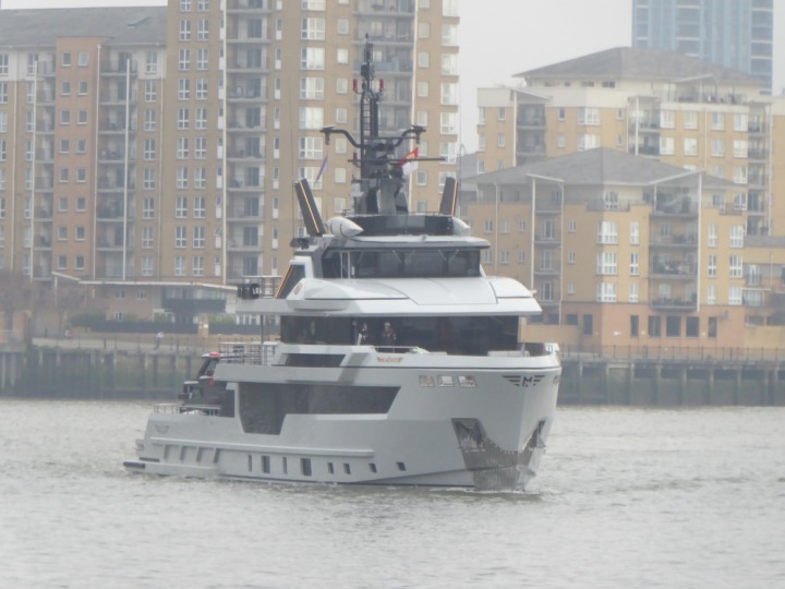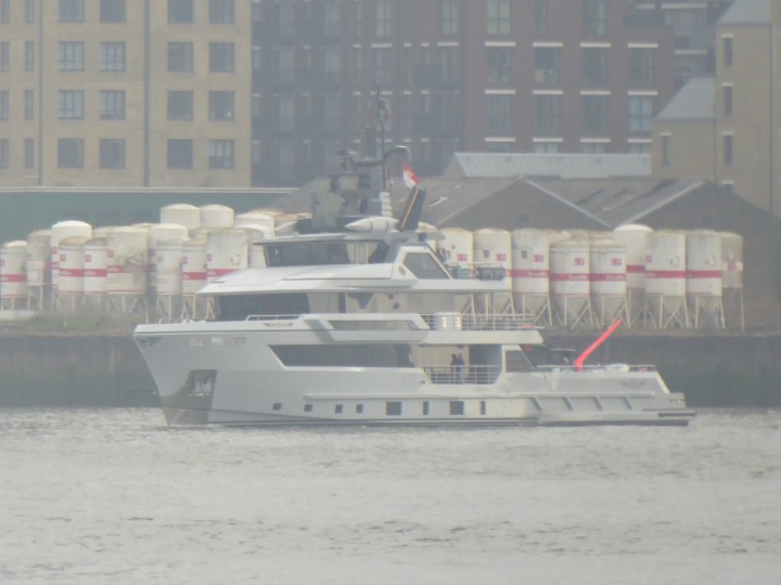 * romagic. 25 *Click a Photo Above   once Big, click Right    Arrow in corner >   to start Slide Show   or Fast F/FW  > Lt Pete Maverick Mitchell L:44.33x8.6m (145x28ft+) The First Super Yacht  to visit London 2025 Wednesday 26 March 09:18am this Yacht arrived at the 02 Dome going to Tower Bridge. Lift 09:07 sounding it's horn on arrival, then turned around and at 09:40 came back and moored at George's Stairs opposite the restaurants.