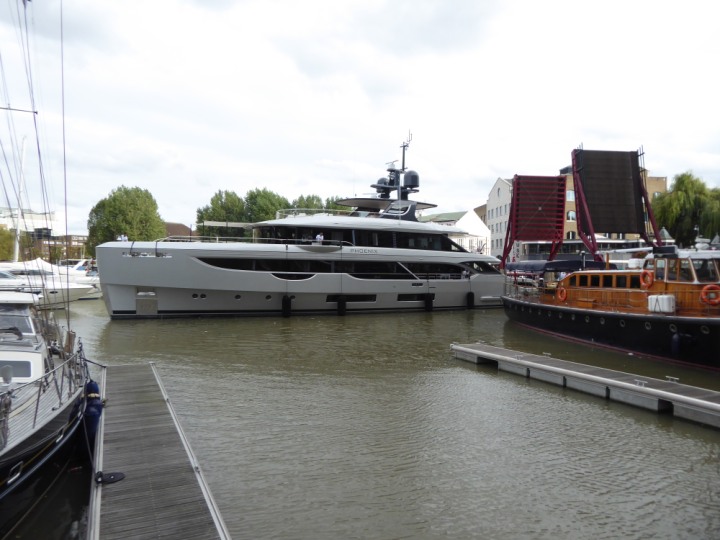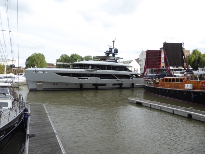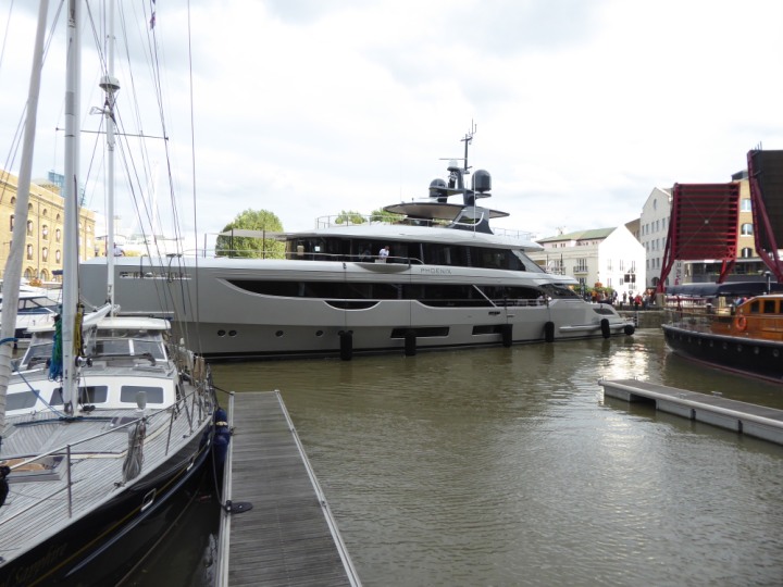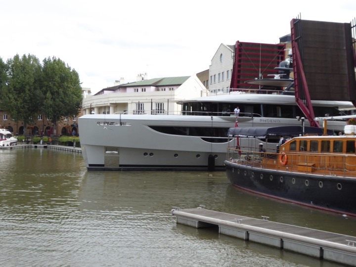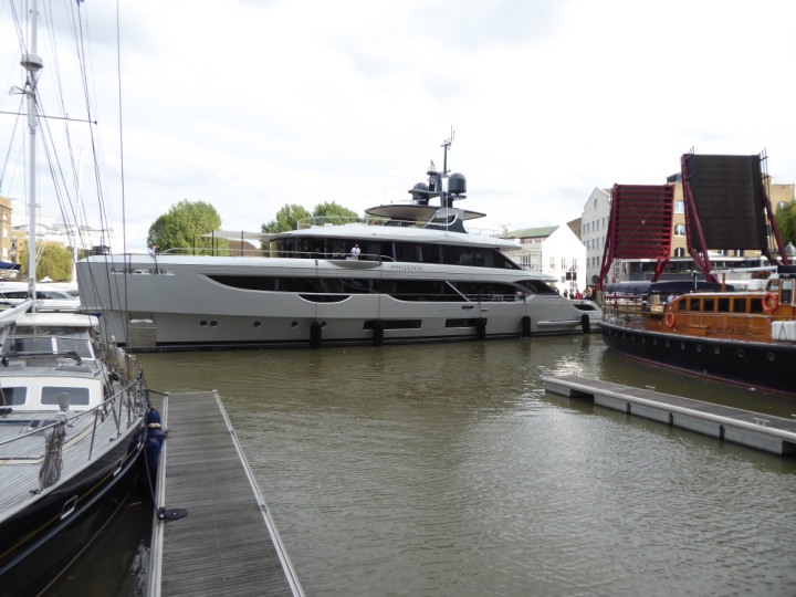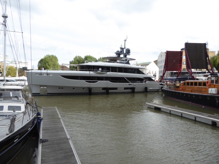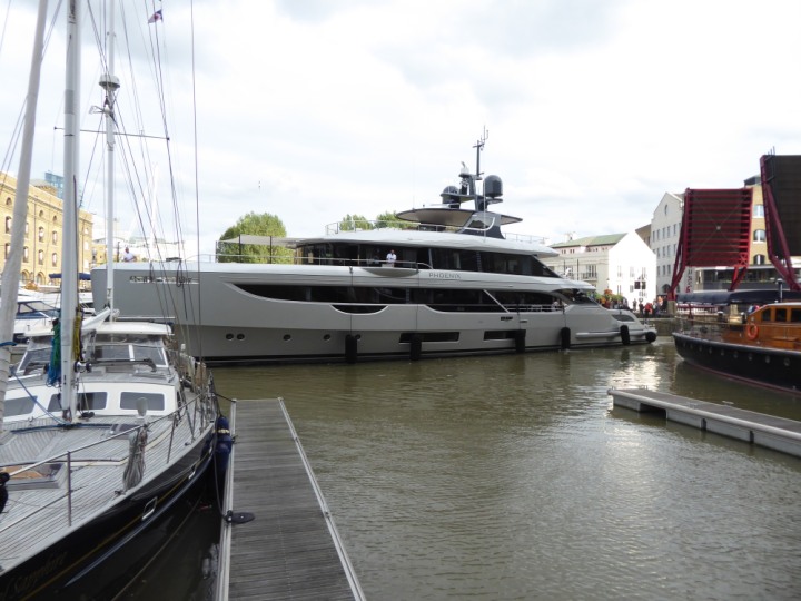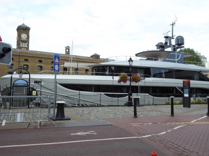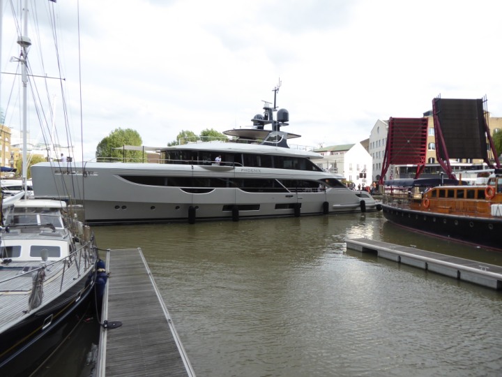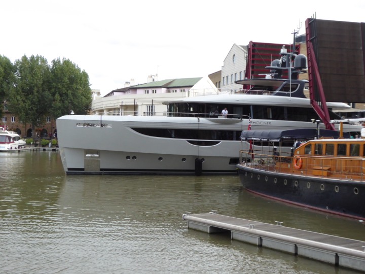 PHONIX .23 L:40x8m (131x26ft+) romagic.co.uk * *Click a Photo Above   once Big, click Right    Arrow in corner >   to start Slide Show   or Fast F/FW  > Sunday 01 October 2023 Super Yacht now moved  from West India Dock to St Katherine Dock up by Tower Bridge. Last here 22 December 2022 for Christmas and New Year
