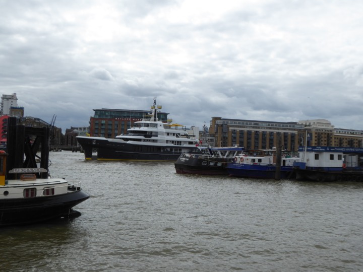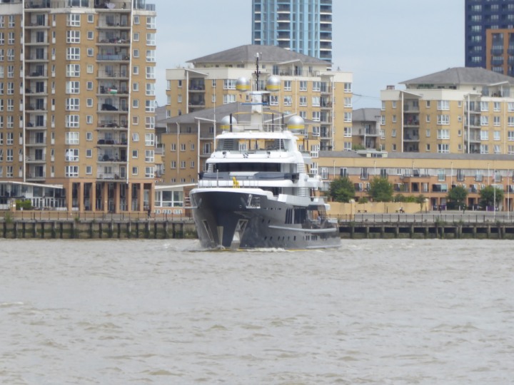 SCOUT .24 romagic. 24 * *Click a Photo Above   once Big, click Right    Arrow in corner >   to start Slide Show   or Fast F/FW  > L:64x12m (209x39ft+) Wednesday 7th August 2024 Super Yacht returns to London Scout' the Big yellow Dog still on the front (bow) of the yacht as it moves up the River Thames to Tower Bridge, mooring close to Butler's Wharf at 3pm. Last here 30 July- 16 Aug 2023
