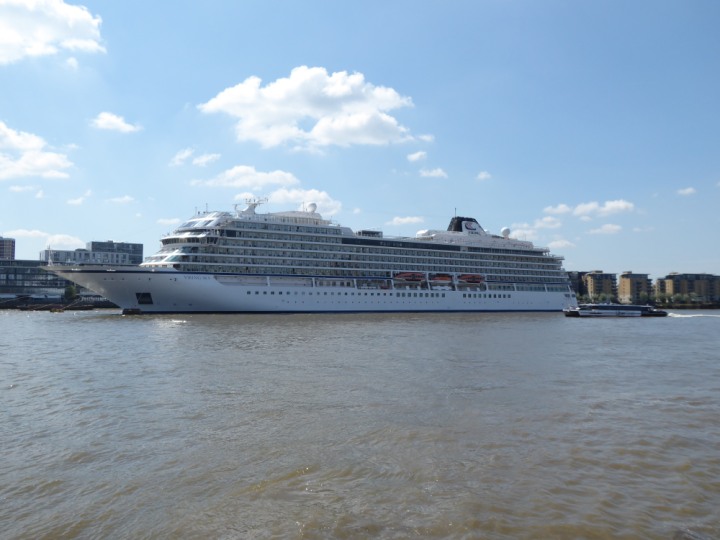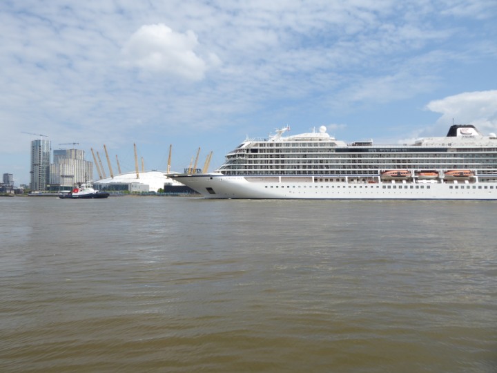 VIKING SKY romagic. 24 * *Click a Photo Above   once Big, click Right    Arrow in corner >   to start Slide Show   or Fast F/FW  > VIKING SKY Sunday 05 May  Ship arrived early morning on the high tide, (no pic's)  but I did get down to Greenwich Tier on Tuesday for it's departure at 13:30pm.  Sunny bright day, really warm T-Shirt weather, the last few  days rain. L:227x29m (745x94ft+)