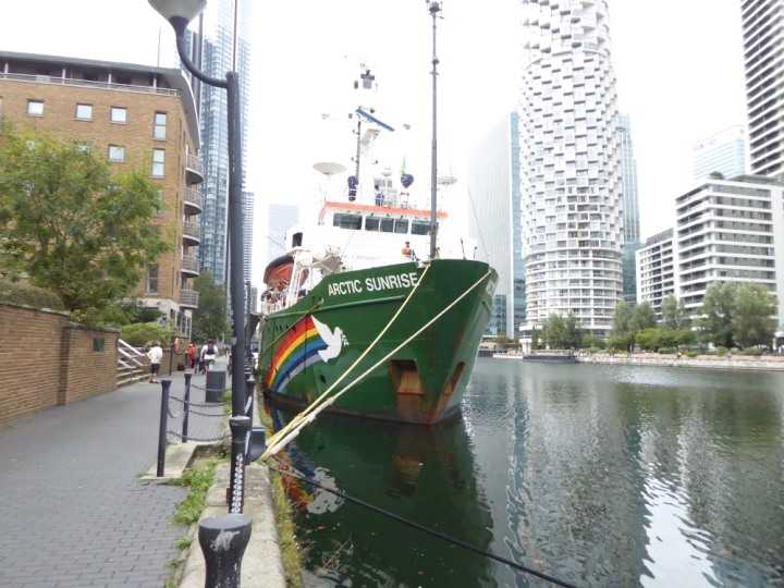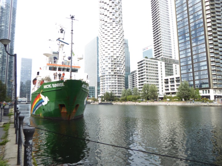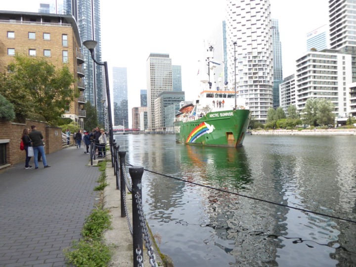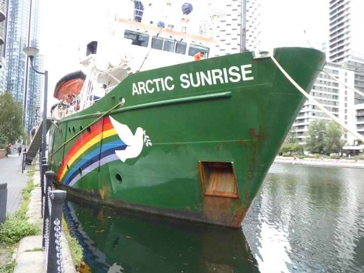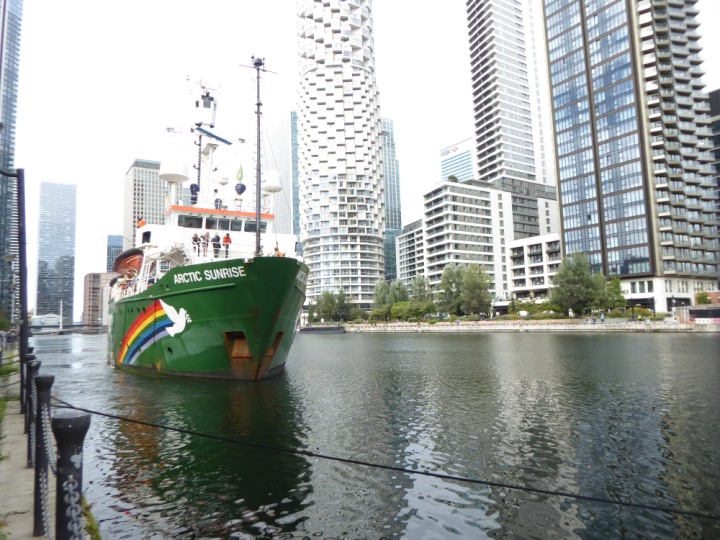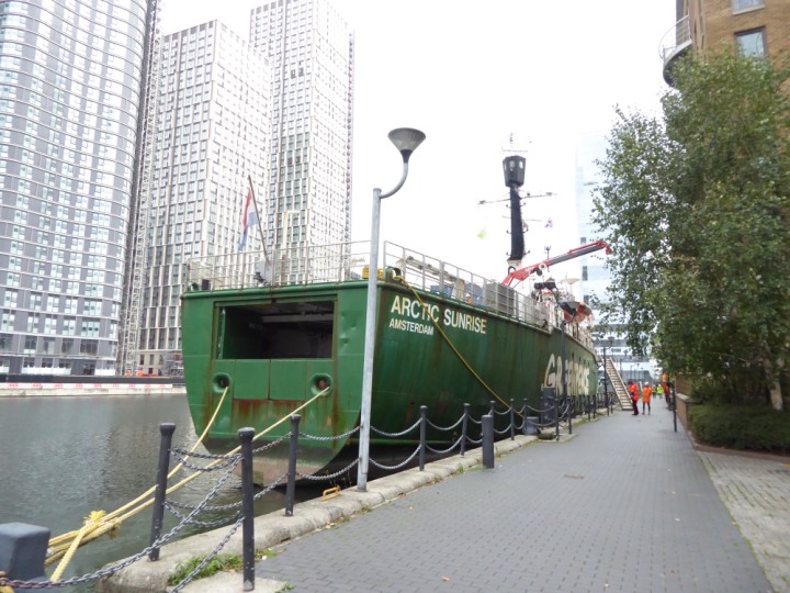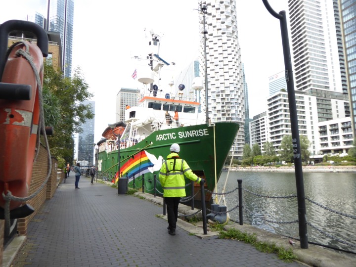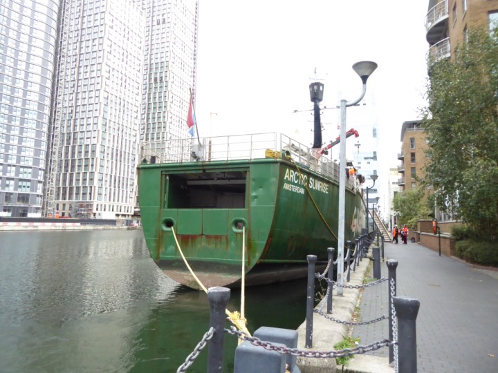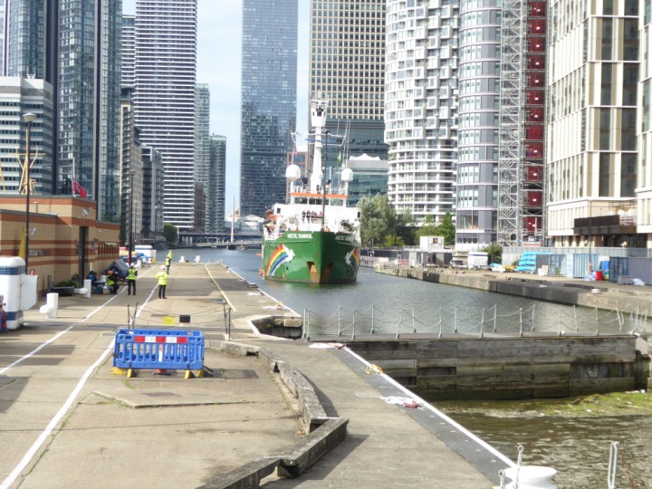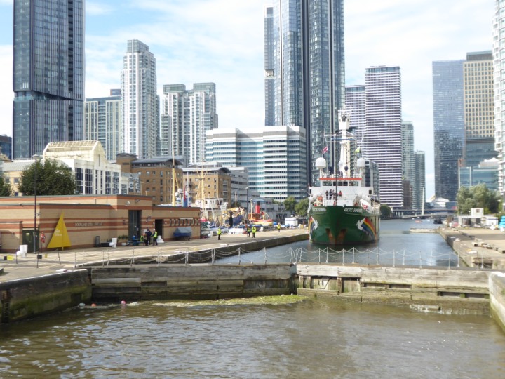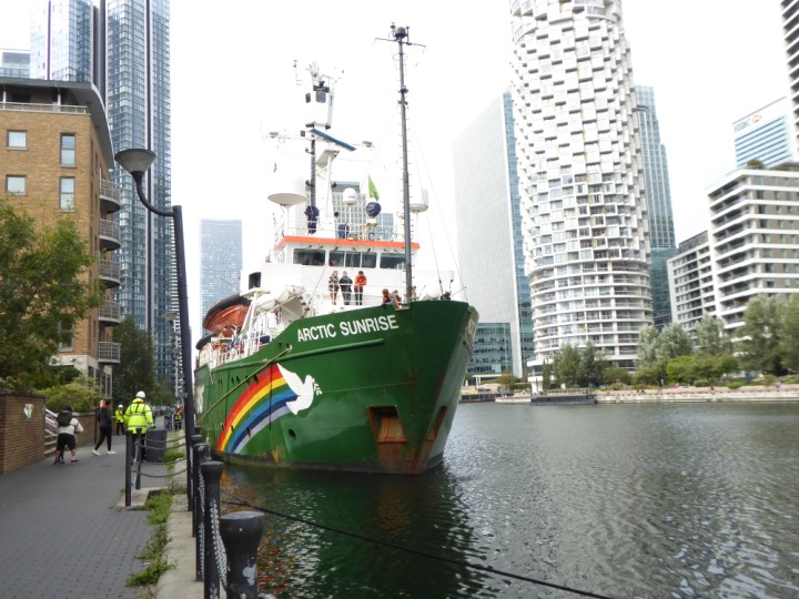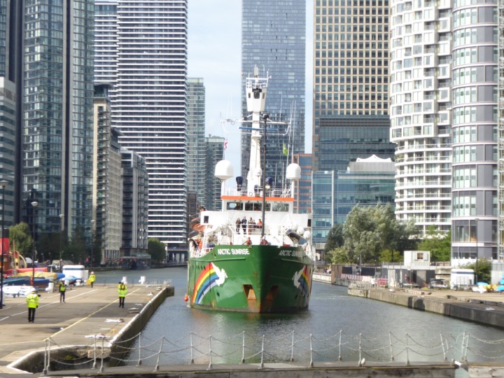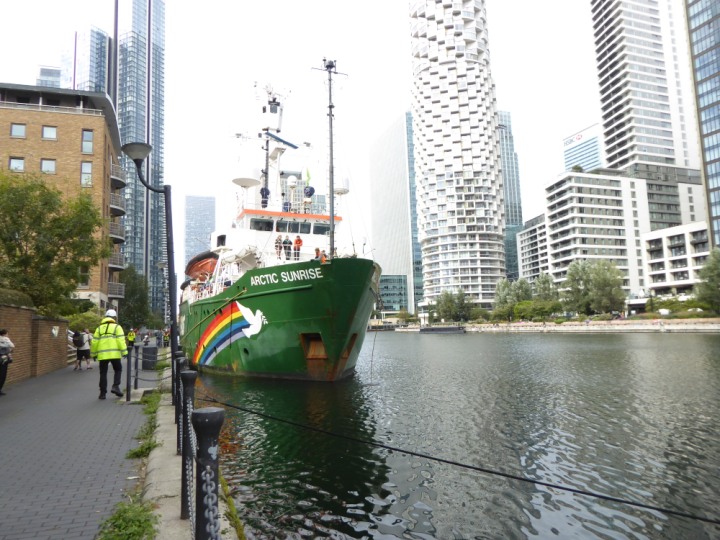 ARCTIC SUNRISE romagic. 24 * *Click a Photo Above   once Big, click Right    Arrow in corner >   to start Slide Show   or Fast F/FW  > I did get these photos of it's departure on Sunday 29th on a dry sunny morning. Wednesday 25 September 2024 West India Dock this ship arrived early, rain showers were on and off all day. no photos. GREENPEACE ARCTIC SUNRISE L:50.5x11.55m (165x37.9ft+)