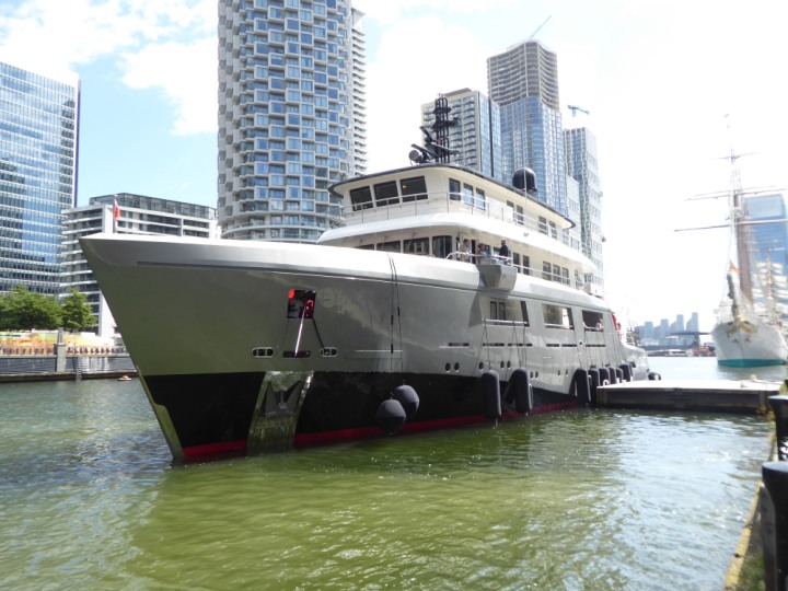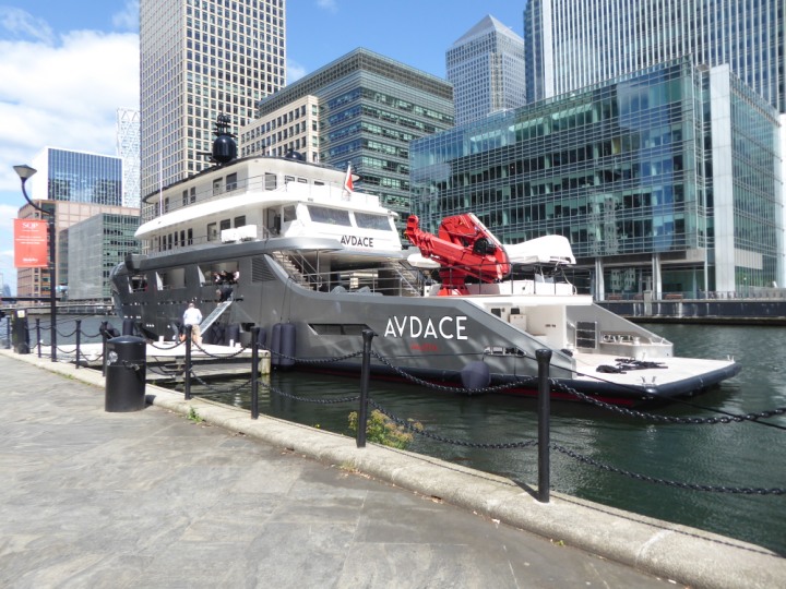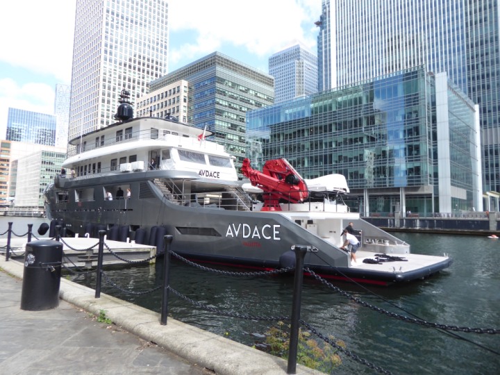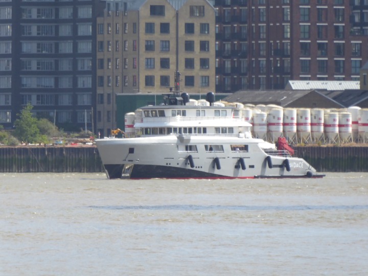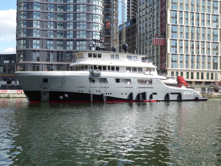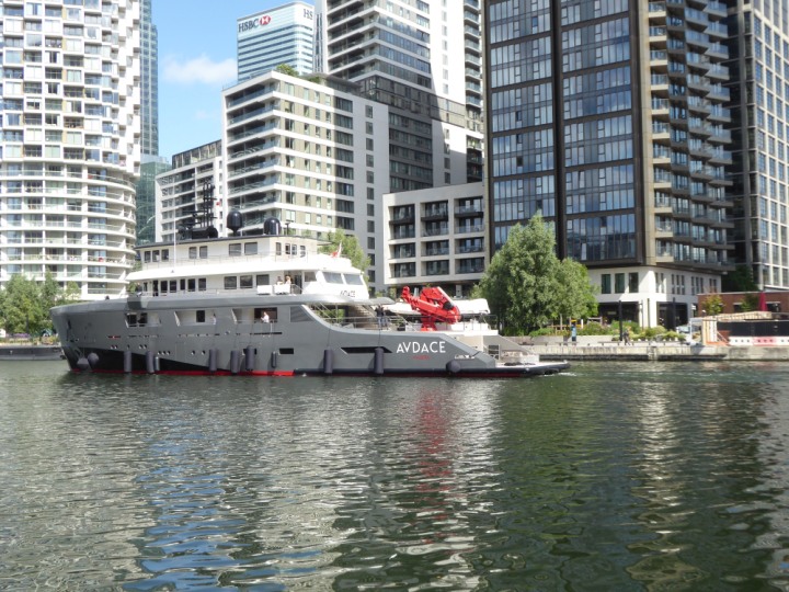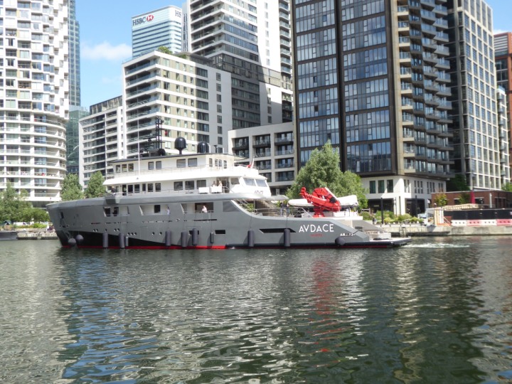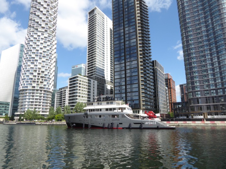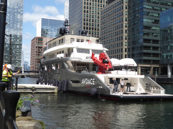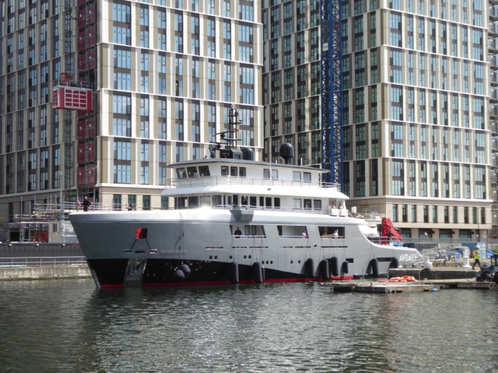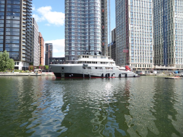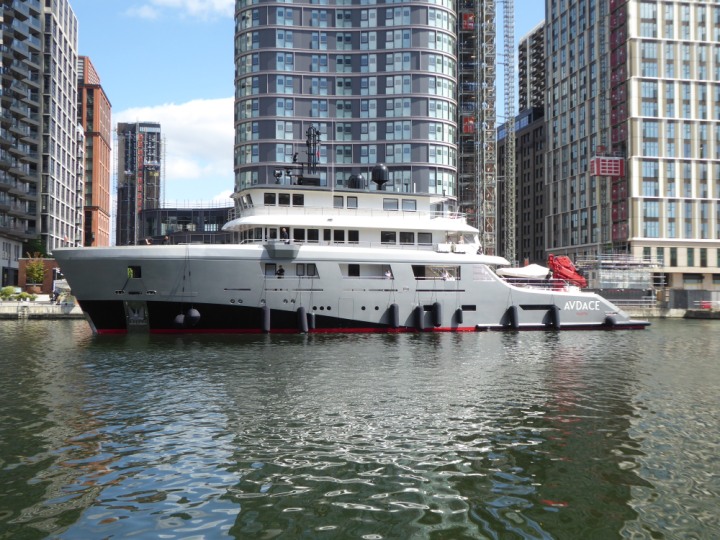 AVDACE romagic. 24 * *Click a Photo Above   once Big, click Right    Arrow in corner >   to start Slide Show   or Fast F/FW  > L:46.6x9.4m (152x30ft+) Thursday 04 July 2024 Super Yacht arrived 10am the high tide was 12 noon, but this yacht decided to take a chance and come in early to West India Dock. Only staying one day and leaving 6pm Friday.