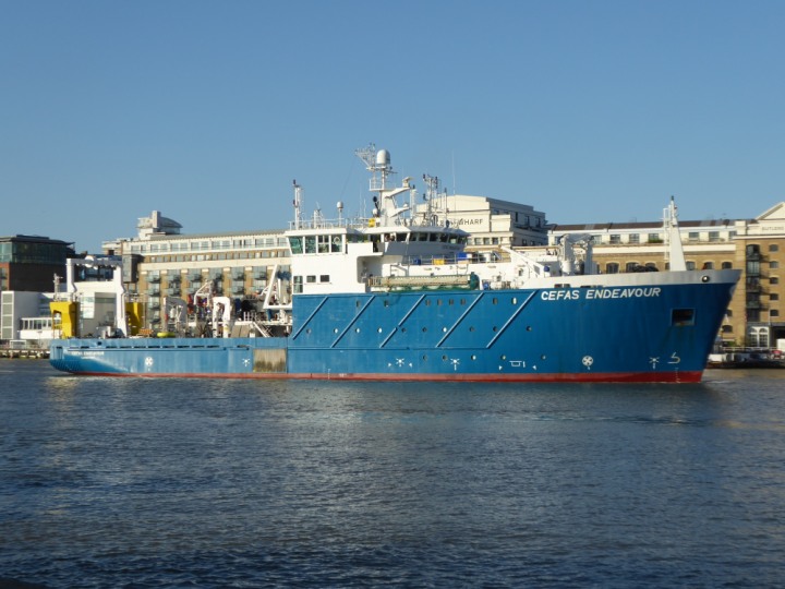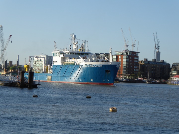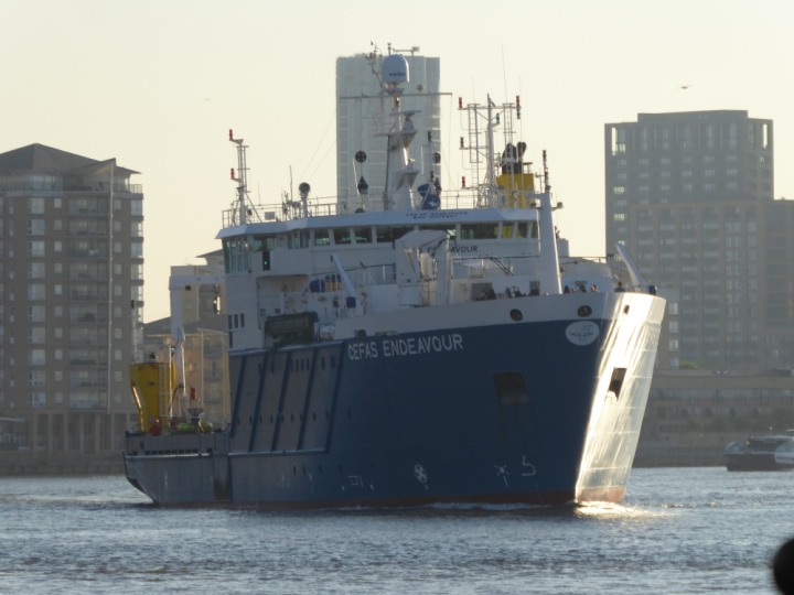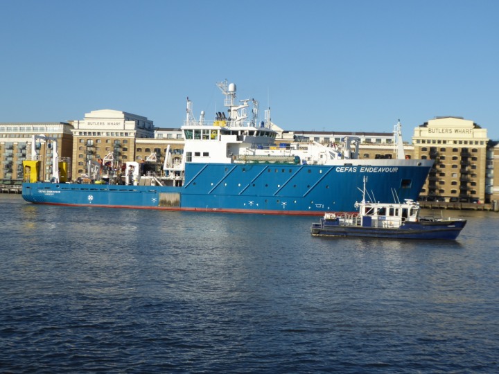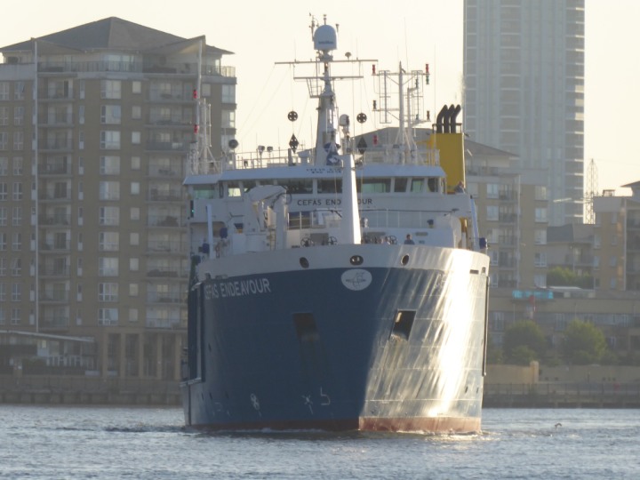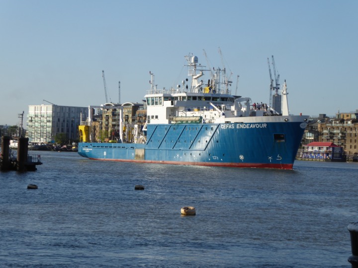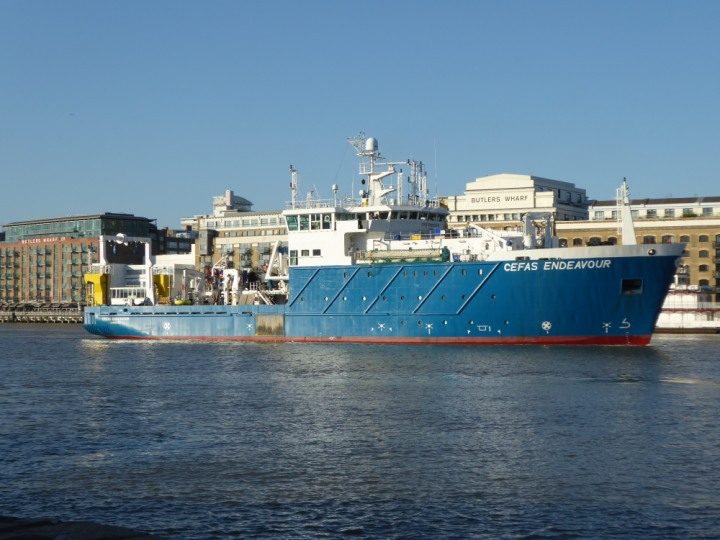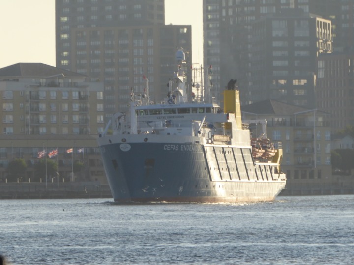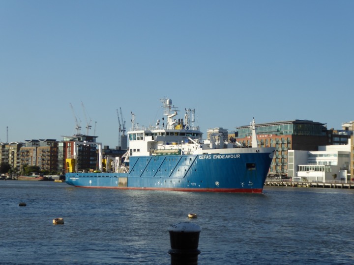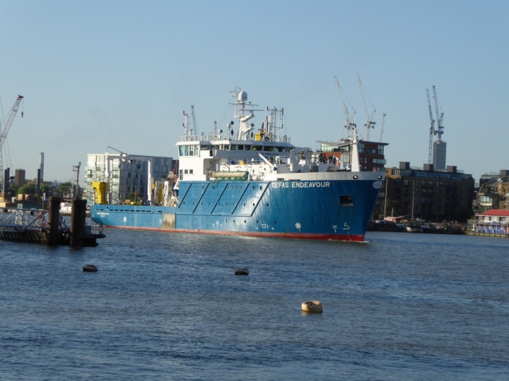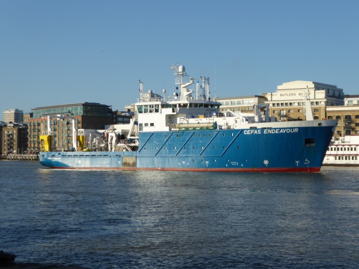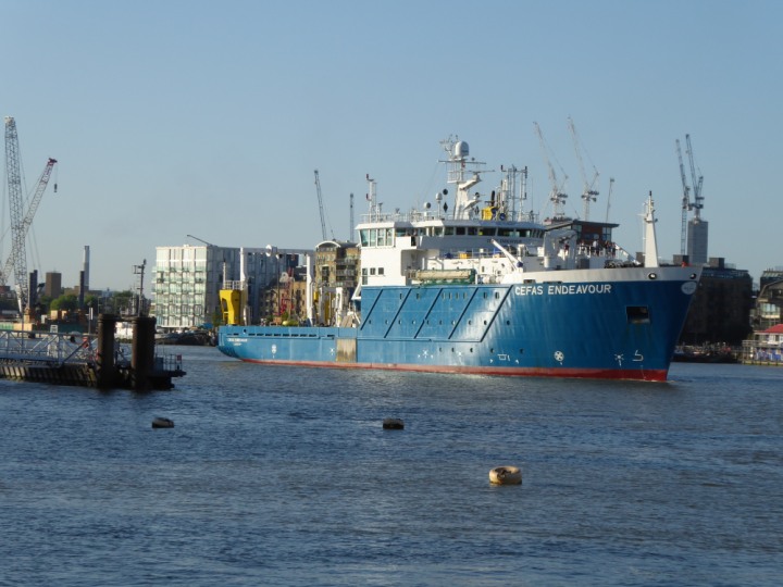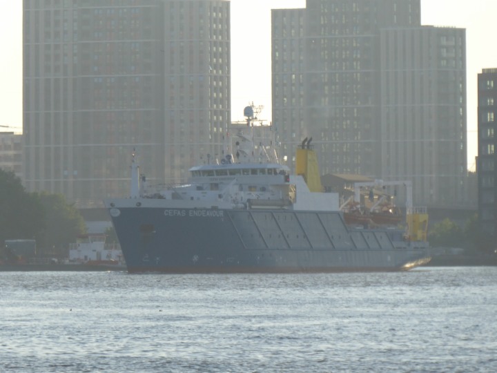 CEFAS  ENDEVOUR .25 romagic.co.uk * Tower Bridge upper *Click a Photo Above   once Big, click Right    Arrow in corner >   to start Slide Show   or Fast F/FW  > MV CEFAS ENDEVOUR L:74x16m (242x52ft+) Monday 30 June 2025. 6:05 This Survey, Research vessel due at Tower Bridge Lift 6:45 and is staying til Wednesday 18:30pm. Built 2003 under UK Flag