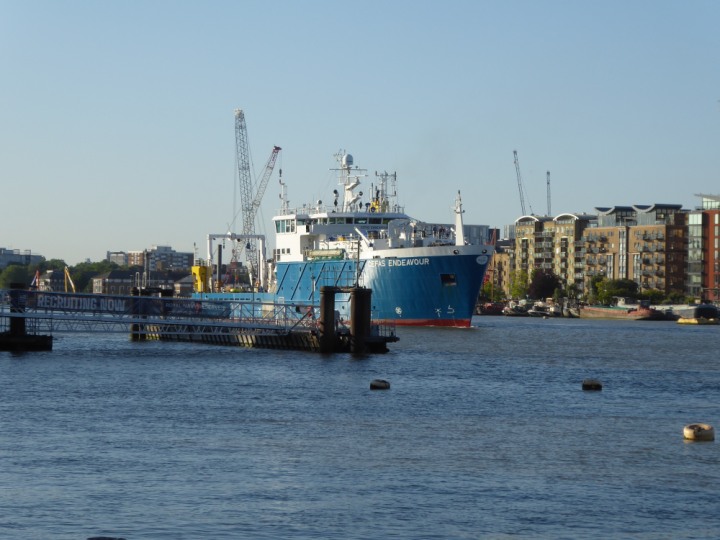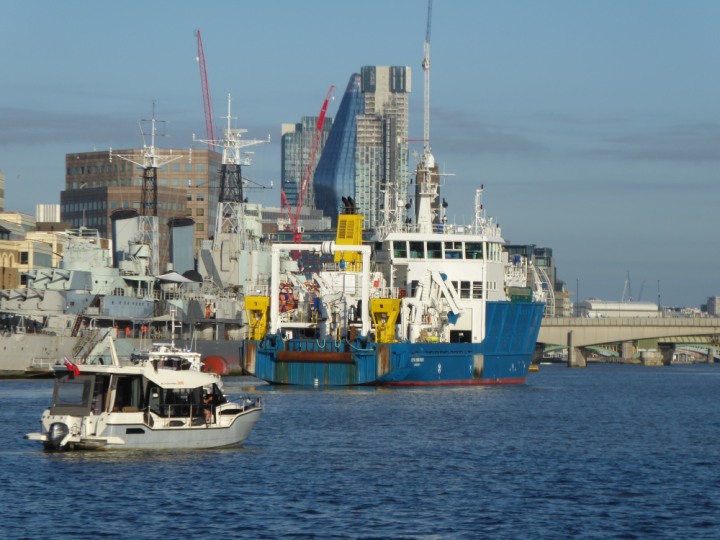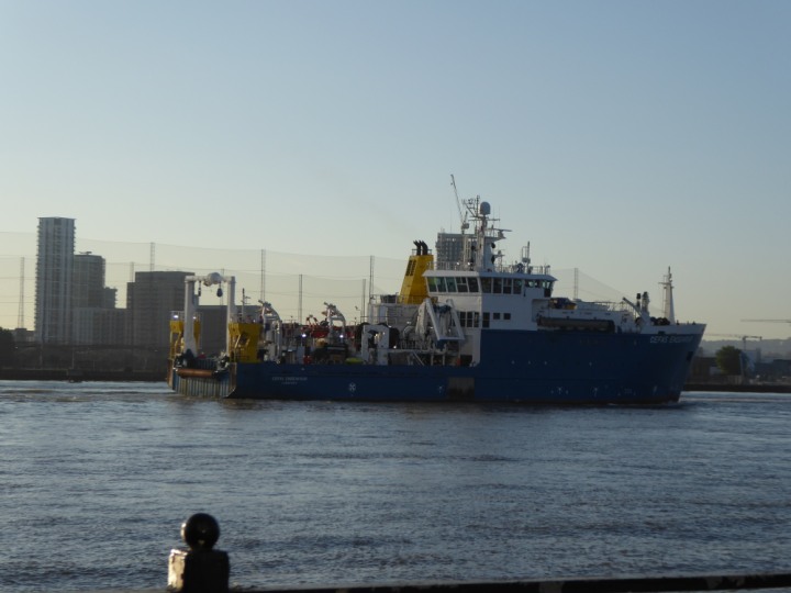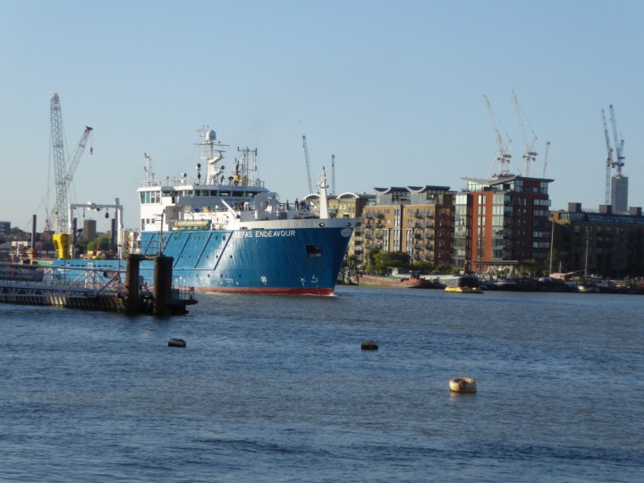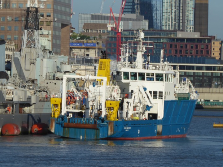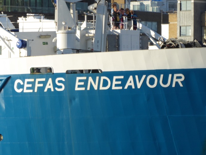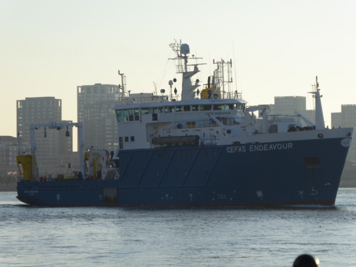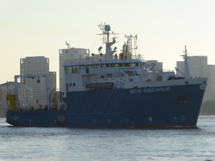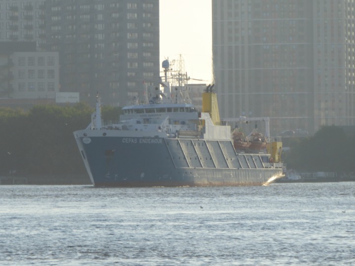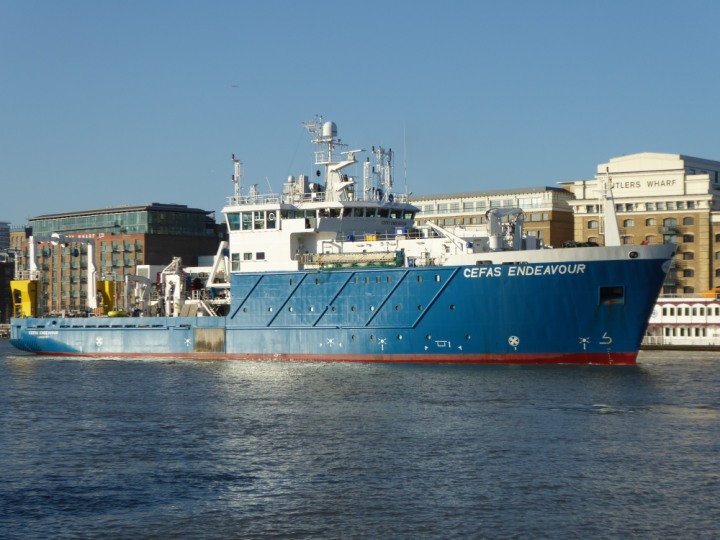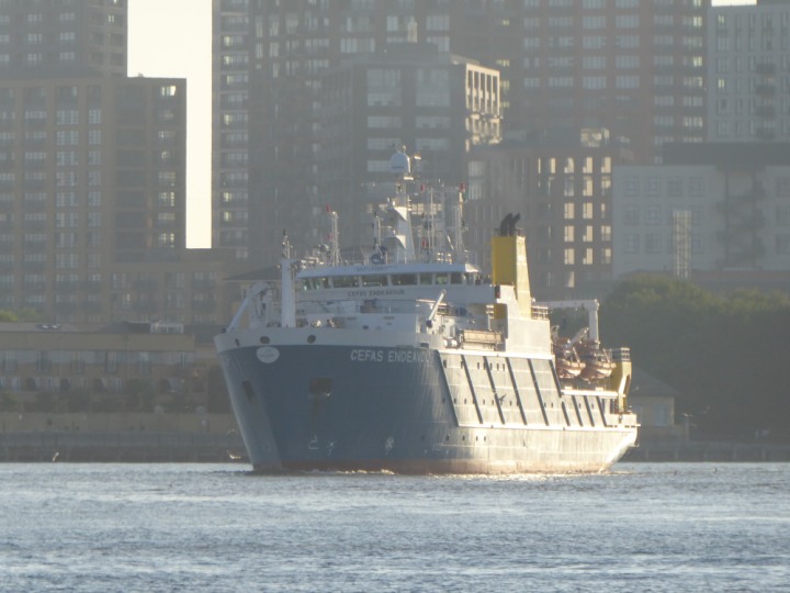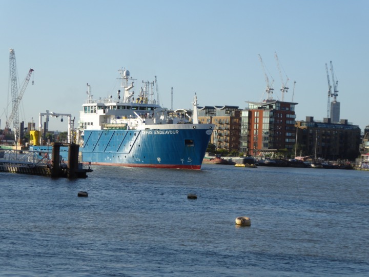 CEFAS  ENDEVOUR .25 romagic.co.uk * Tower Bridge upper *Click a Photo Above   once Big, click Right    Arrow in corner >   to start Slide Show   or Fast F/FW  > MV CEFAS ENDEVOUR L:74x16m (242x52ft+) Monday 30 June 2025. 6:05 This Survey, Research vessel due at Tower Bridge Lift 6:45 and is staying til Wednesday 18:30pm. Built 2003 under UK Flag