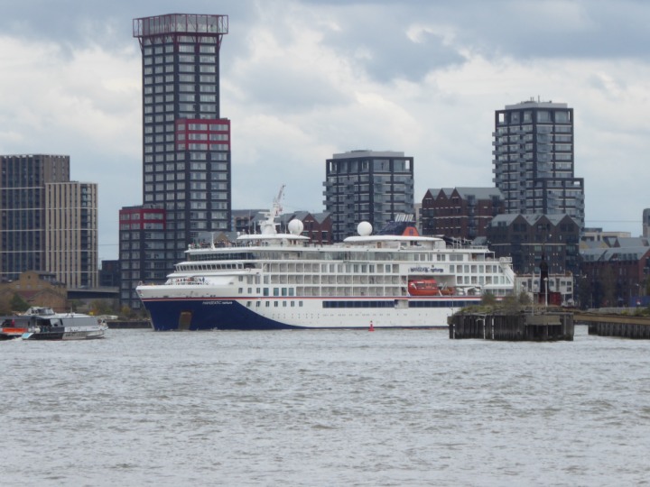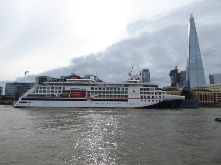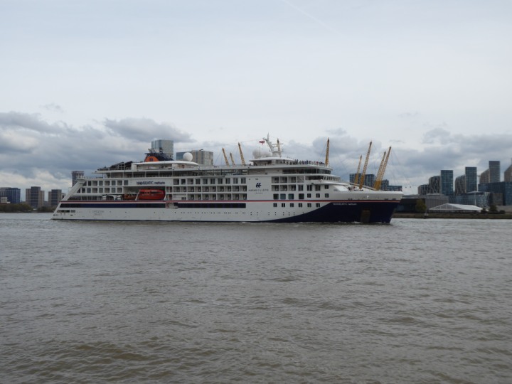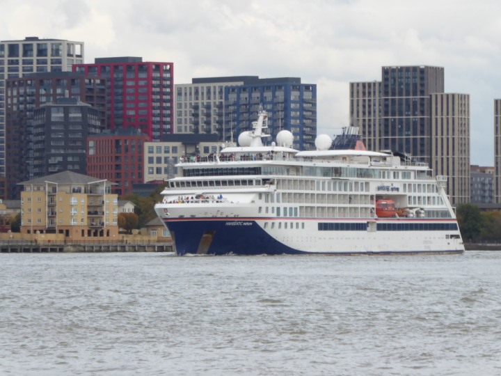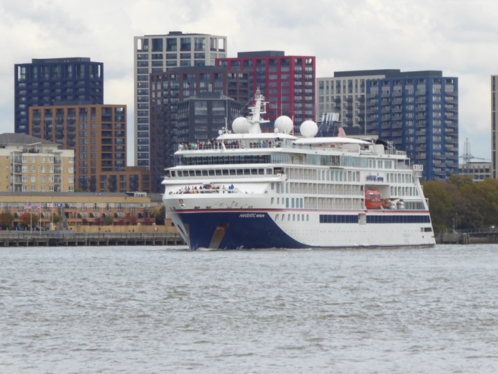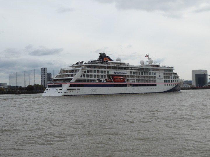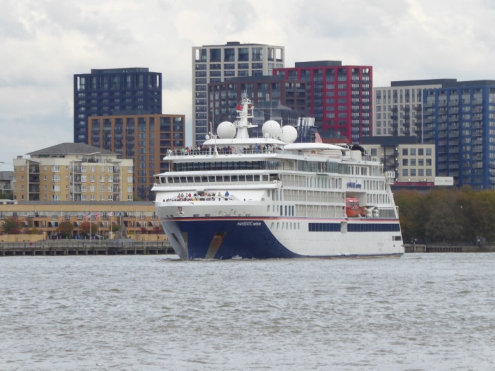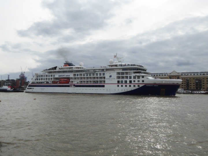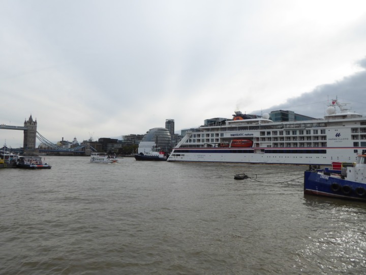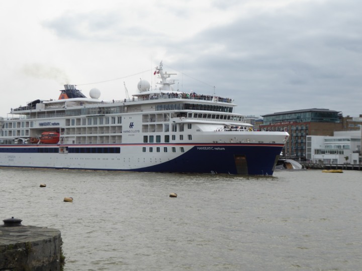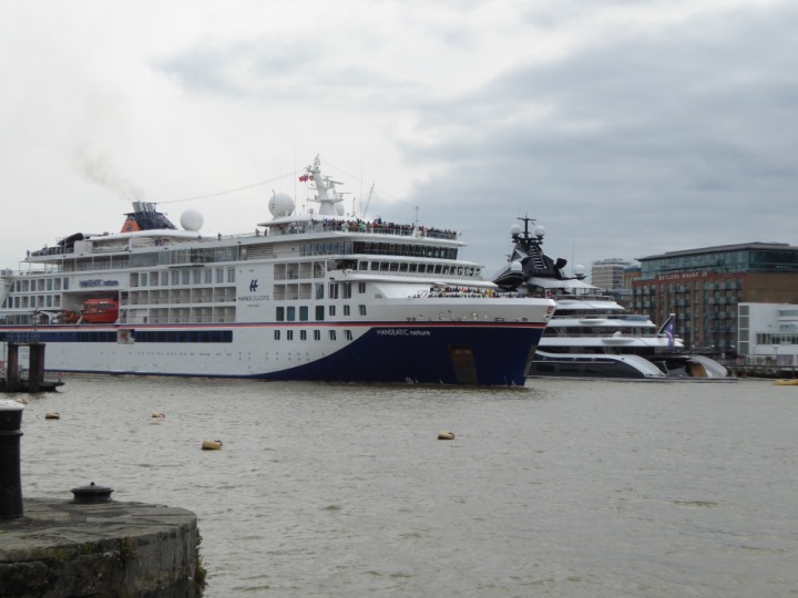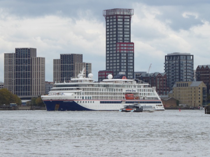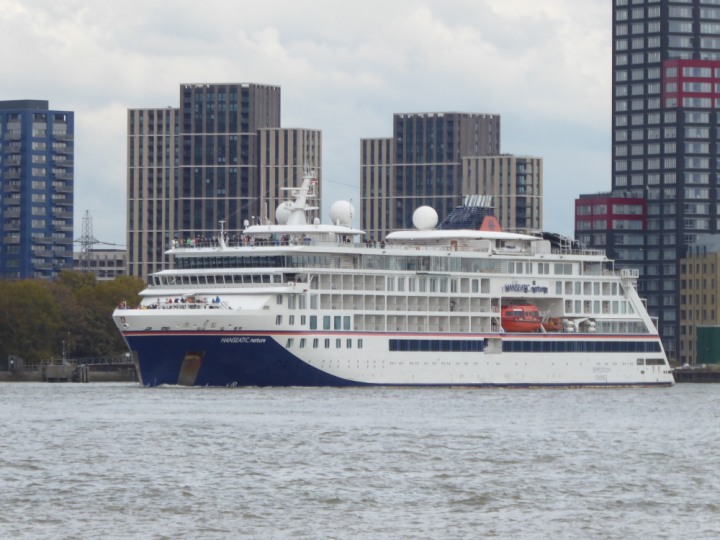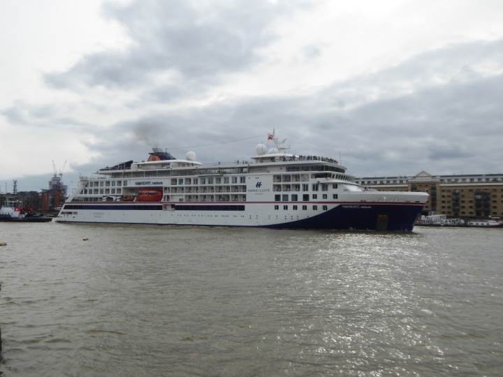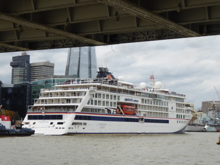 HANSEATIC NATURE romagic. 25 * *Click a Photo Above   once Big, click Right    Arrow in corner >   to start Slide Show   or Fast F/FW  > L: 138x22m (455x72ft+) Saturday 18 October 2025 Cruise Ship returns to London on a cloudy overcast lunchtime. Passing 'KISMET Mega Yacht on it's way towards  Tower Bridge lift 13:15pm and will moor alongside HMS Belfast ship  til it's departure on Sunday 19th at 13:45pm.