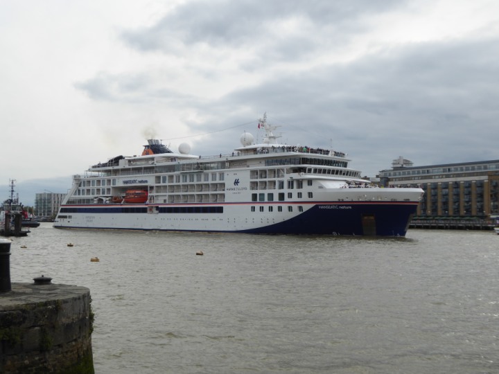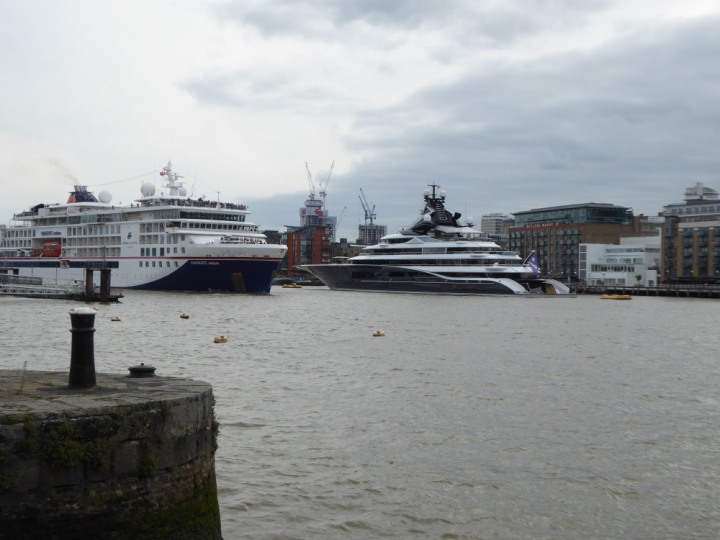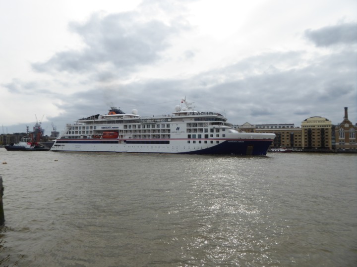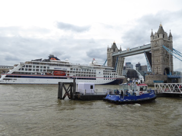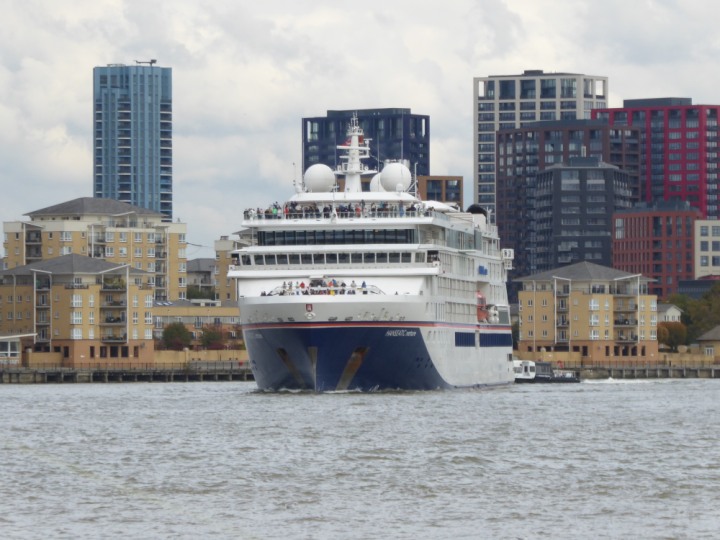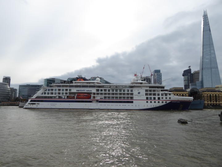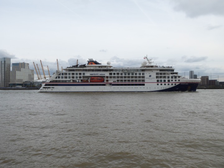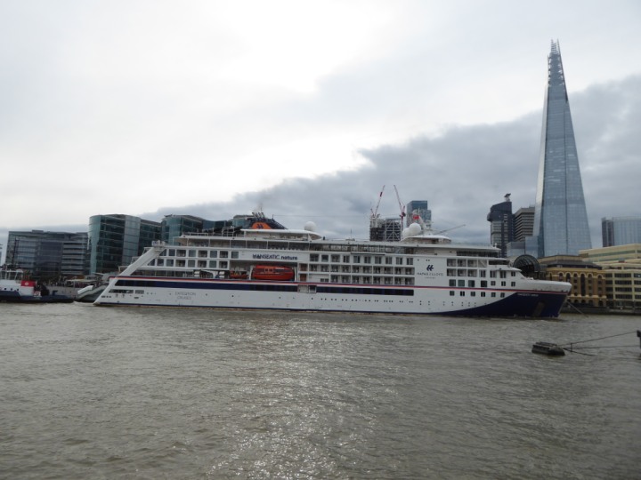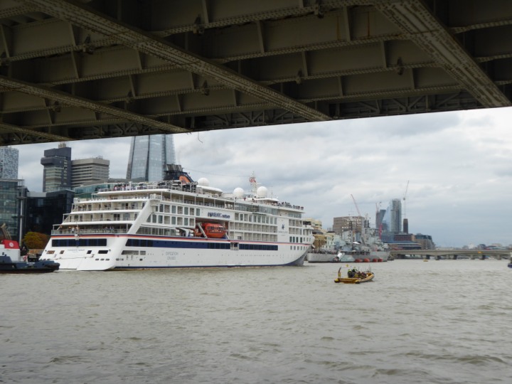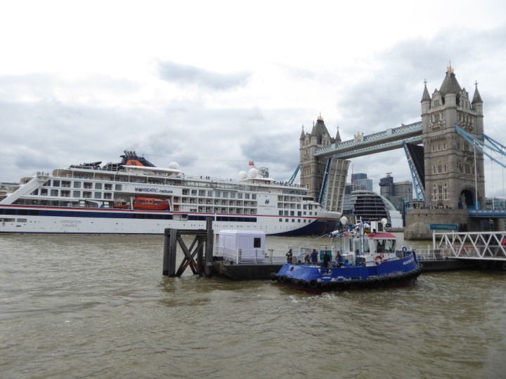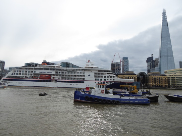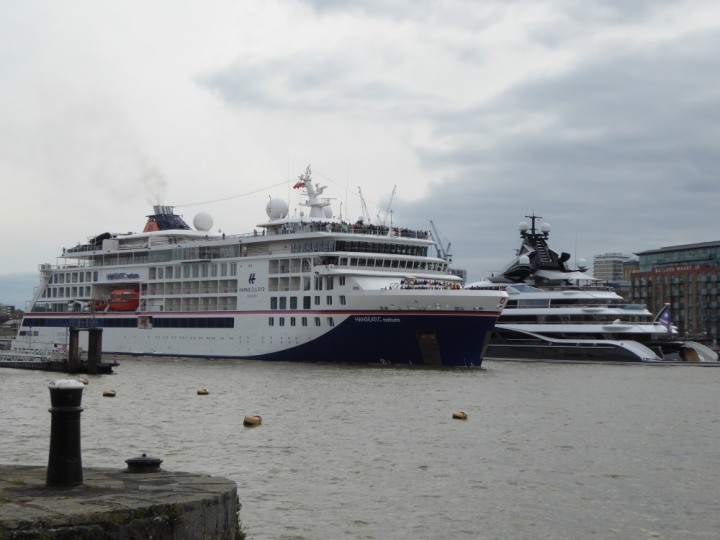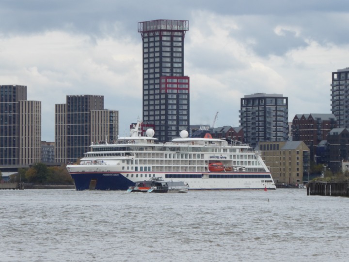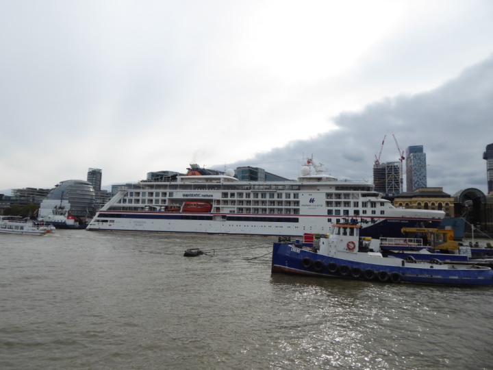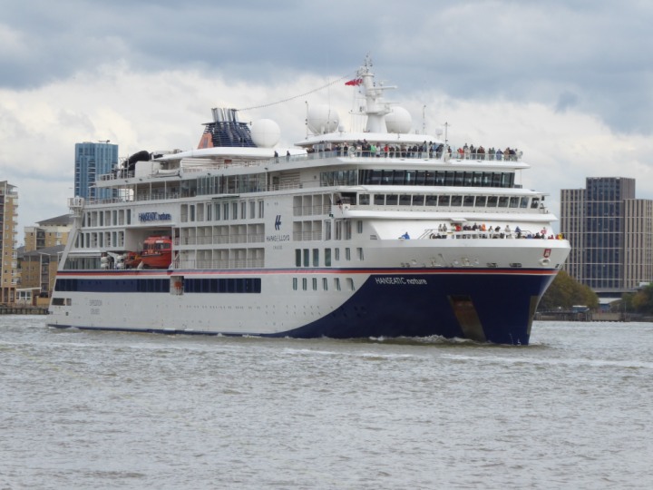 HANSEATIC NATURE romagic. 25 * *Click a Photo Above   once Big, click Right    Arrow in corner >   to start Slide Show   or Fast F/FW  > L: 138x22m (455x72ft+) Saturday 18 October 2025 Cruise Ship returns to London on a cloudy overcast lunchtime. Passing 'KISMET Mega Yacht on it's way towards  Tower Bridge lift 13:15pm and will moor alongside HMS Belfast ship  til it's departure on Sunday 19th at 13:45pm.