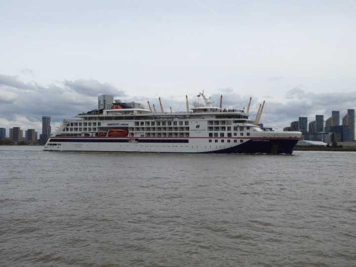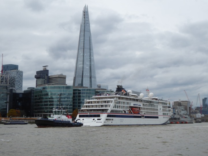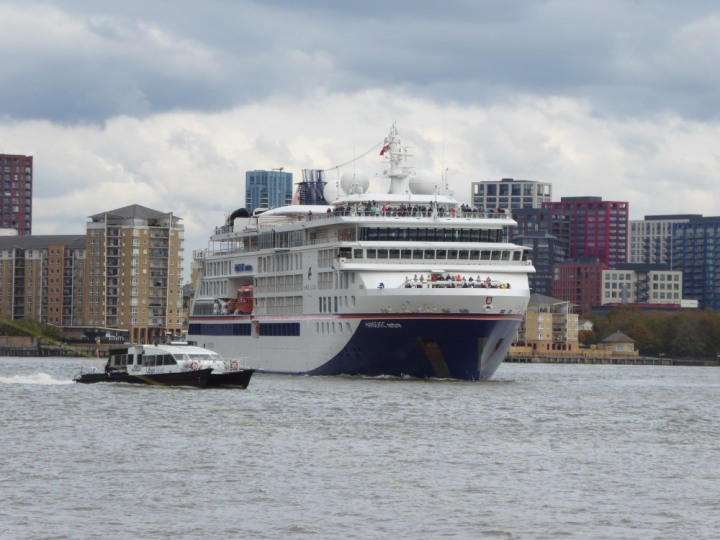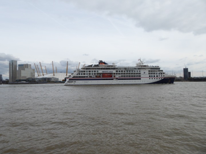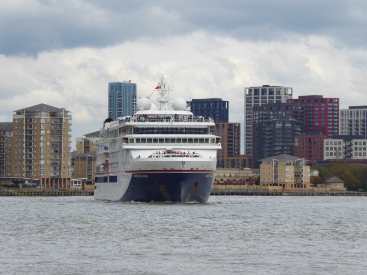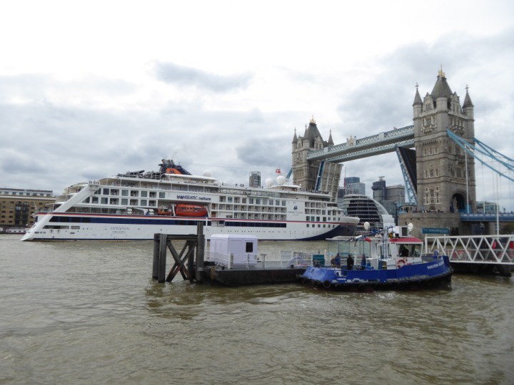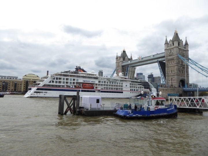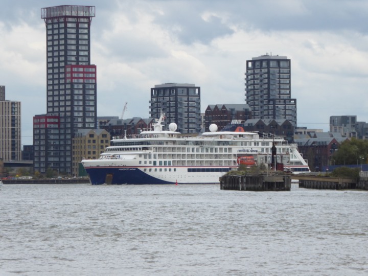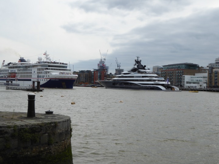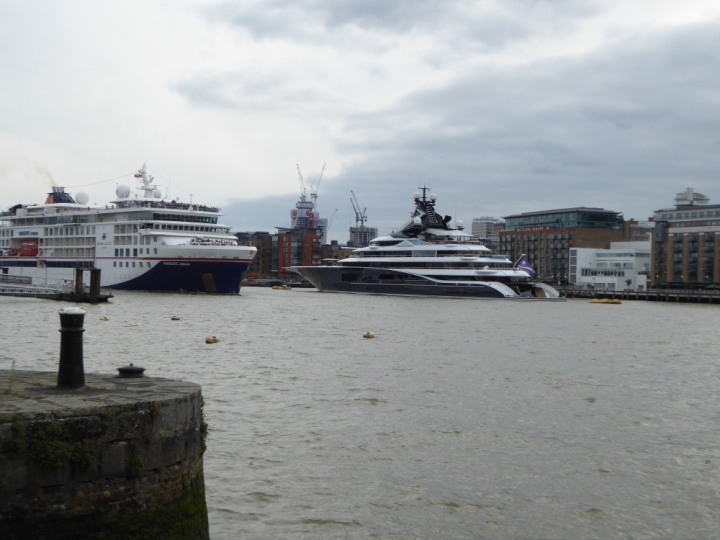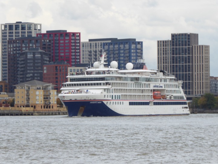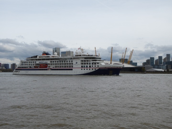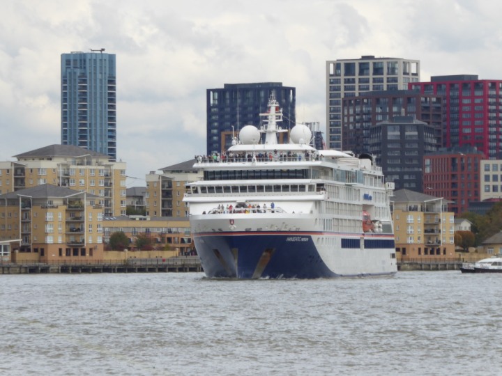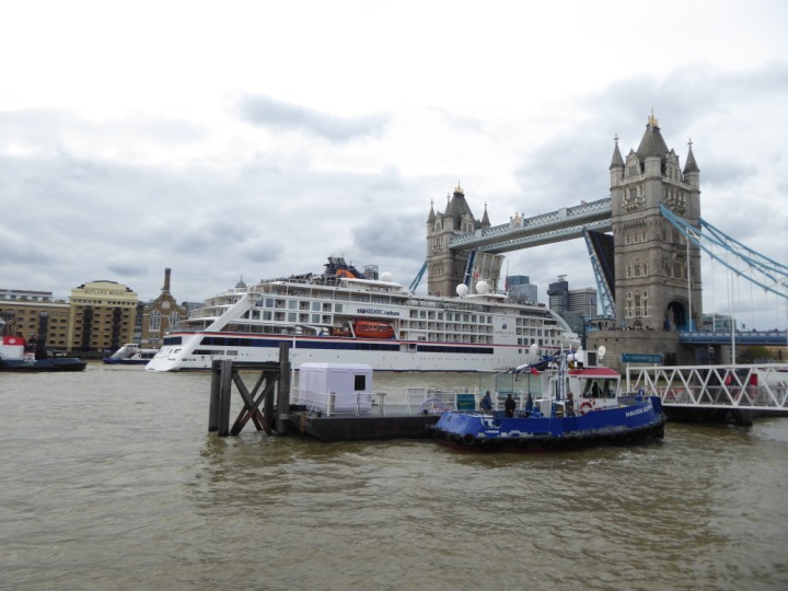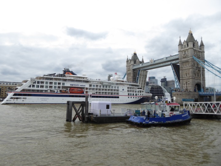 HANSEATIC NATURE romagic. 25 * *Click a Photo Above   once Big, click Right    Arrow in corner >   to start Slide Show   or Fast F/FW  > L: 138x22m (455x72ft+) Saturday 18 October 2025 Cruise Ship returns to London on a cloudy overcast lunchtime. Passing 'KISMET Mega Yacht on it's way towards  Tower Bridge lift 13:15pm and will moor alongside HMS Belfast ship  til it's departure on Sunday 19th at 13:45pm.