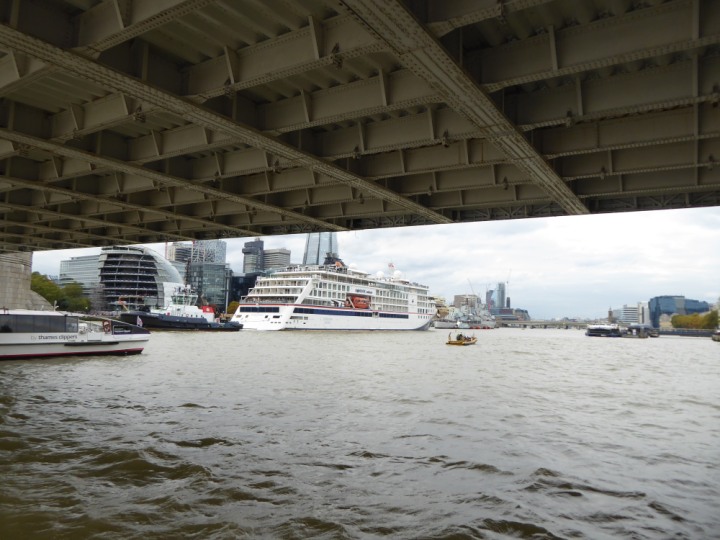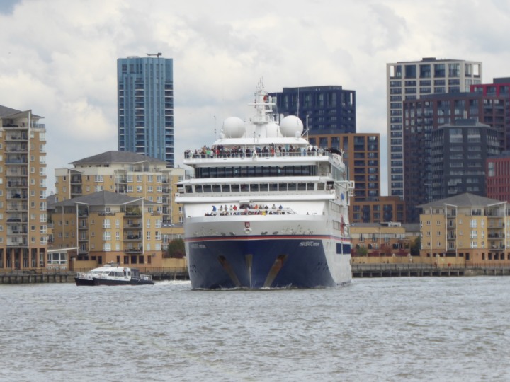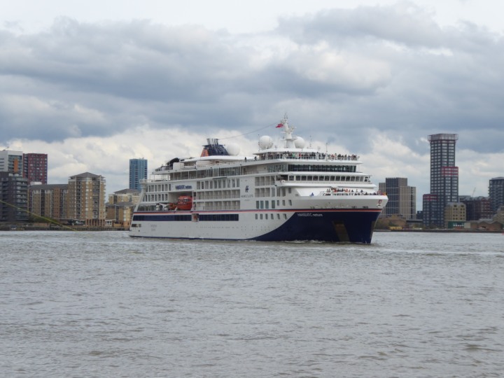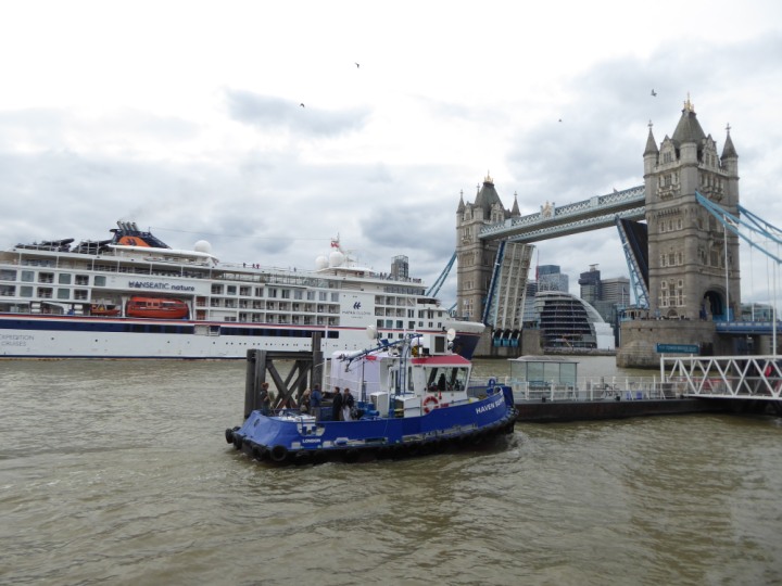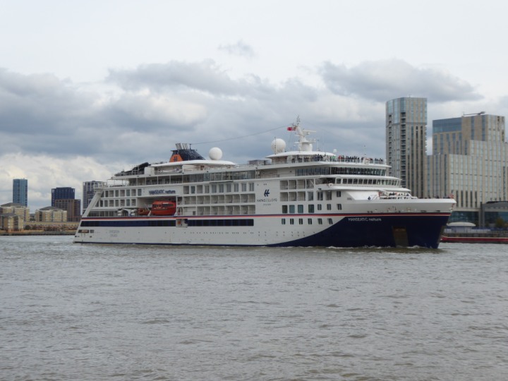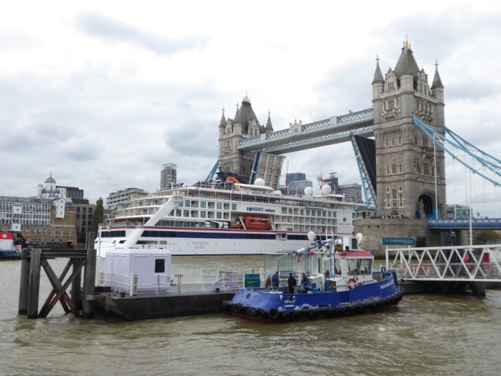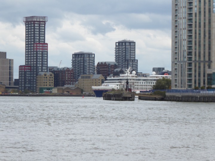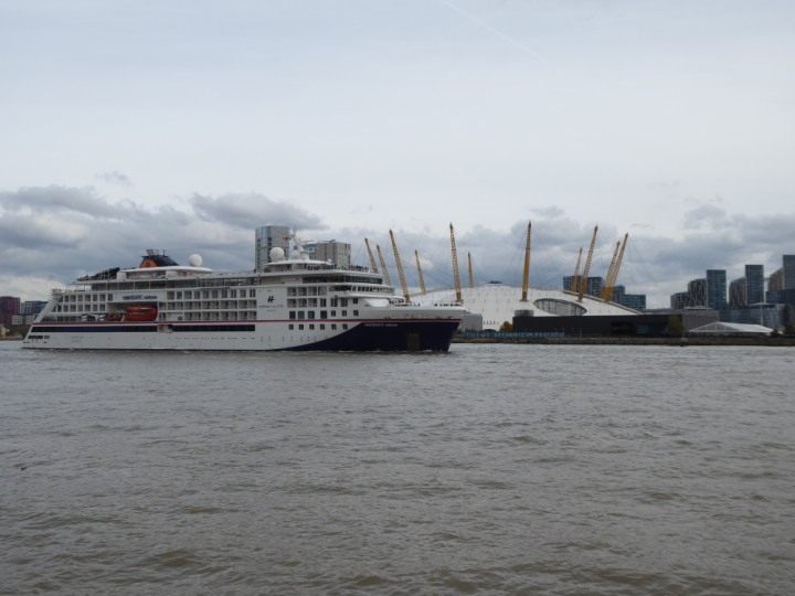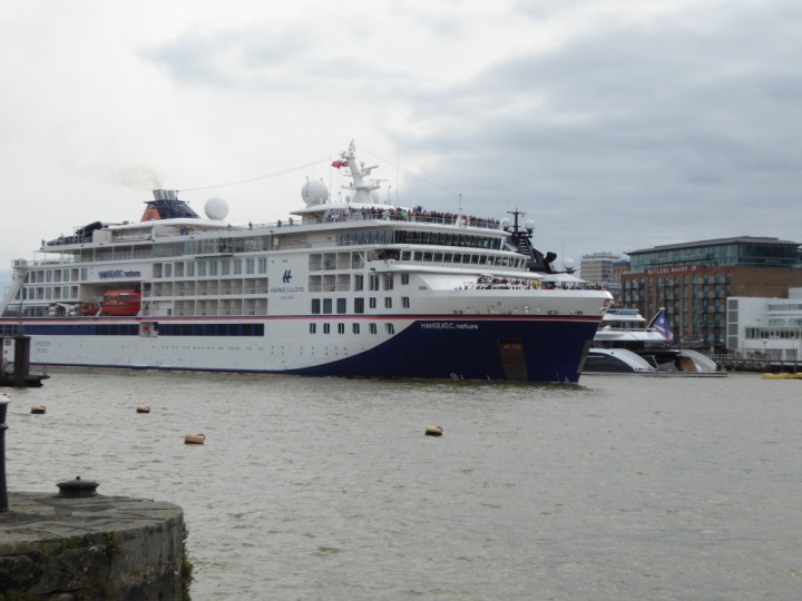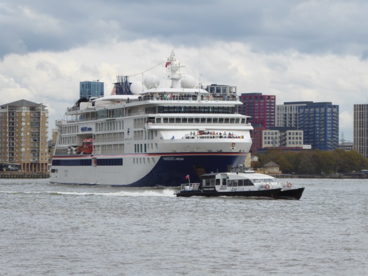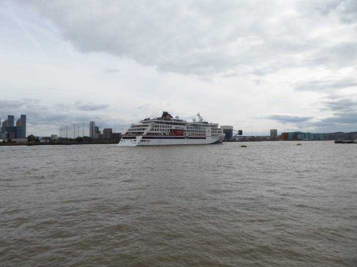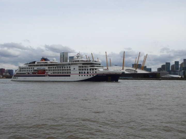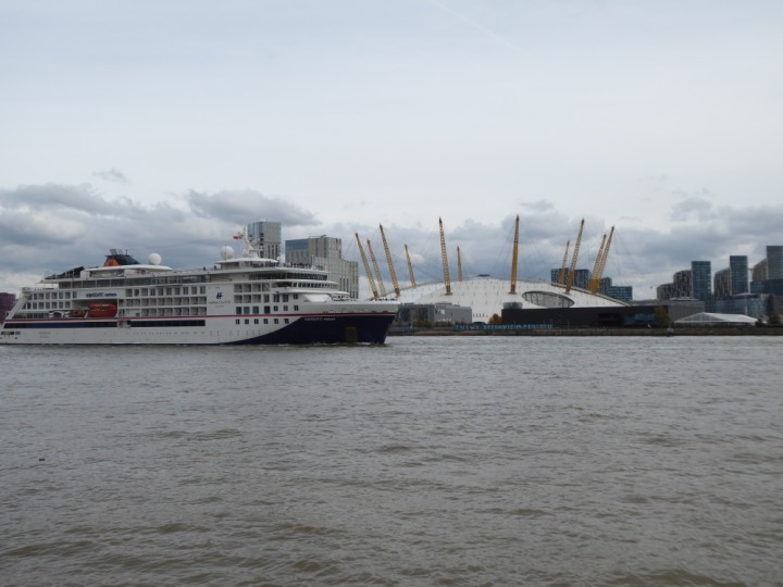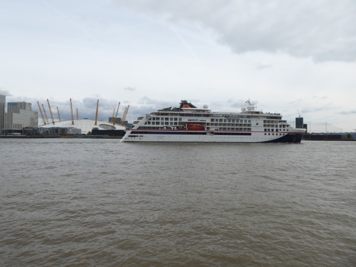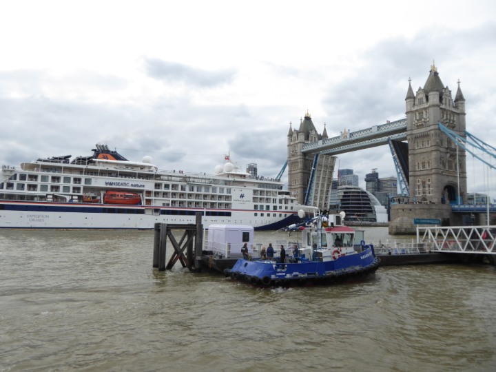 HANSEATIC NATURE romagic. 25 * *Click a Photo Above   once Big, click Right    Arrow in corner >   to start Slide Show   or Fast F/FW  > L: 138x22m (455x72ft+) Saturday 18 October 2025 Cruise Ship returns to London on a cloudy overcast lunchtime. Passing 'KISMET Mega Yacht on it's way towards  Tower Bridge lift 13:15pm and will moor alongside HMS Belfast ship  til it's departure on Sunday 19th at 13:45pm.
