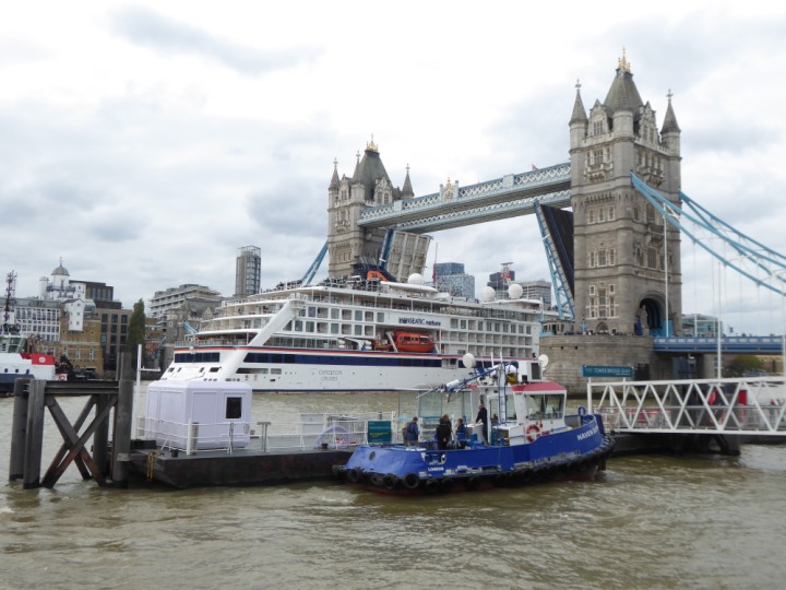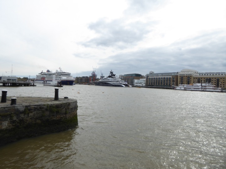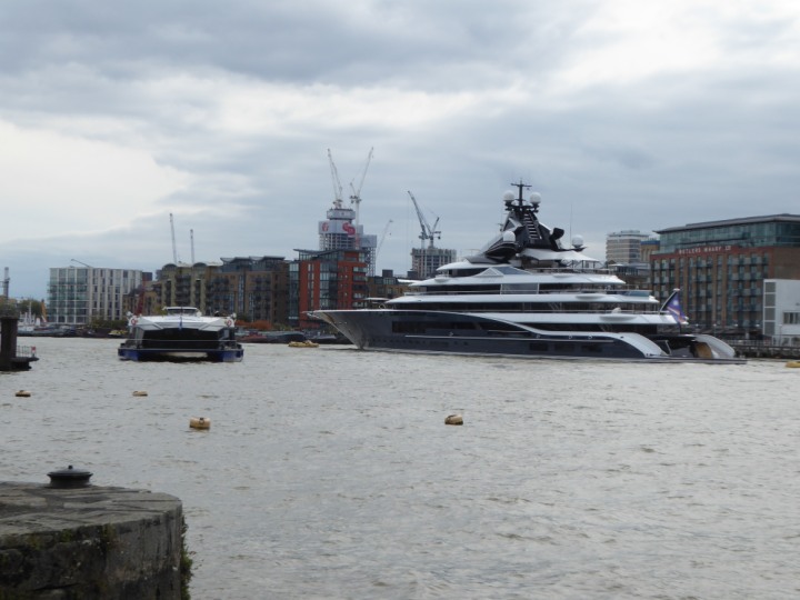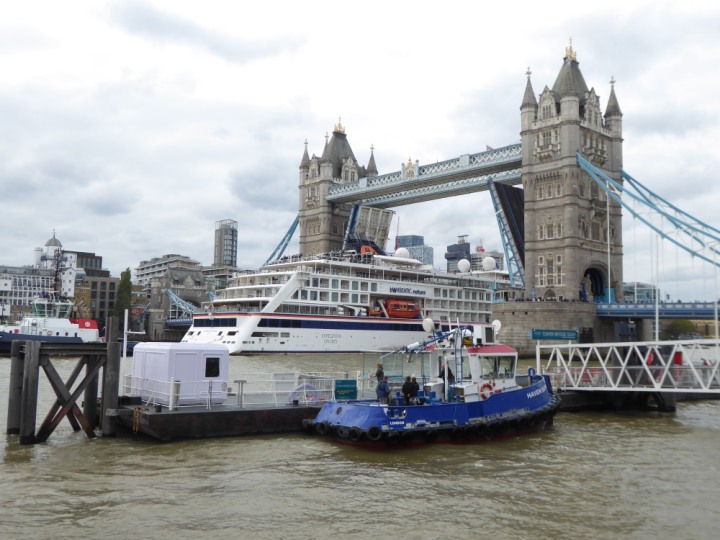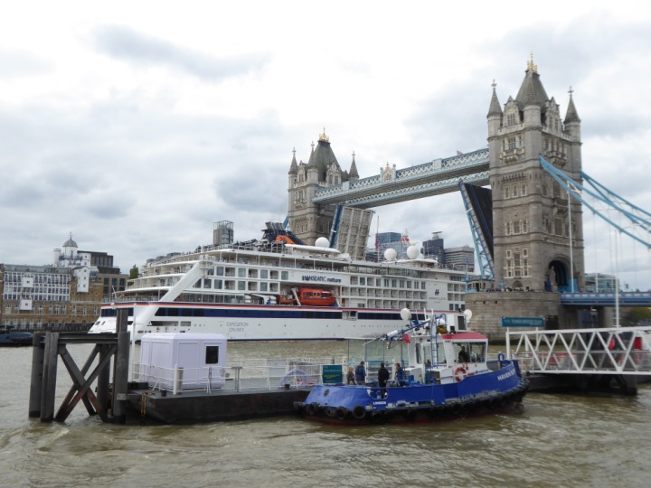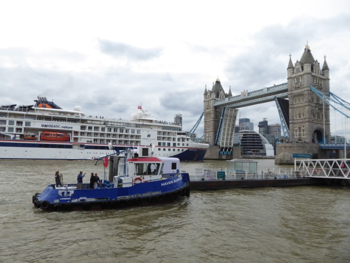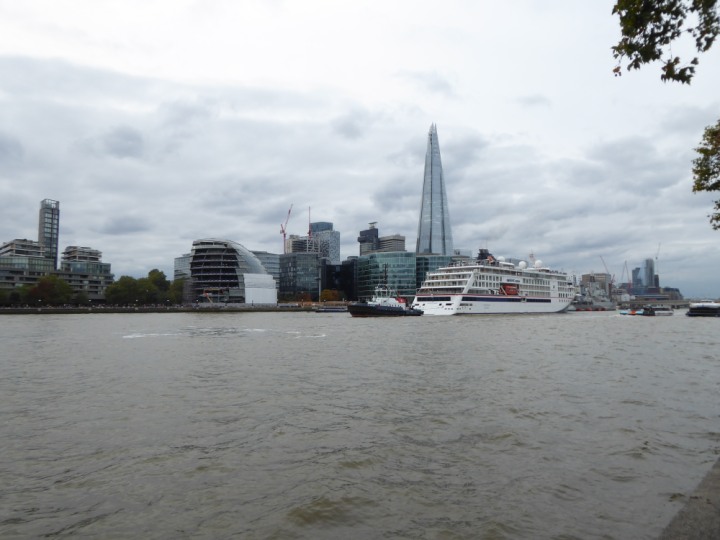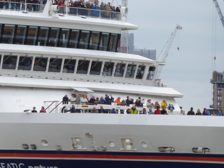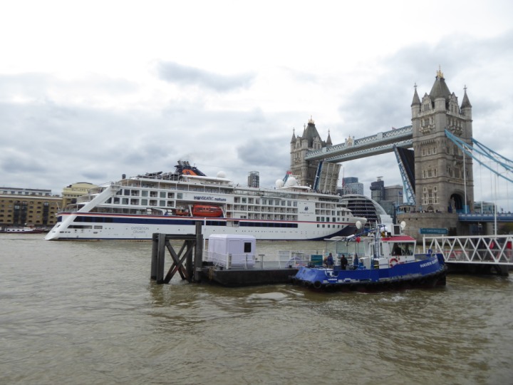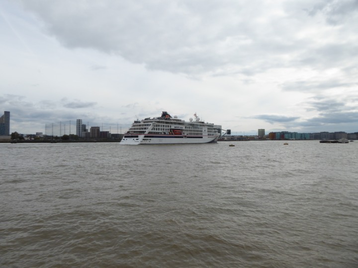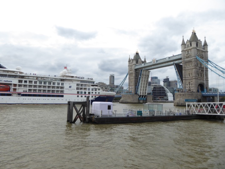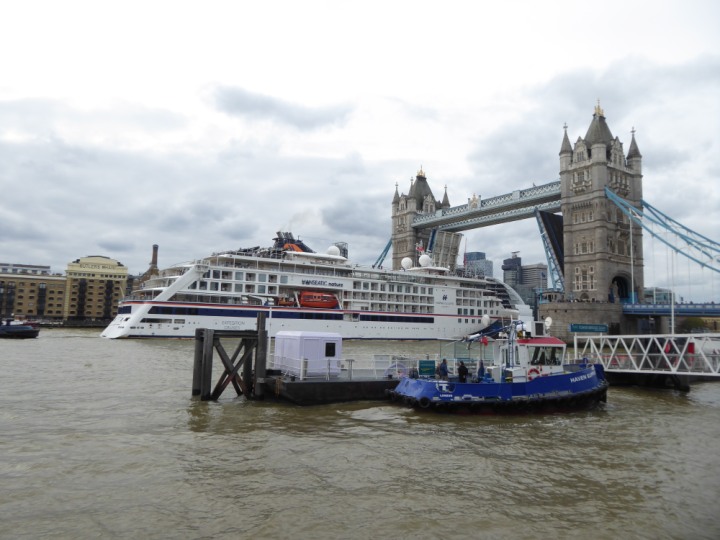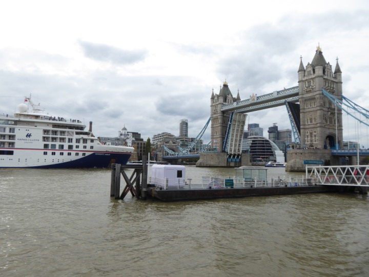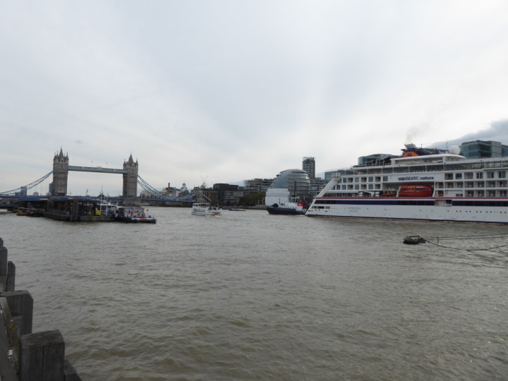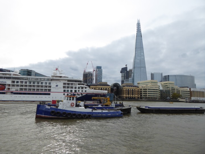 HANSEATIC NATURE romagic. 25 * *Click a Photo Above   once Big, click Right    Arrow in corner >   to start Slide Show   or Fast F/FW  > L: 138x22m (455x72ft+) Saturday 18 October 2025 Cruise Ship returns to London on a cloudy overcast lunchtime. Passing 'KISMET Mega Yacht on it's way towards  Tower Bridge lift 13:15pm and will moor alongside HMS Belfast ship  til it's departure on Sunday 19th at 13:45pm.
