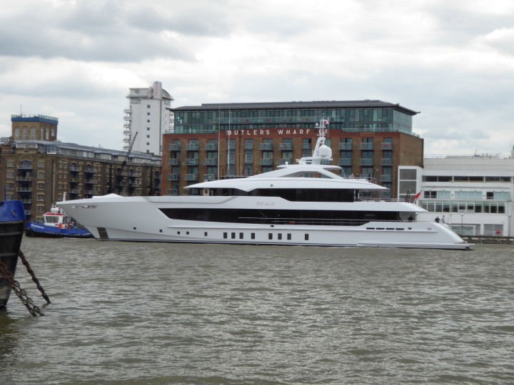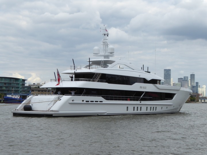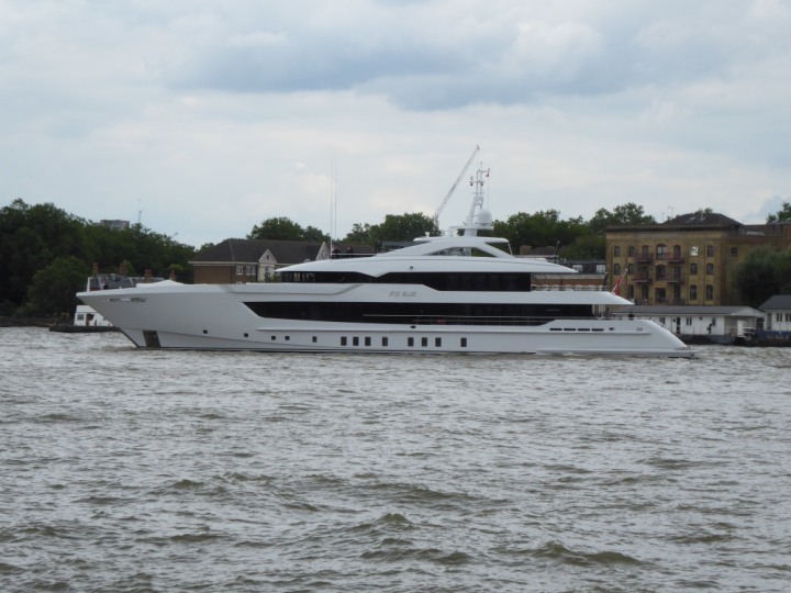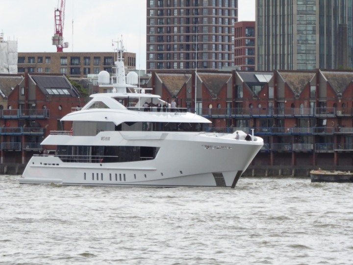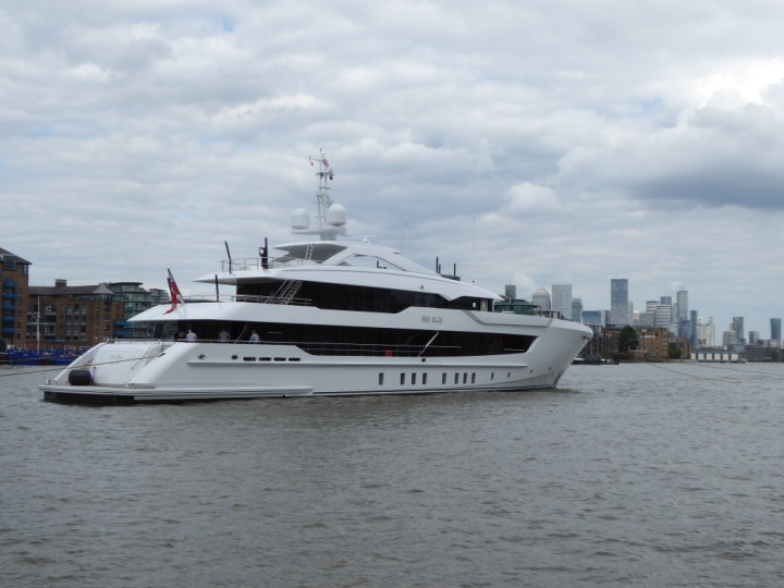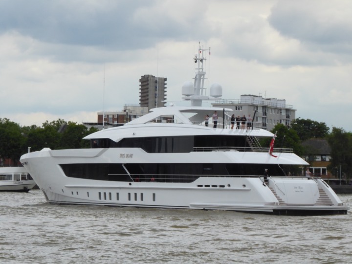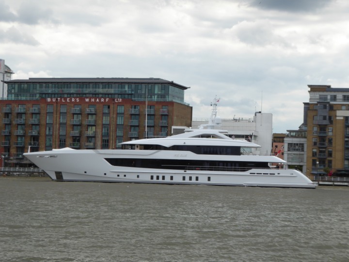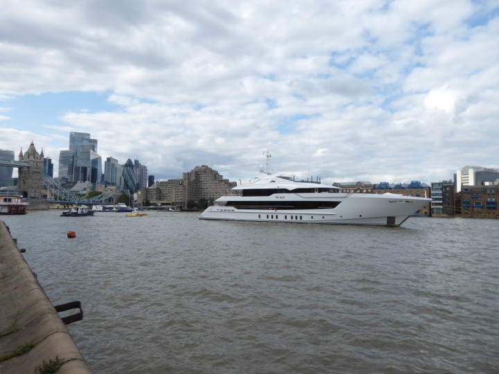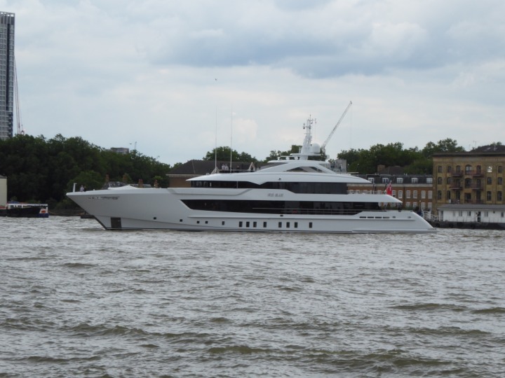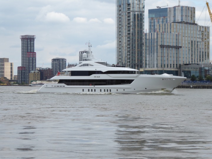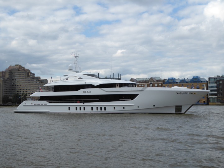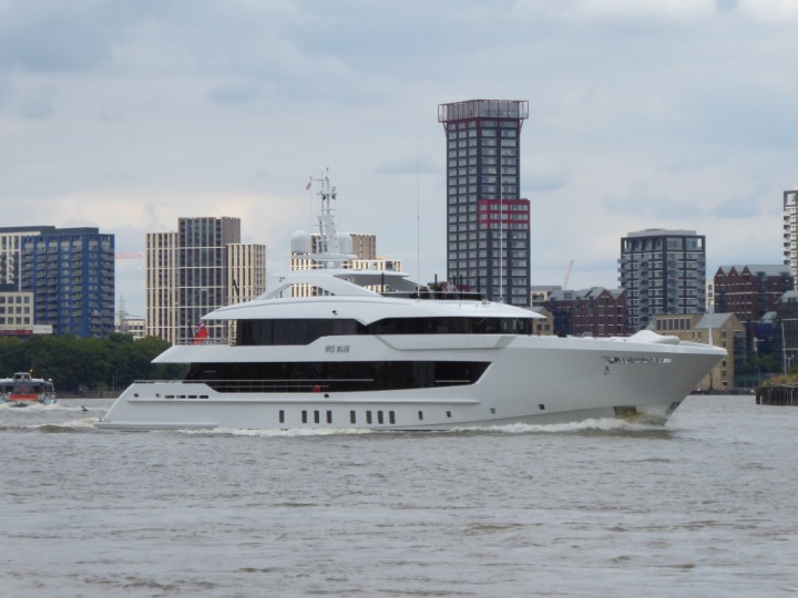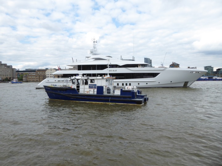 IRIS BLUE romagic. 24 * *Click a Photo Above   once Big, click Right    Arrow in corner >   to start Slide Show   or Fast F/FW  > L:55x10m (180x31ft+) Tuesday 23 July 2024 Brand New Super Yacht February this year the owner took possession of this 55 meter yacht. A warm overcast afternoon just before Tower Bridge the Yacht was turned round and  reversed back to moor near Butlers Wharf at 4pm.