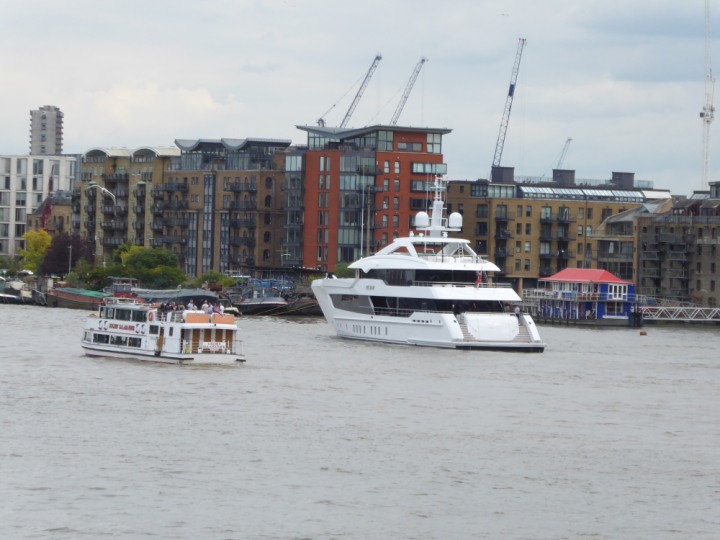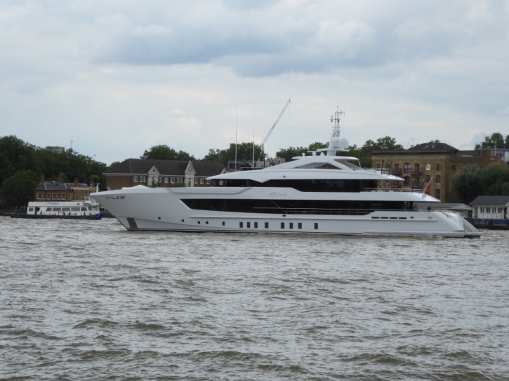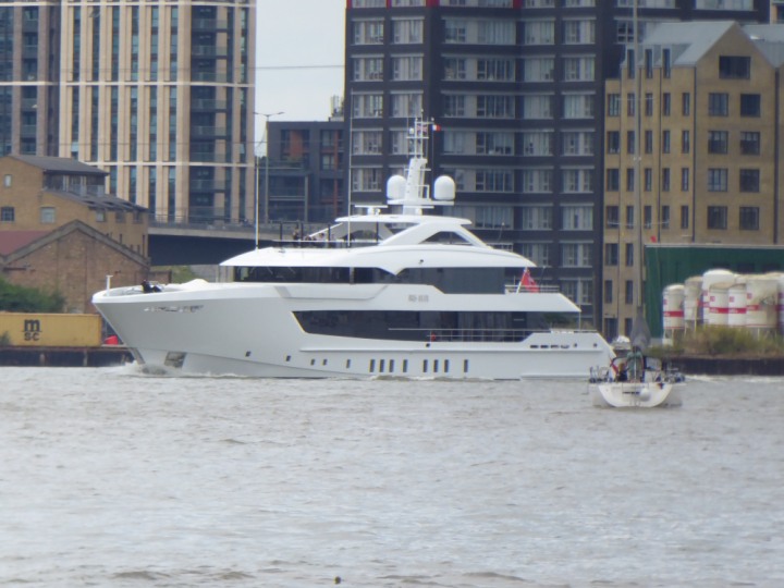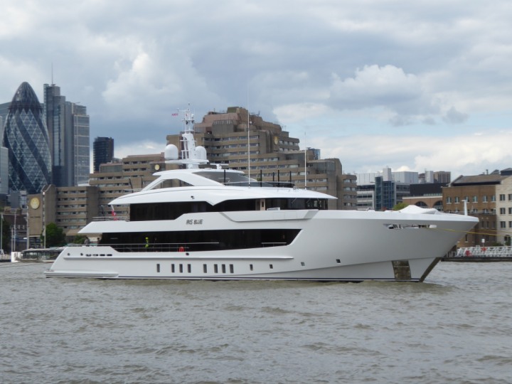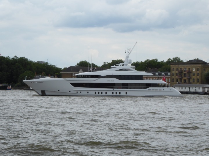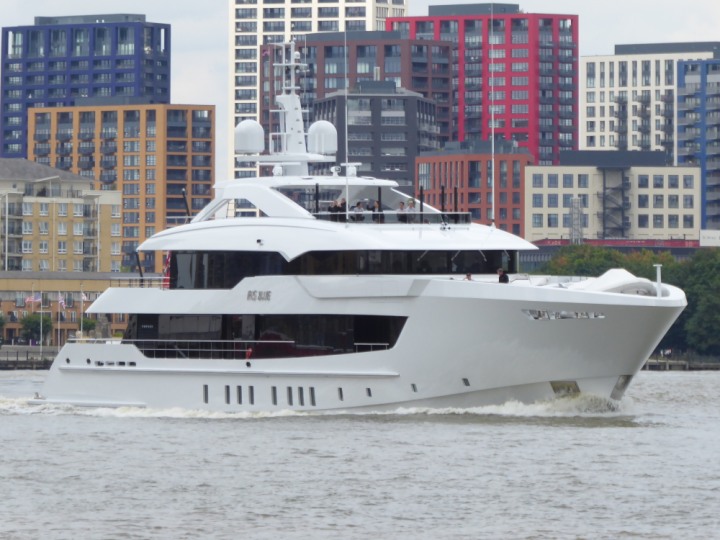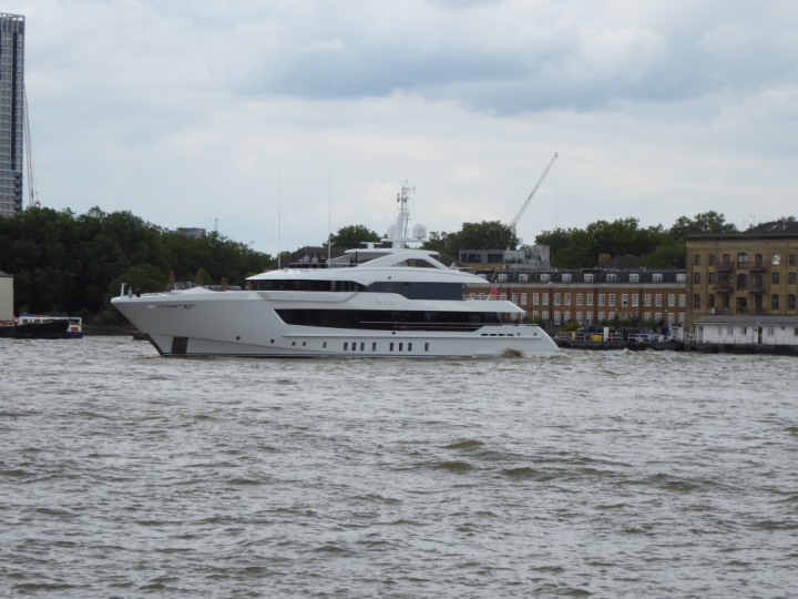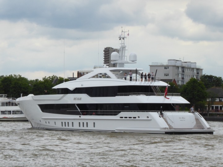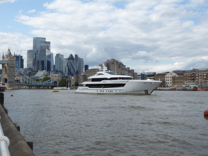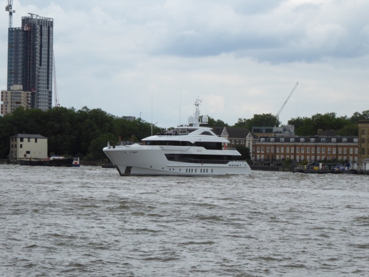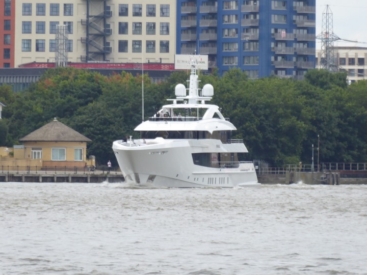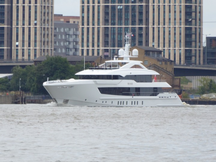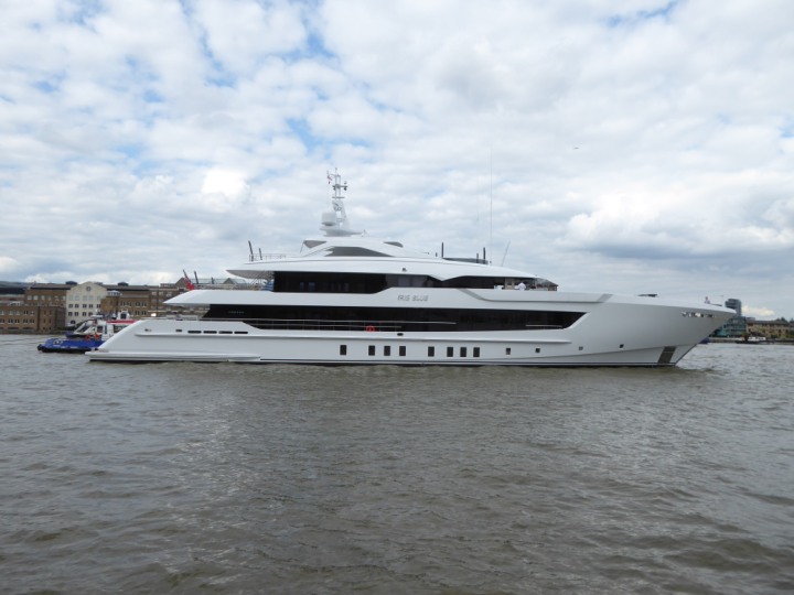 IRIS BLUE romagic. 24 * *Click a Photo Above   once Big, click Right    Arrow in corner >   to start Slide Show   or Fast F/FW  > L:55x10m (180x31ft+) Tuesday 23 July 2024 Brand New Super Yacht February this year the owner took possession of this 55 meter yacht. A warm overcast afternoon just before Tower Bridge the Yacht was turned round and  reversed back to moor near Butlers Wharf at 4pm.