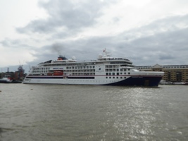 L: 138x22m (455x72ft+) Saturday 18 October 2025 Cruise Ship returns to London on a cloudy overcast lunchtime. Passing 'KISMET Mega Yacht on it's way towards  Tower Bridge lift 13:15pm and will moor alongside HMS Belfast ship  til it's departure on Sunday 19th at 13:45pm.