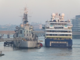 Thursday 1st May 2025 Cruise ship arrives 5am (yes, I was up this early..) Going up to Tower Bridge mooring alongside the HMS BELFAST WWII ship, and leaving later 16:30 romagic. 25m