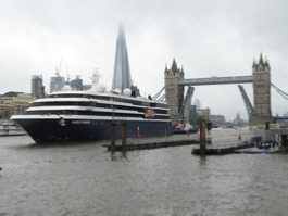 Butlers Wharf  T.B WORLD VOYAGER romagic. 24m L:119.88 x18m (393 x59ft+) Tuesday 1st October 2024 Cruise ship back in London 11:05am at the 02 Dome, with two tugs that later will turn the ship round further up river and guide it backwards through  Tower Bridge 11:45am. Departing Thursday 3rd Oct. Weather overcast with rain showers, which got heavier when the ship reached Tower Bridge, needless to say I didn't stay too long and only took these photos in the rain.