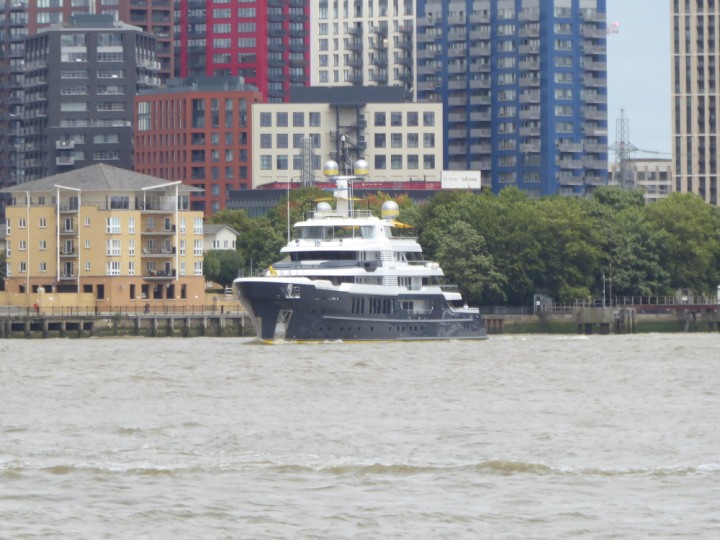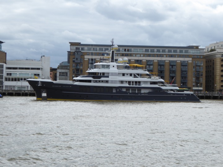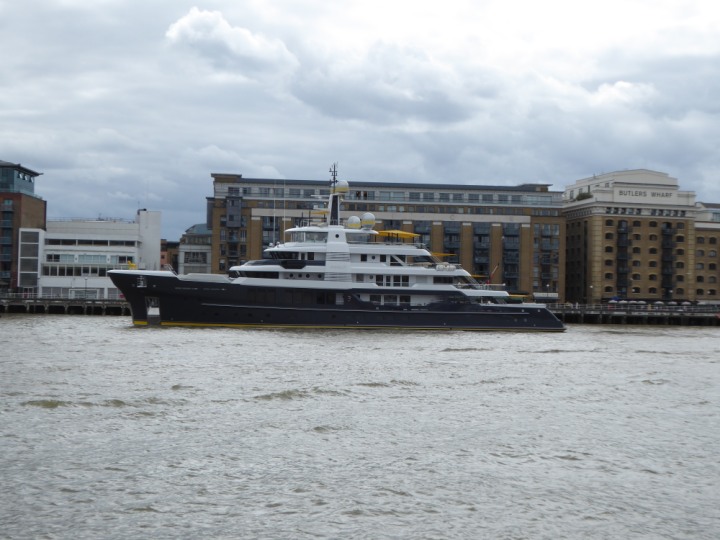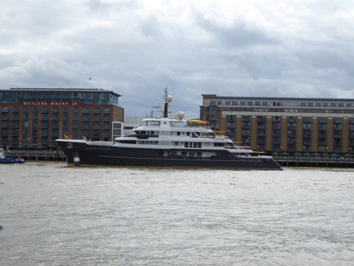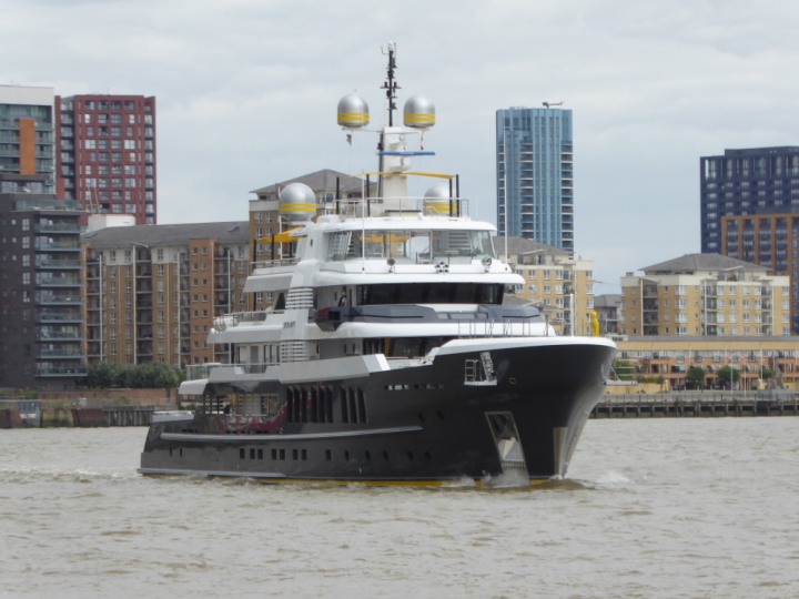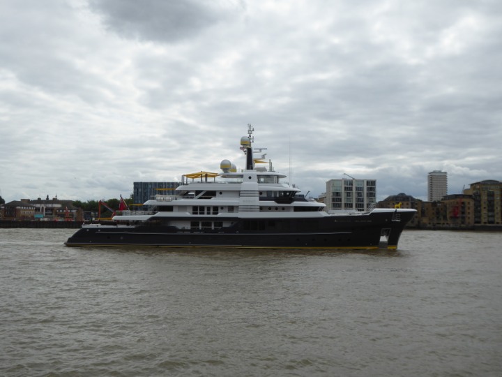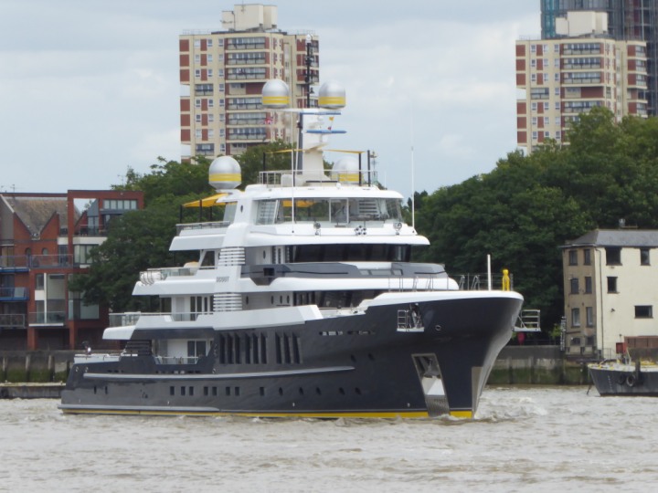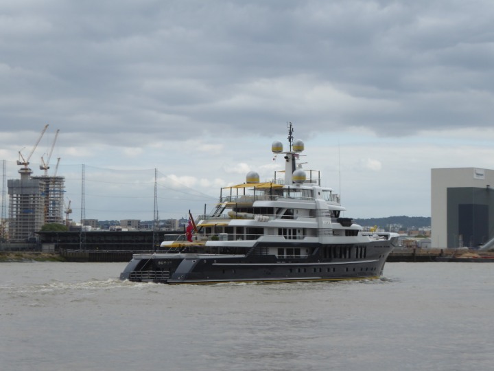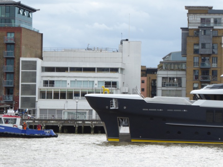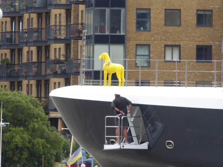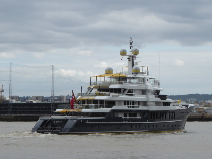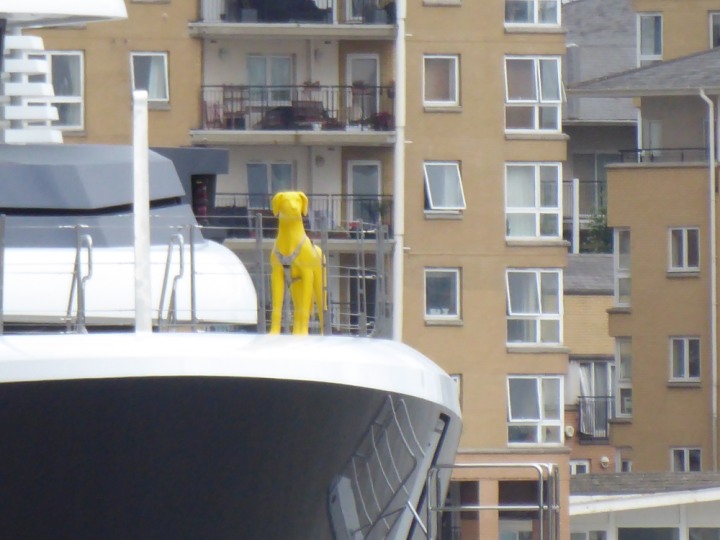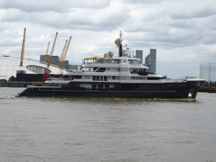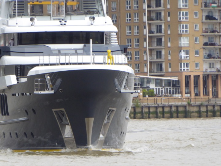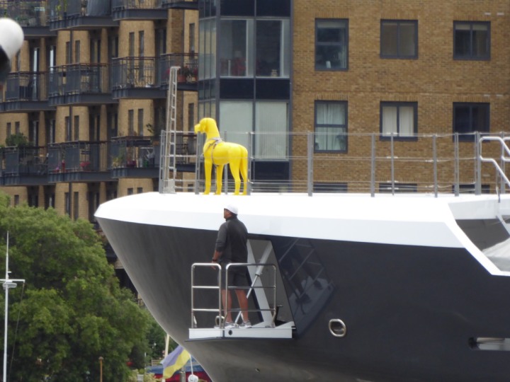 SCOUT .24 romagic. 24 * *Click a Photo Above   once Big, click Right    Arrow in corner >   to start Slide Show   or Fast F/FW  > L:64x12m (209x39ft+) Wednesday 7th August 2024 Super Yacht returns to London Scout' the Big yellow Dog still on the front (bow) of the yacht as it moves up the River Thames to Tower Bridge, mooring close to Butler's Wharf at 3pm. Last here 30 July- 16 Aug 2023