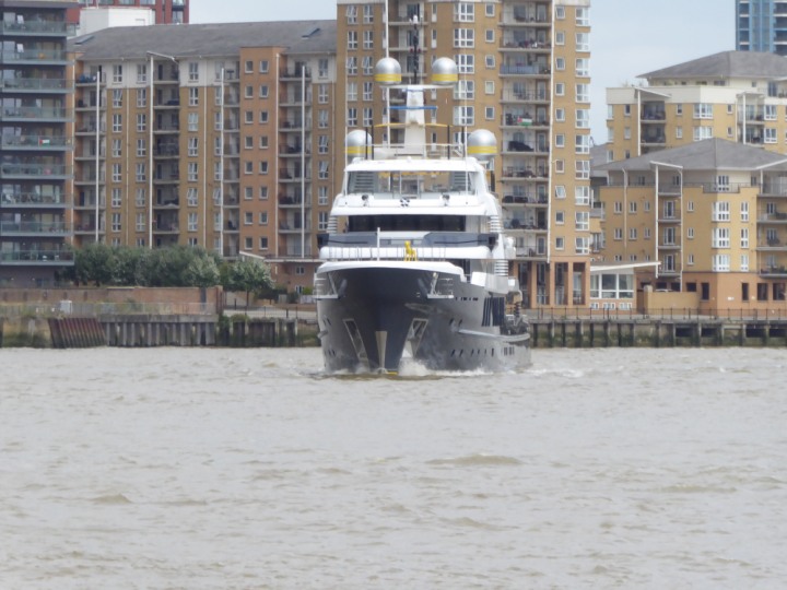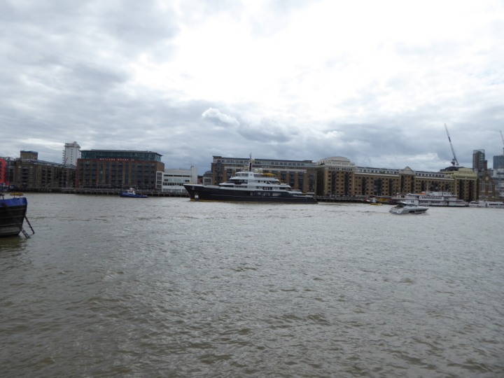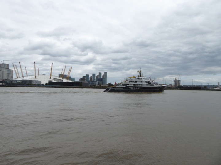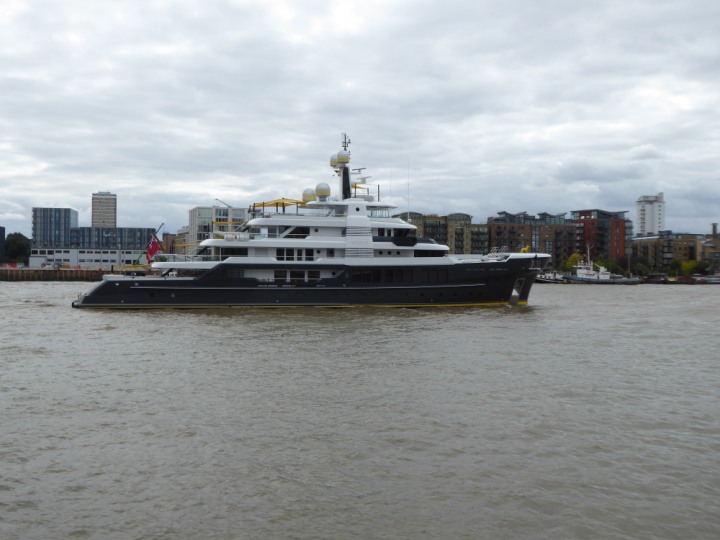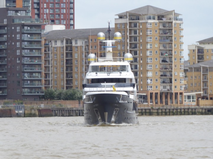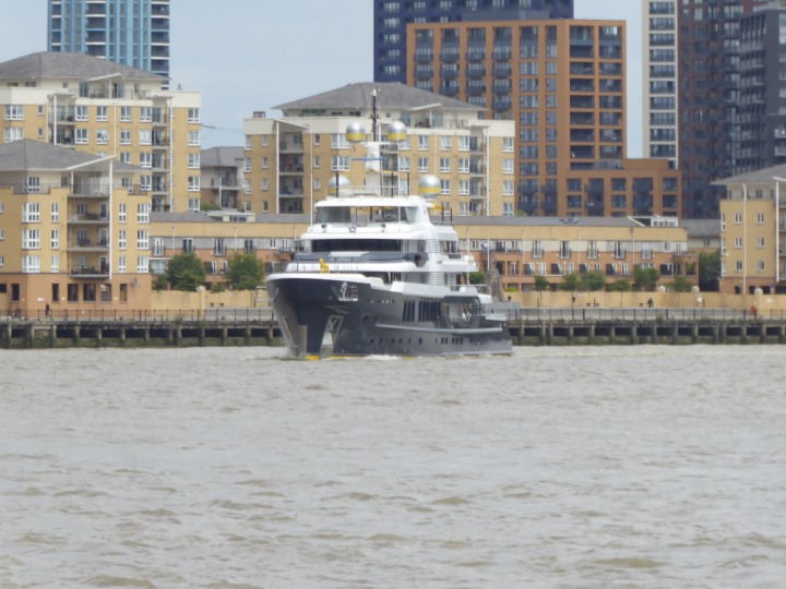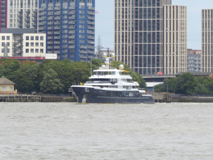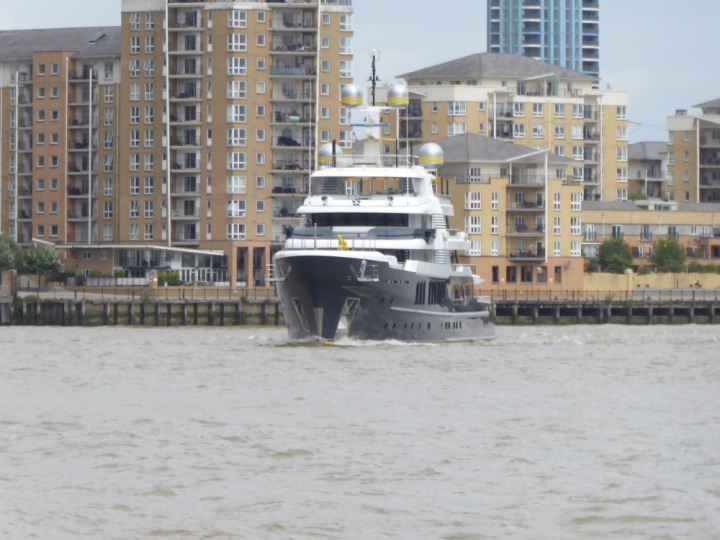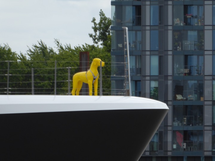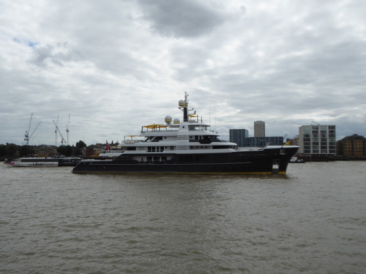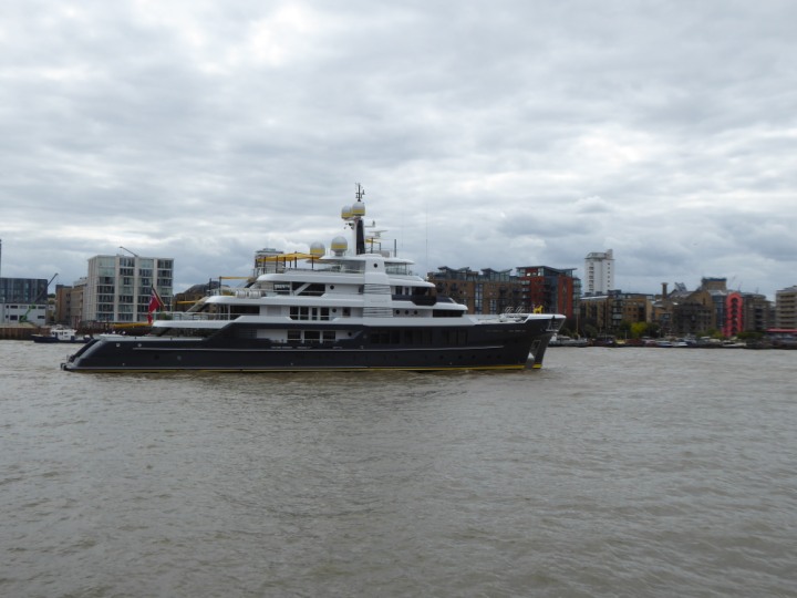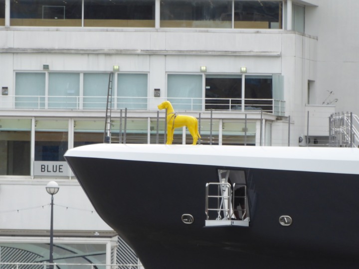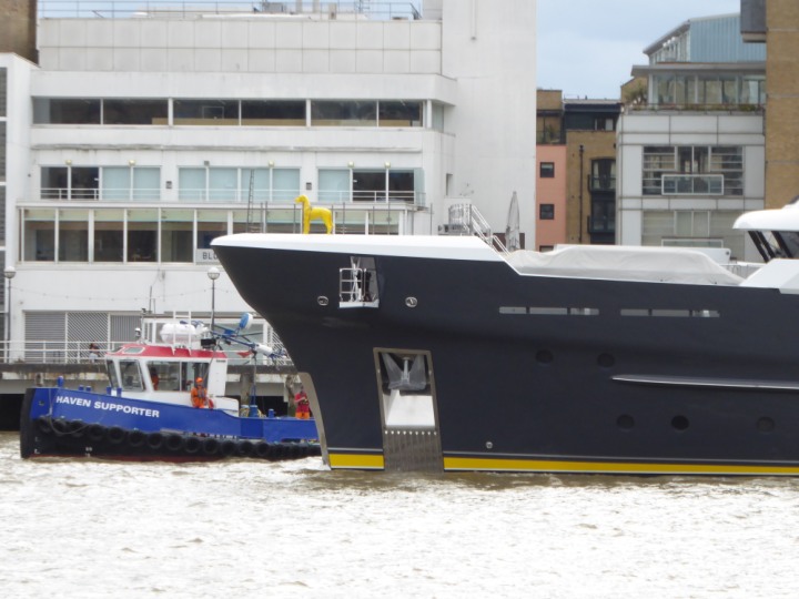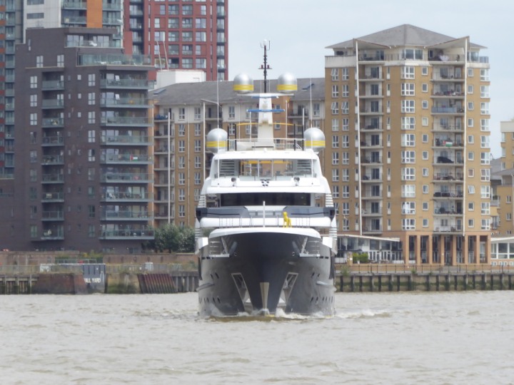 SCOUT .24 romagic. 24 * *Click a Photo Above   once Big, click Right    Arrow in corner >   to start Slide Show   or Fast F/FW  > L:64x12m (209x39ft+) Wednesday 7th August 2024 Super Yacht returns to London Scout' the Big yellow Dog still on the front (bow) of the yacht as it moves up the River Thames to Tower Bridge, mooring close to Butler's Wharf at 3pm. Last here 30 July- 16 Aug 2023