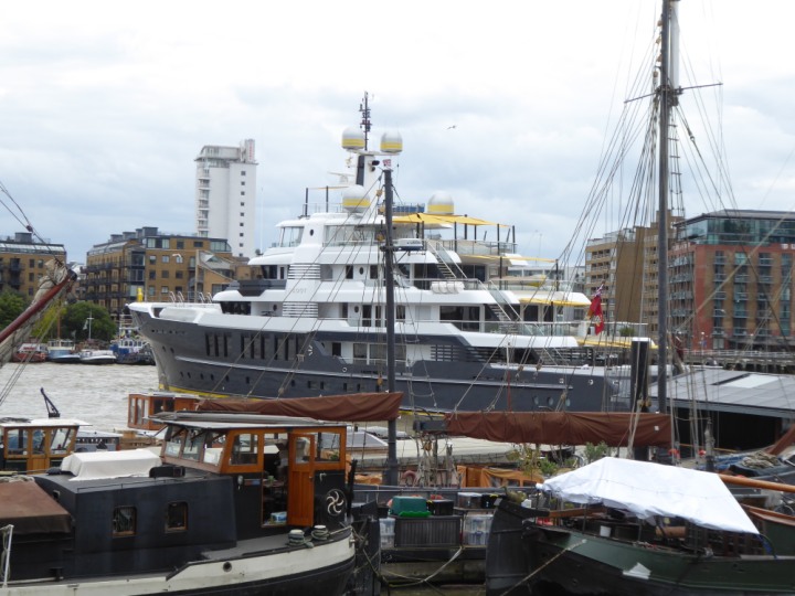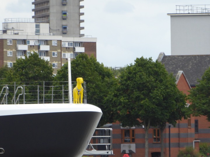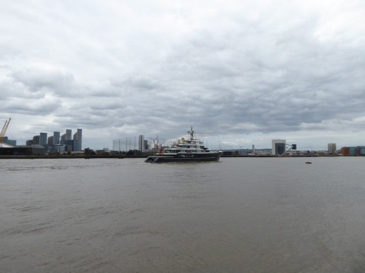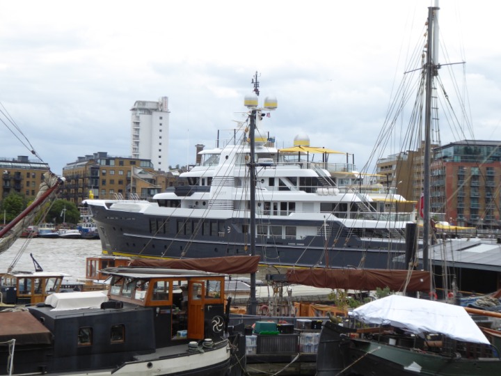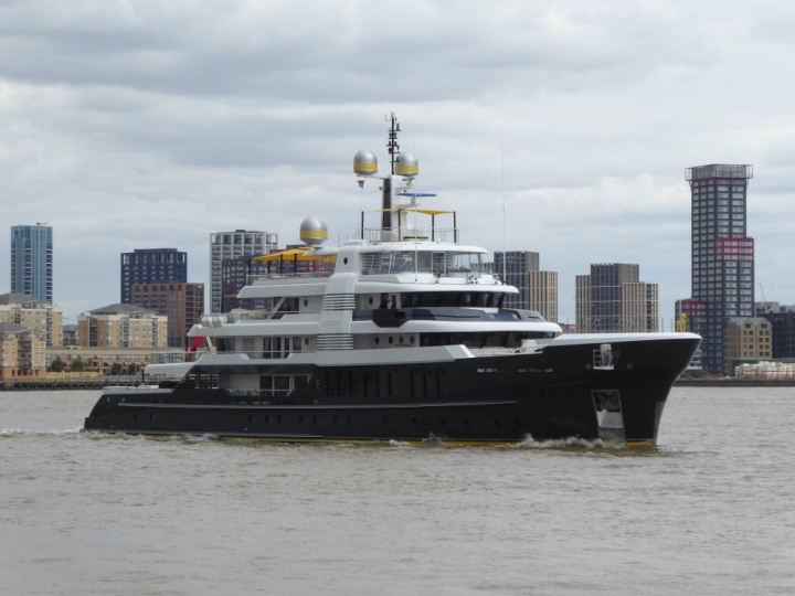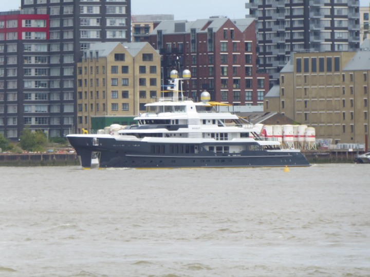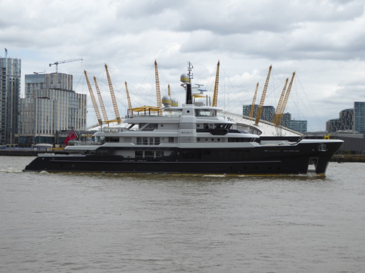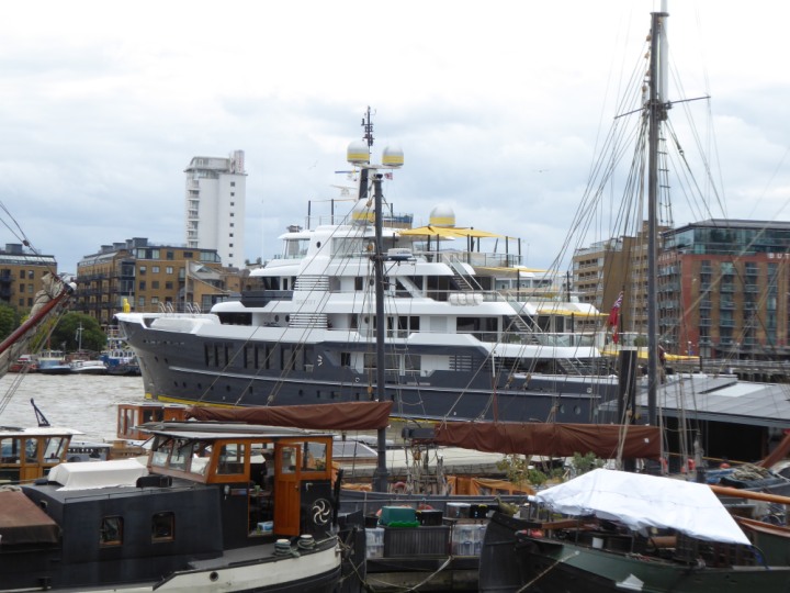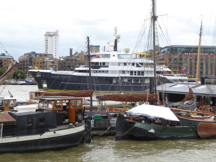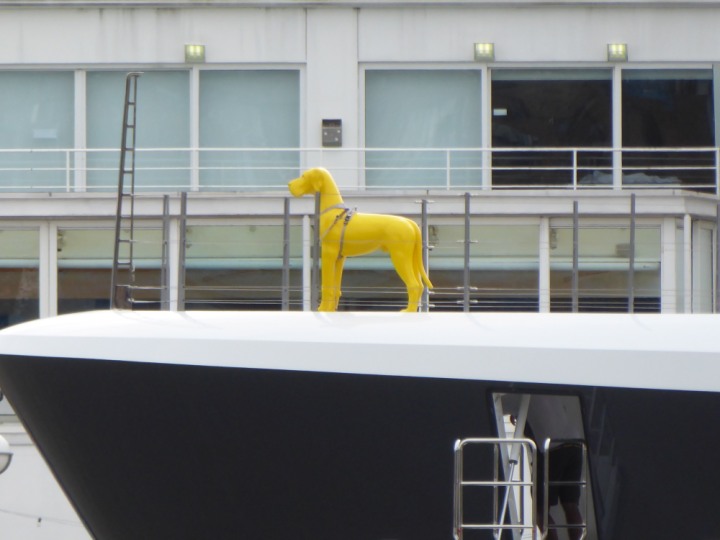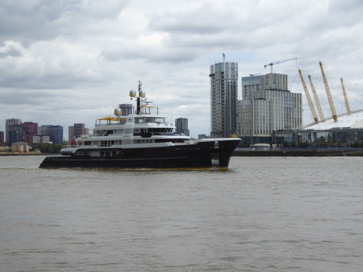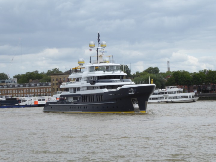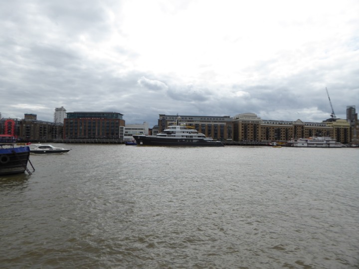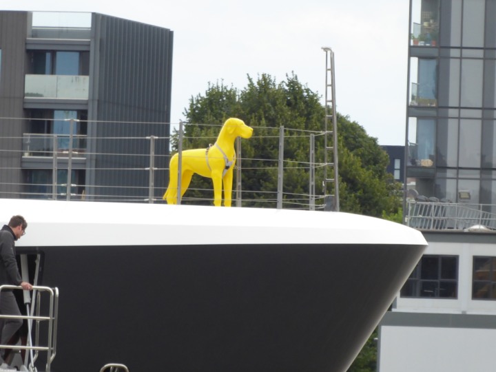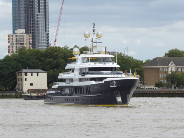 SCOUT .24 romagic. 24 * *Click a Photo Above   once Big, click Right    Arrow in corner >   to start Slide Show   or Fast F/FW  > L:64x12m (209x39ft+) Wednesday 7th August 2024 Super Yacht returns to London Scout' the Big yellow Dog still on the front (bow) of the yacht as it moves up the River Thames to Tower Bridge, mooring close to Butler's Wharf at 3pm. Last here 30 July- 16 Aug 2023