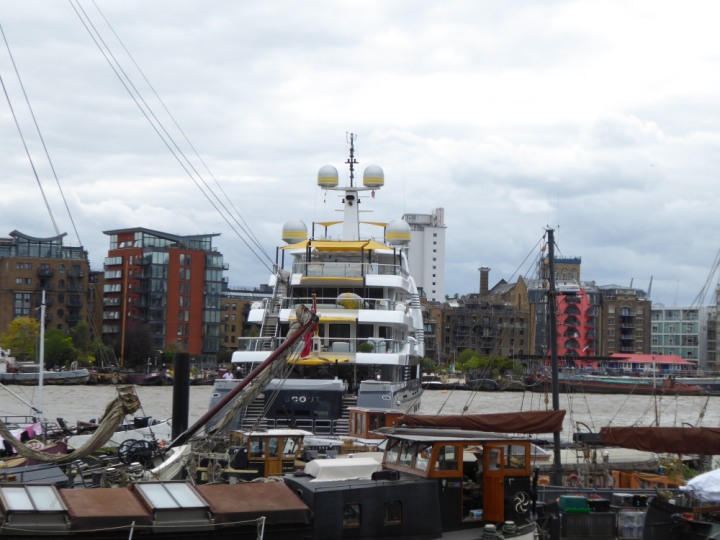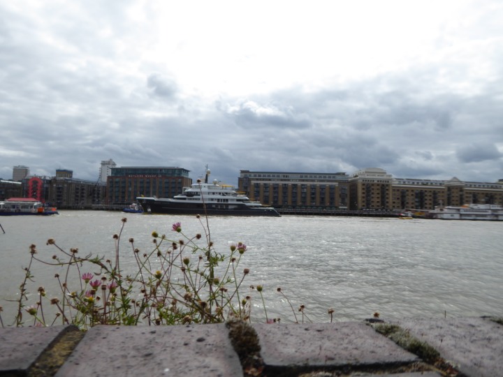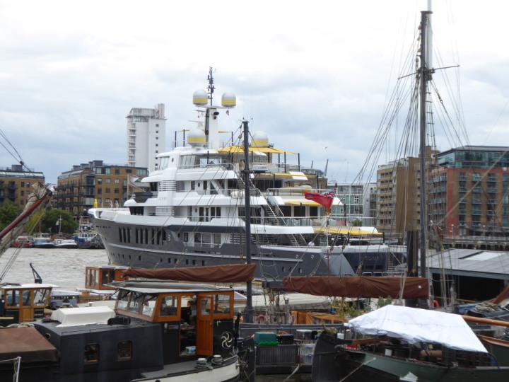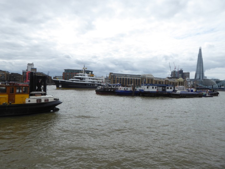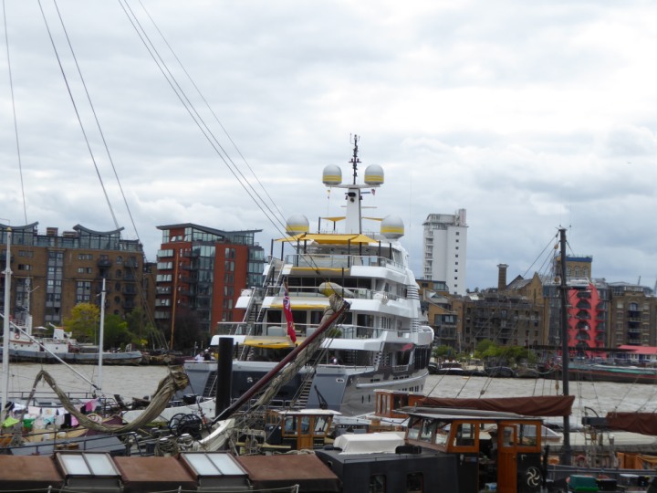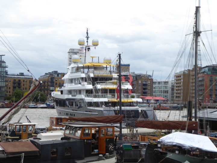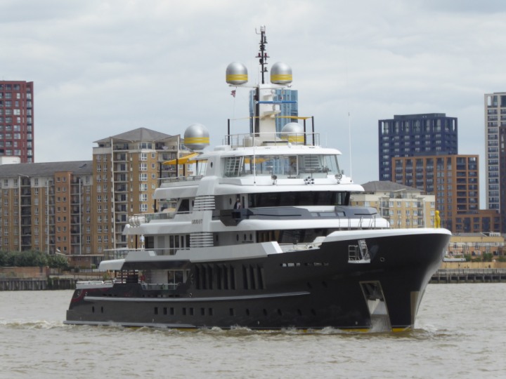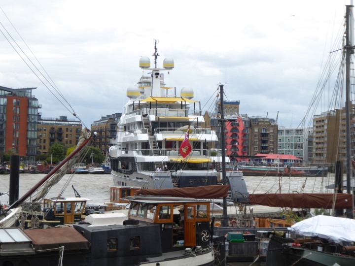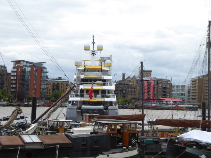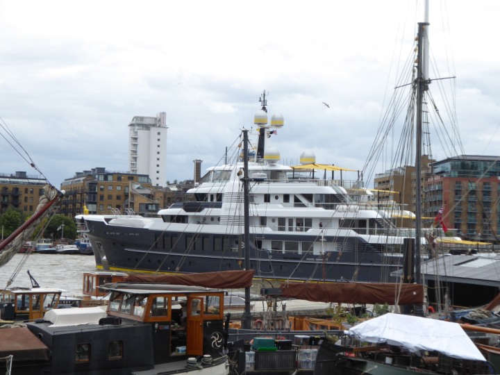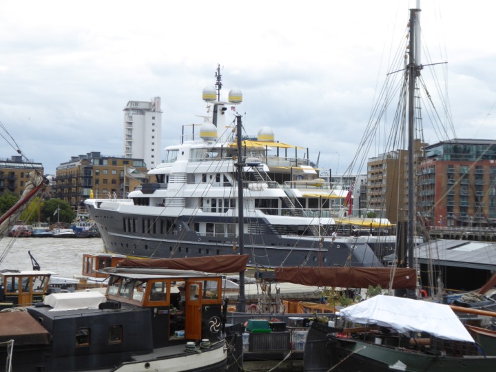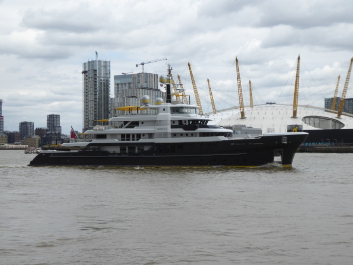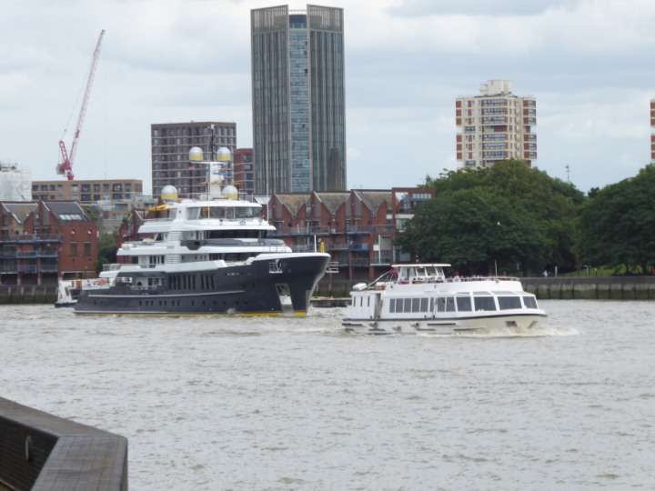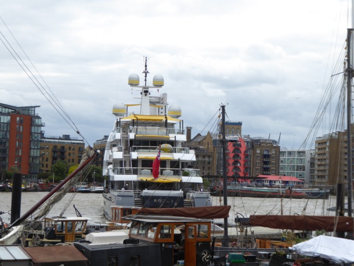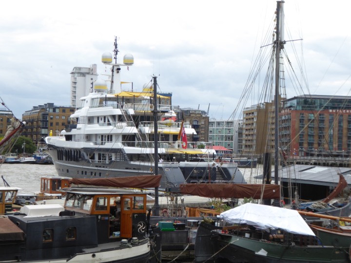SCOUT .24 romagic. 24 * *Click a Photo Above   once Big, click Right    Arrow in corner >   to start Slide Show   or Fast F/FW  > L:64x12m (209x39ft+) Wednesday 7th August 2024 Super Yacht returns to London Scout' the Big yellow Dog still on the front (bow) of the yacht as it moves up the River Thames to Tower Bridge, mooring close to Butler's Wharf at 3pm. Last here 30 July- 16 Aug 2023