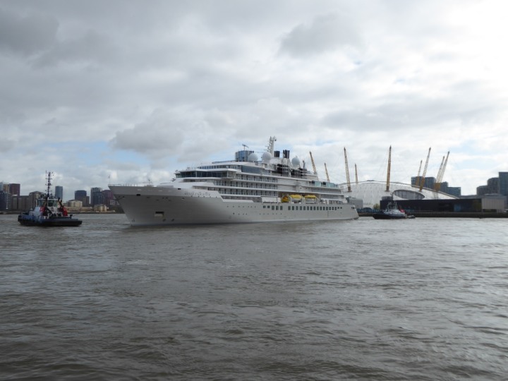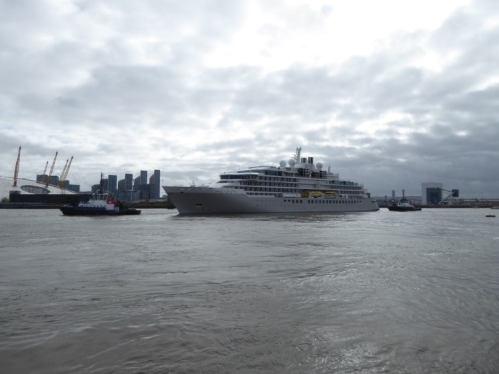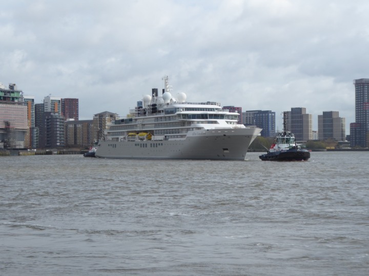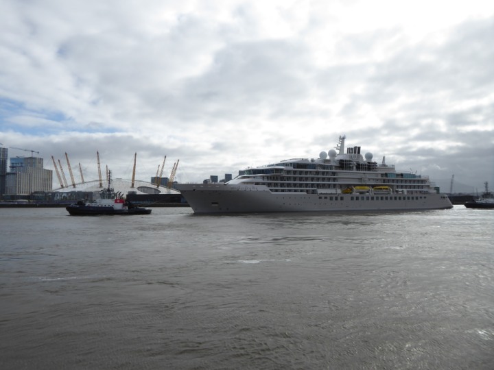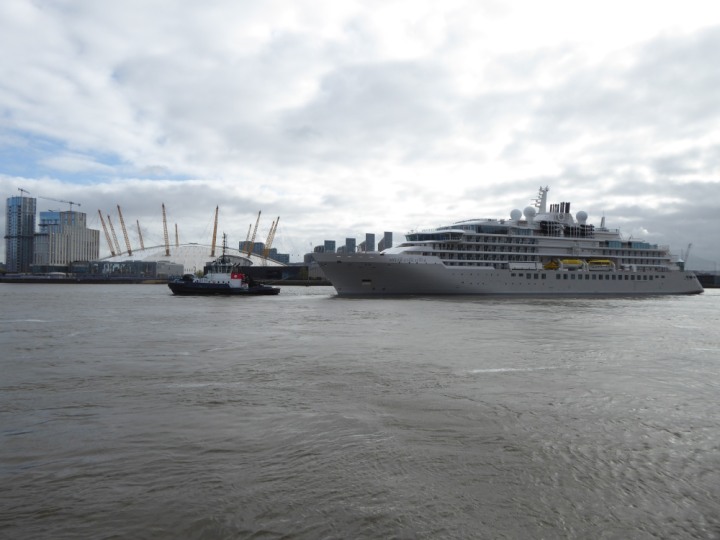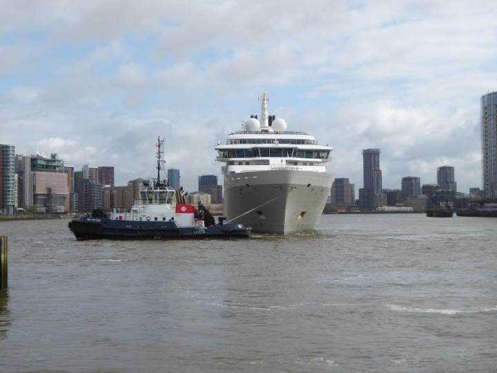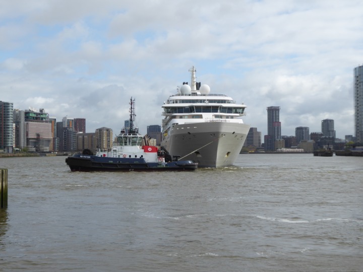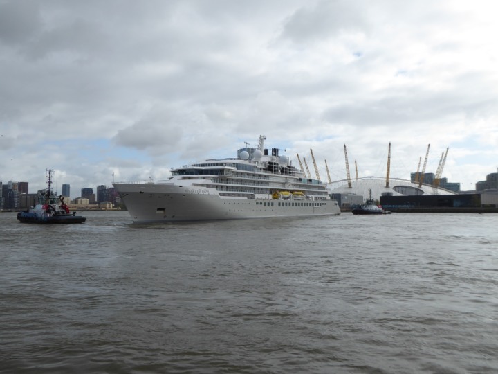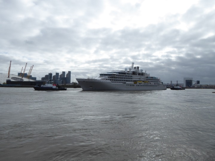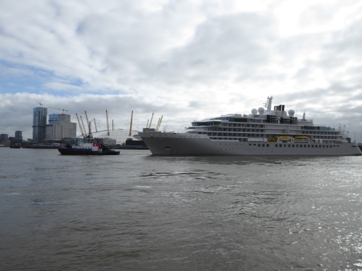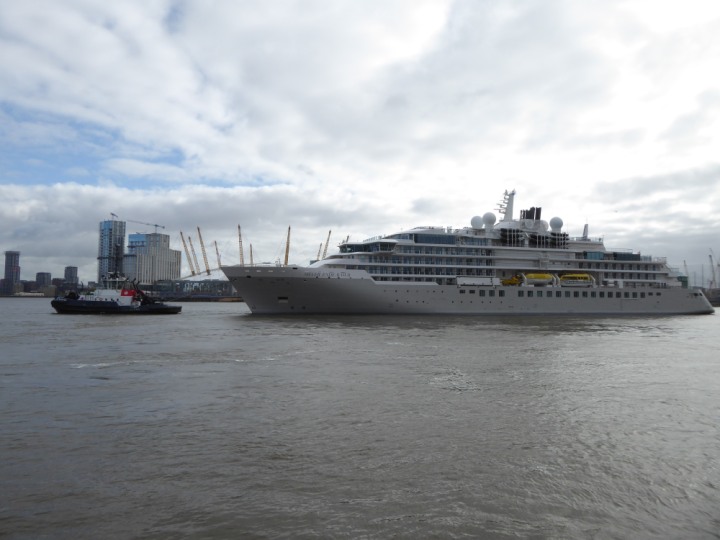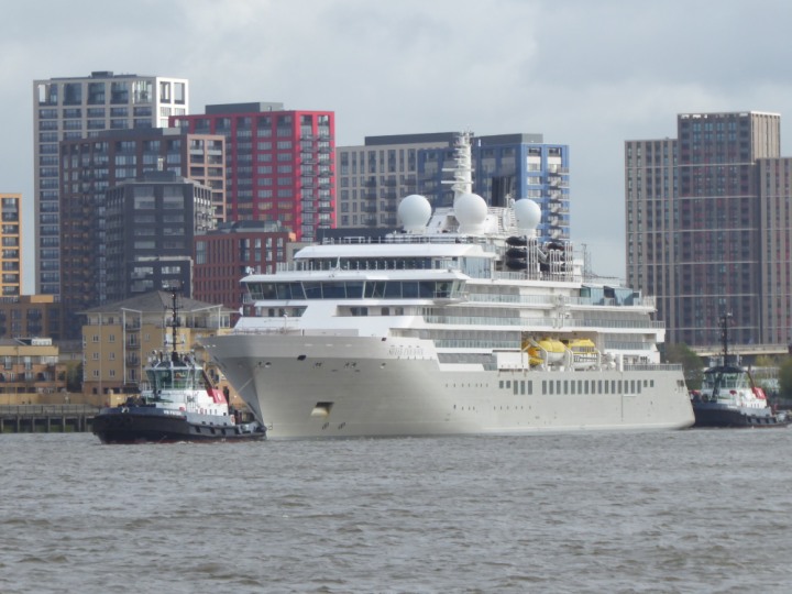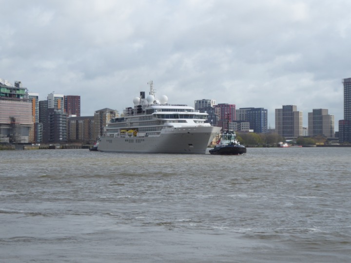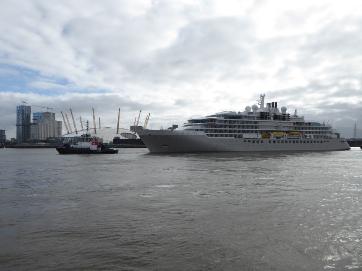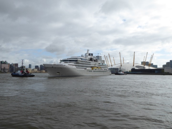 SILVER ENDEAVOUR * romagic. 24 *Click a Photo Above   once Big, click Right    Arrow in corner >   to start Slide Show   or Fast F/FW  > L:164x28.4m (538x93ft+) SILVER ENDEAVOUR Friday 05 April  08:30am The First Super Yacht to visit London 2024 Two Tugs spun the ship around at the 02 Dome to reverse back to the Greenwich Tier Terminal. Departure: Sunday 7th at 13:00