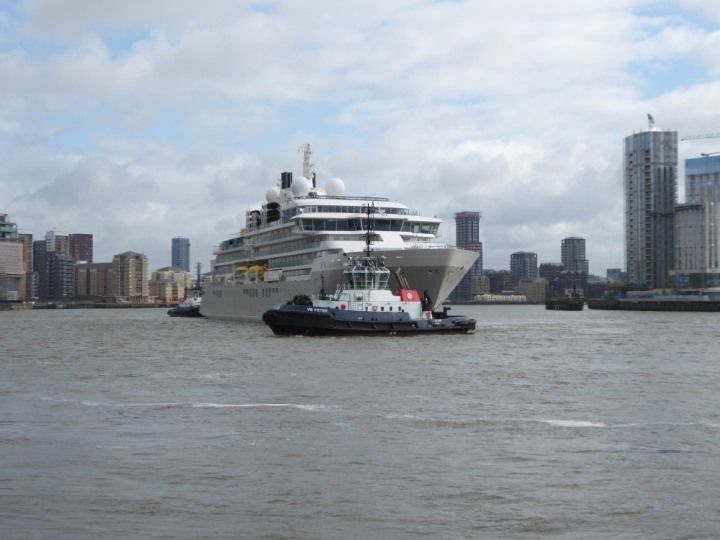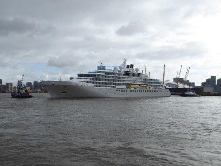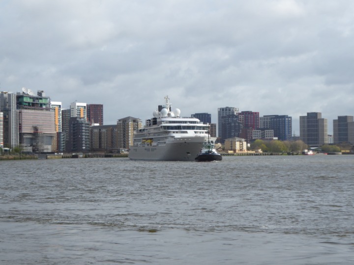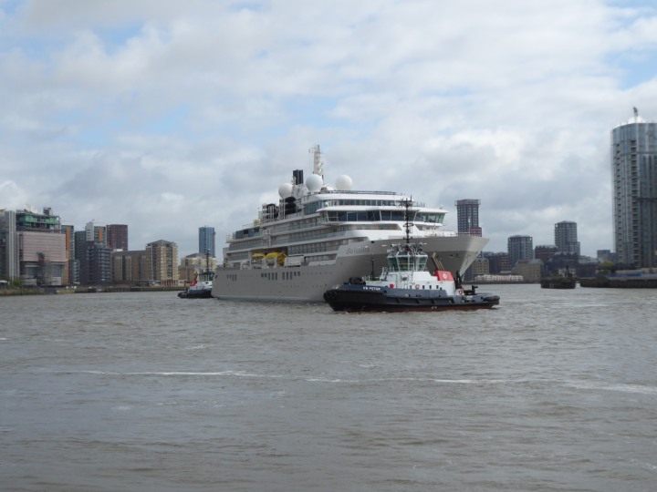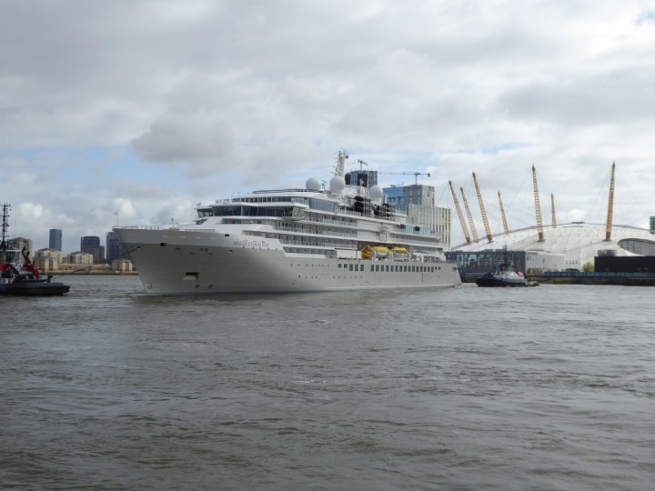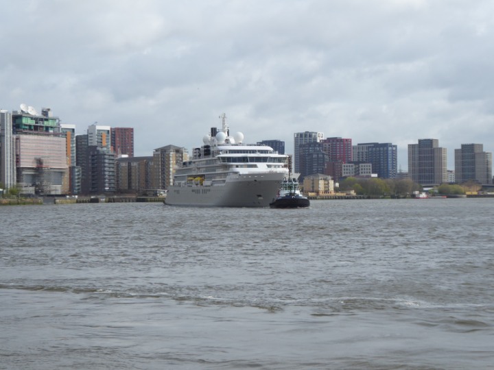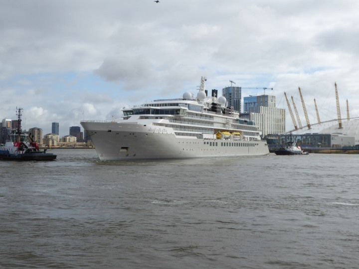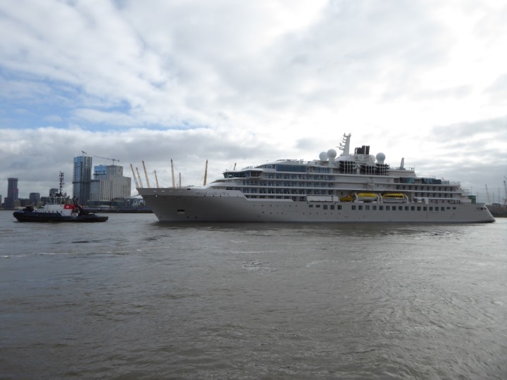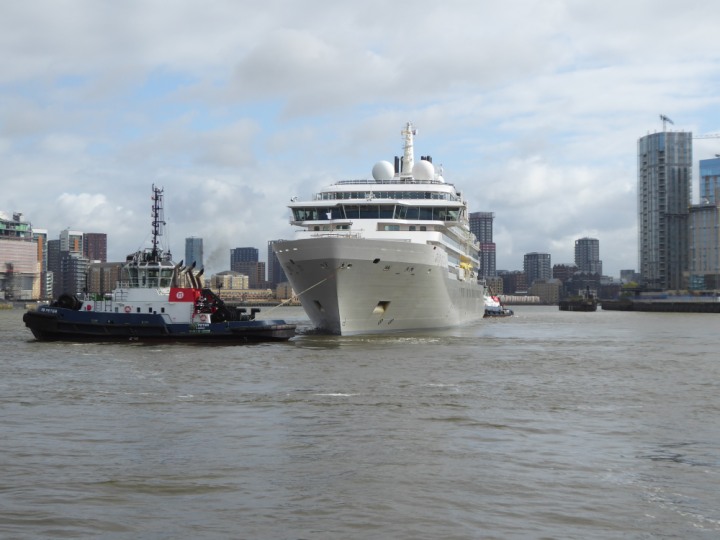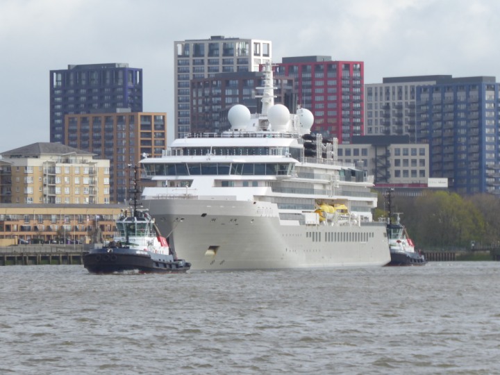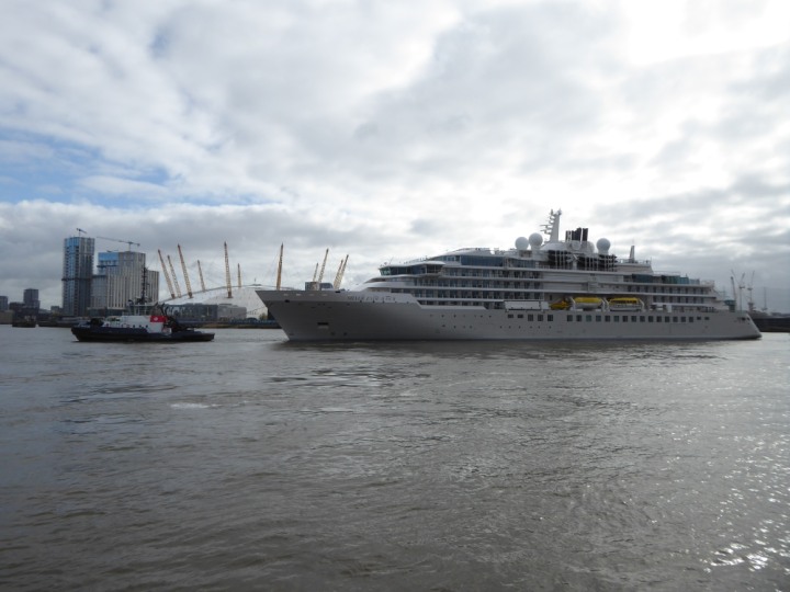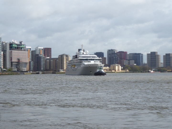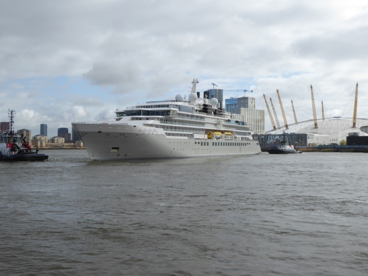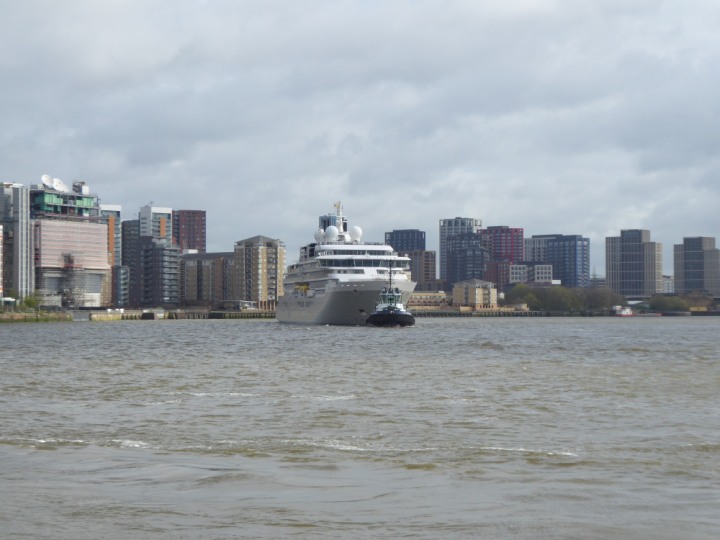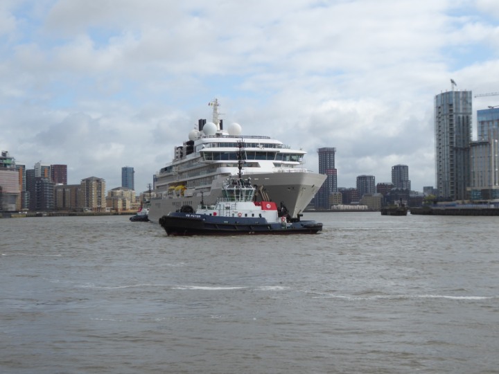 SILVER ENDEAVOUR * romagic. 24 *Click a Photo Above   once Big, click Right    Arrow in corner >   to start Slide Show   or Fast F/FW  > L:164x28.4m (538x93ft+) SILVER ENDEAVOUR Friday 05 April  08:30am The First Super Yacht to visit London 2024 Two Tugs spun the ship around at the 02 Dome to reverse back to the Greenwich Tier Terminal. Departure: Sunday 7th at 13:00
