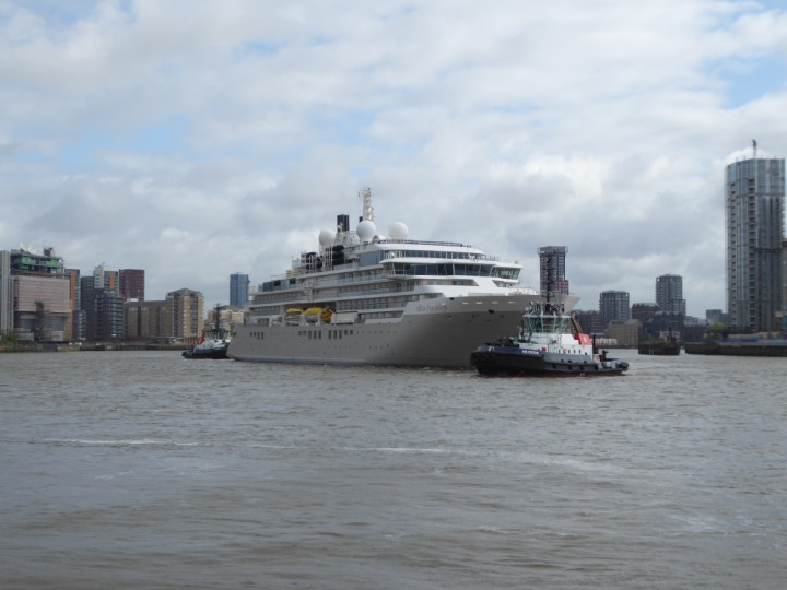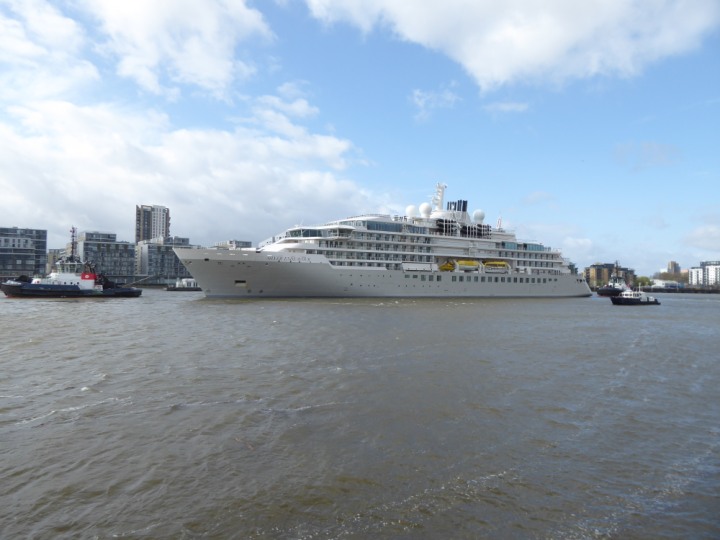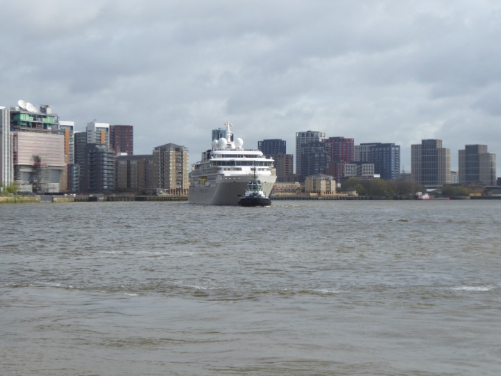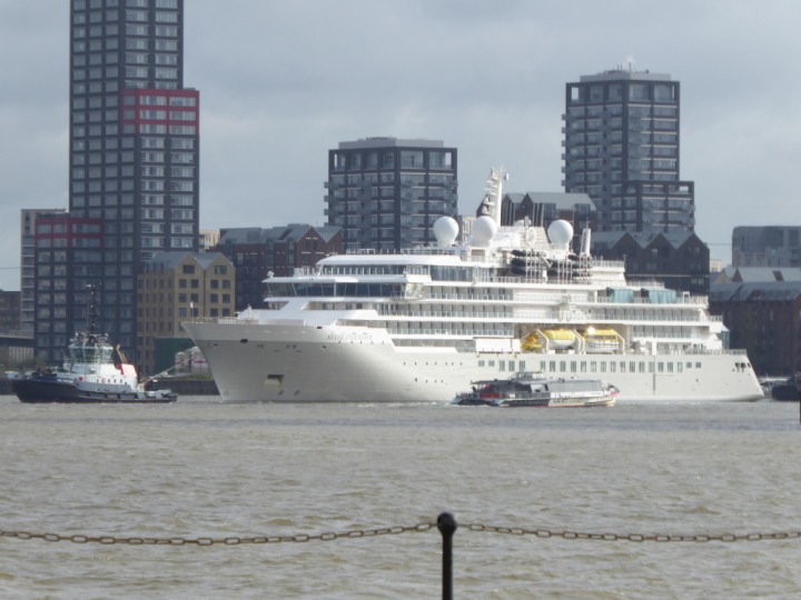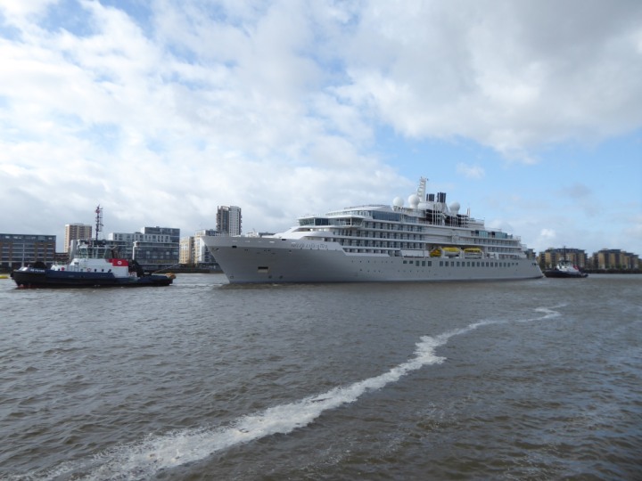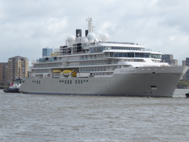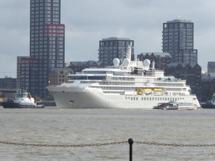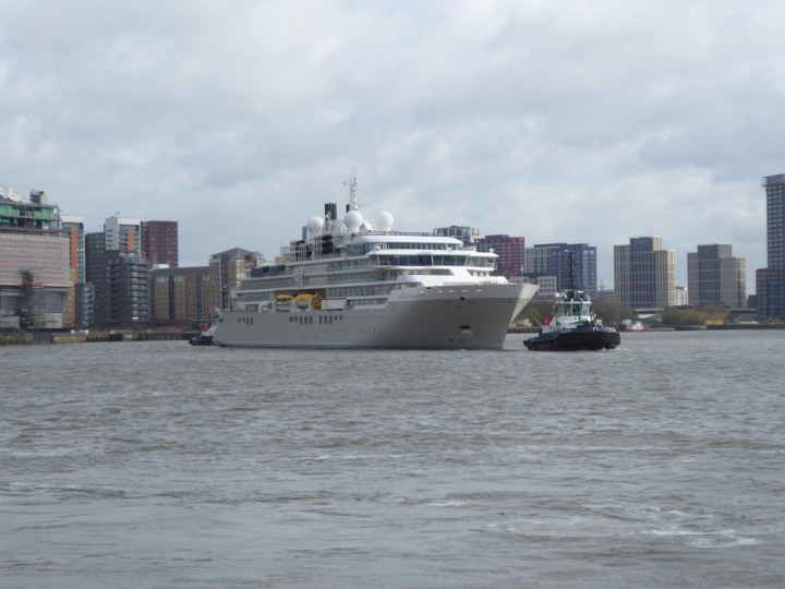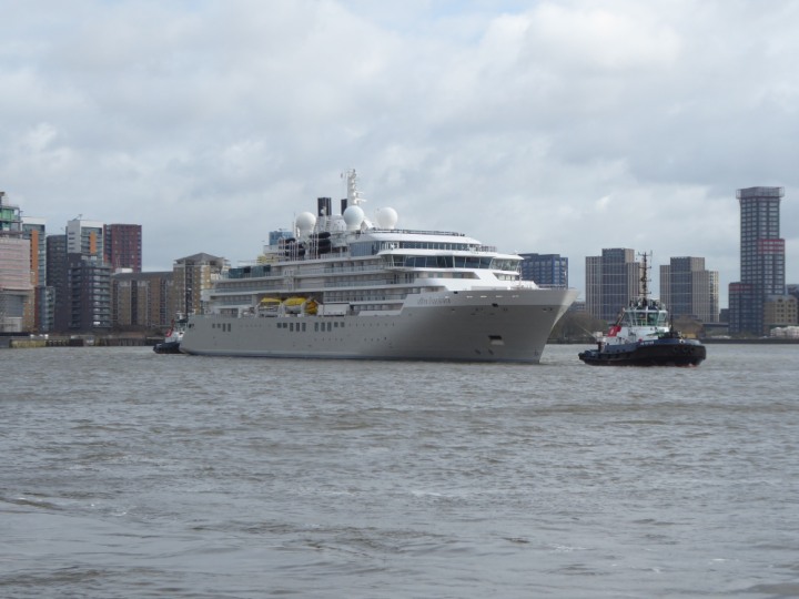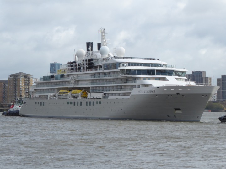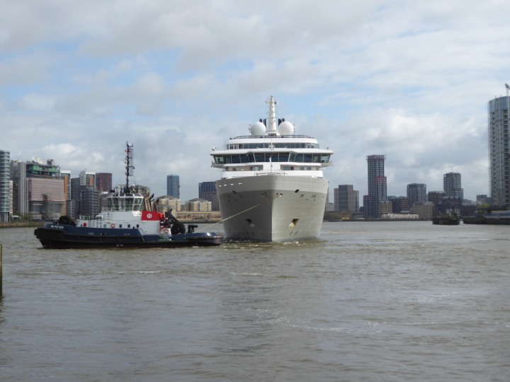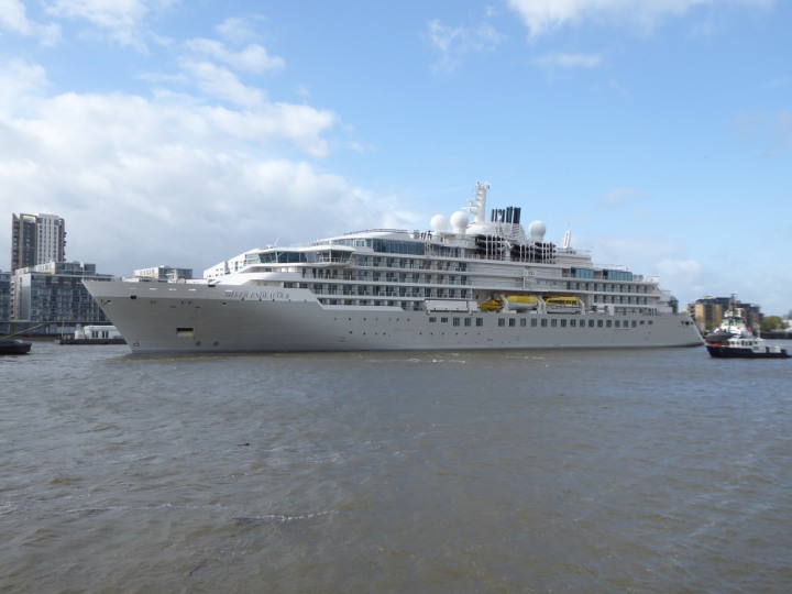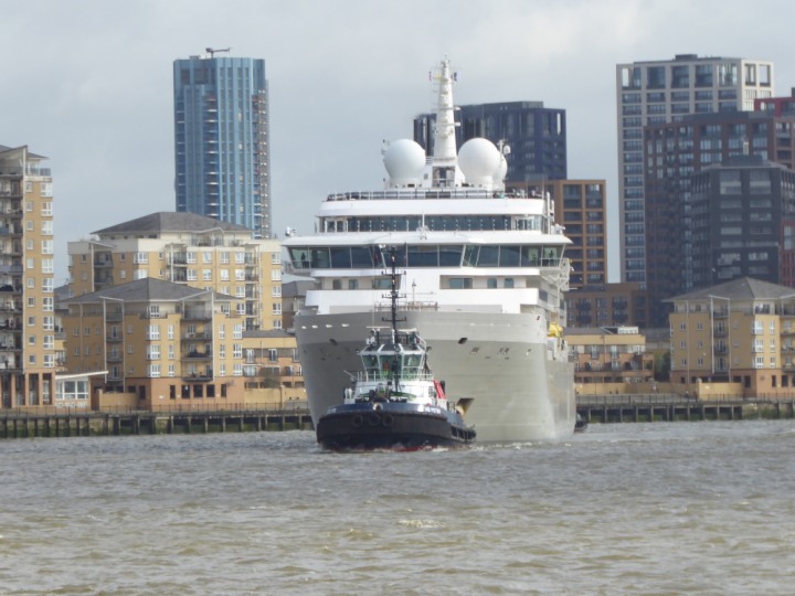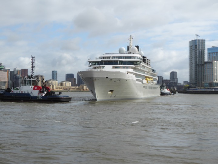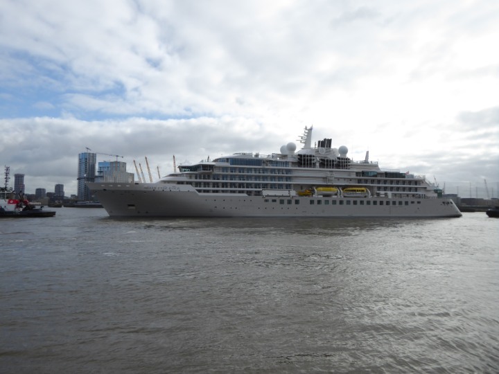 SILVER ENDEAVOUR * romagic. 24 *Click a Photo Above   once Big, click Right    Arrow in corner >   to start Slide Show   or Fast F/FW  > L:164x28.4m (538x93ft+) SILVER ENDEAVOUR Friday 05 April  08:30am The First Super Yacht to visit London 2024 Two Tugs spun the ship around at the 02 Dome to reverse back to the Greenwich Tier Terminal. Departure: Sunday 7th at 13:00