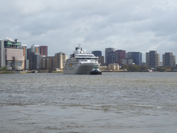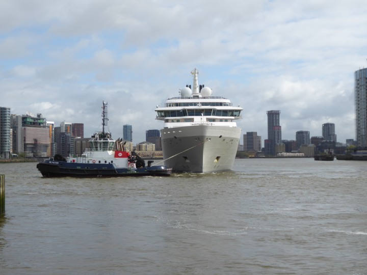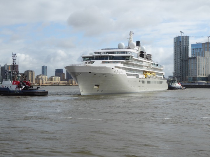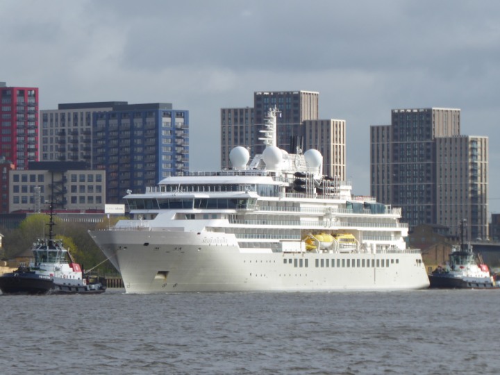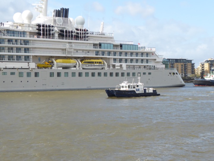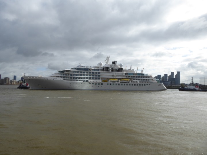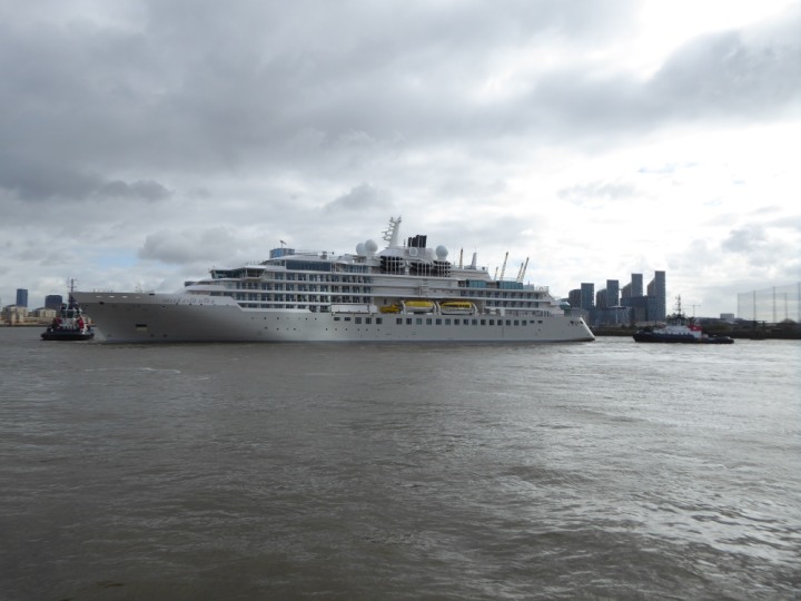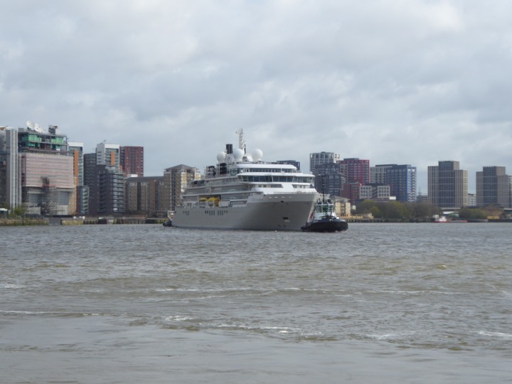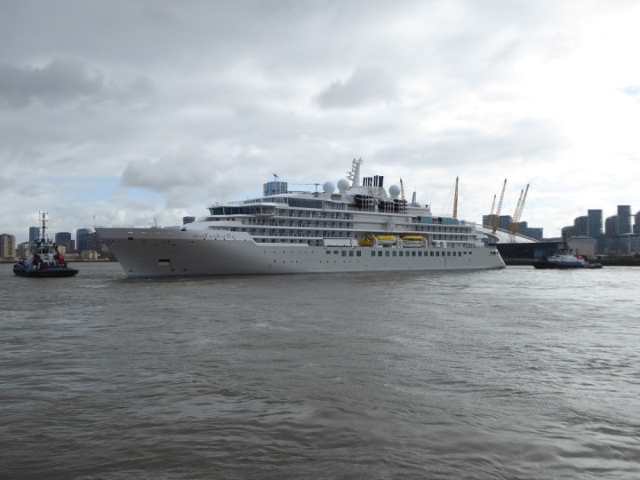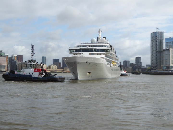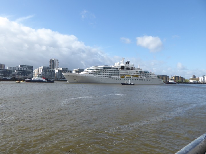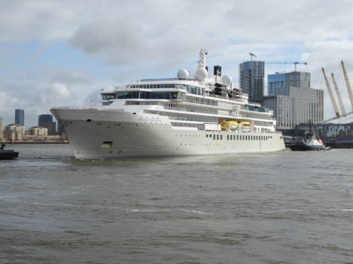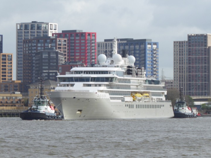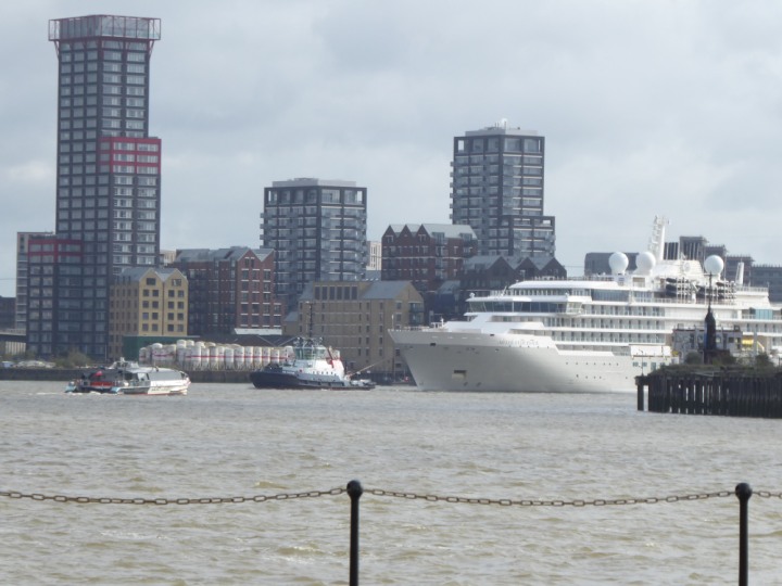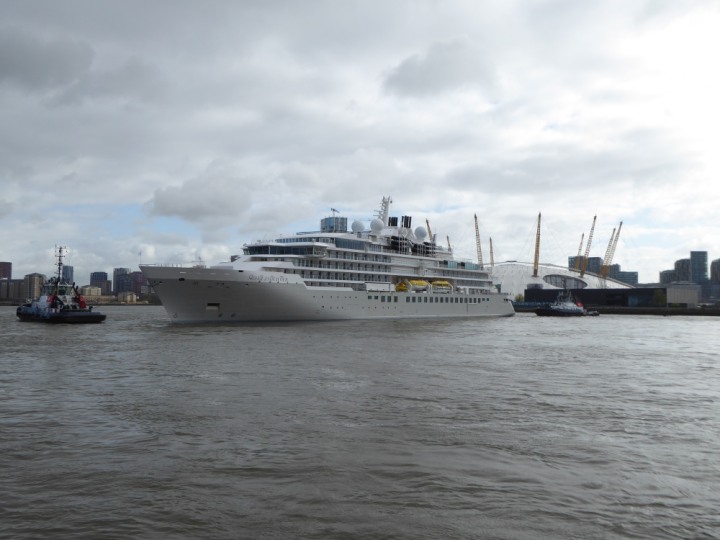 SILVER ENDEAVOUR * romagic. 24 *Click a Photo Above   once Big, click Right    Arrow in corner >   to start Slide Show   or Fast F/FW  > L:164x28.4m (538x93ft+) SILVER ENDEAVOUR Friday 05 April  08:30am The First Super Yacht to visit London 2024 Two Tugs spun the ship around at the 02 Dome to reverse back to the Greenwich Tier Terminal. Departure: Sunday 7th at 13:00