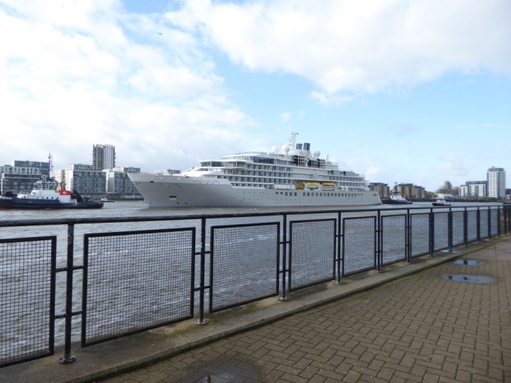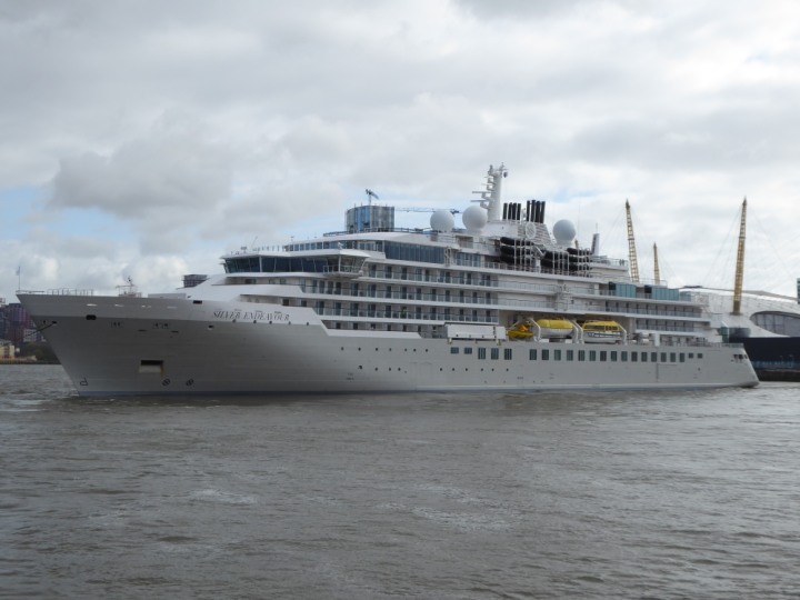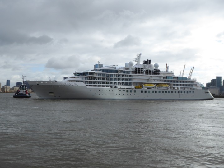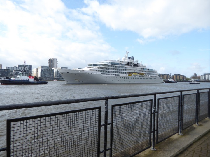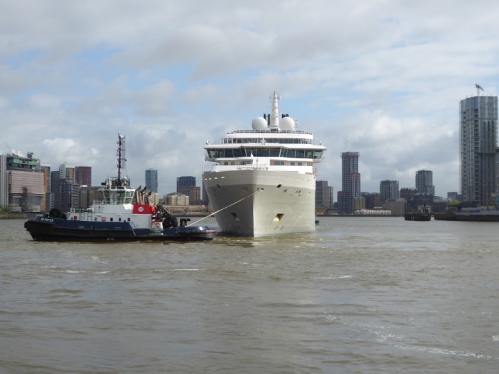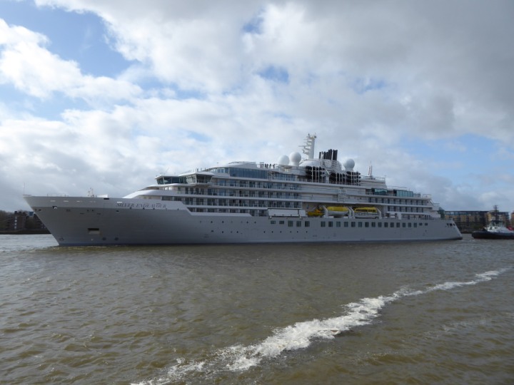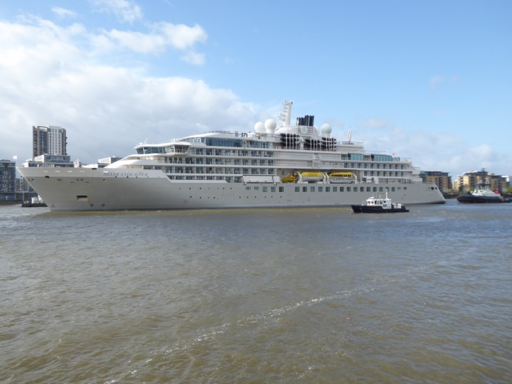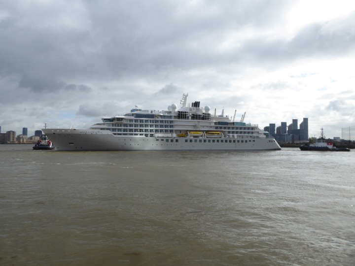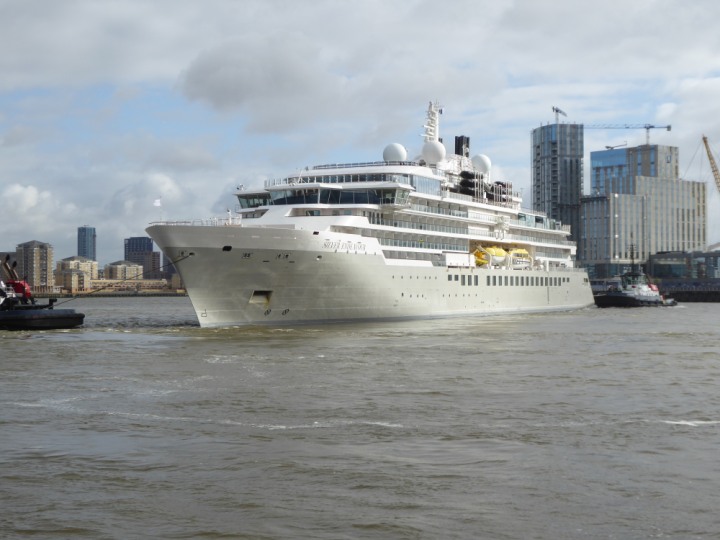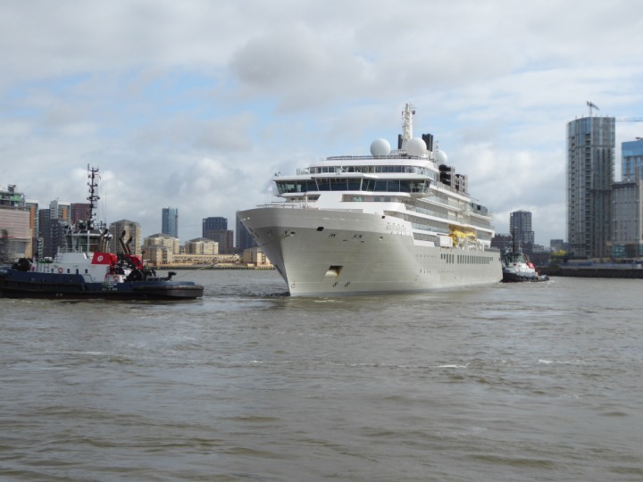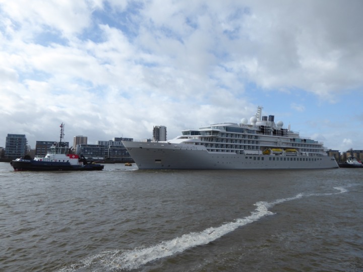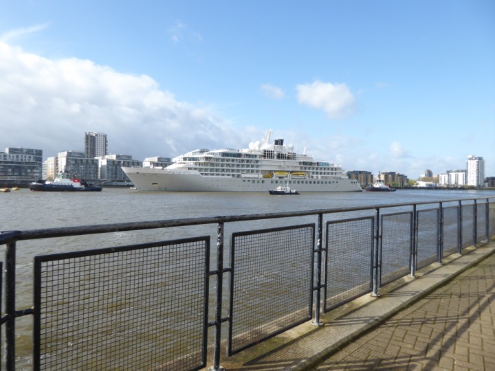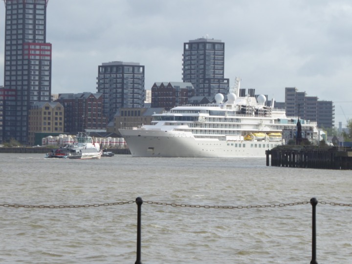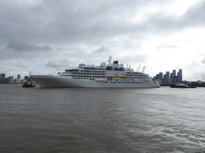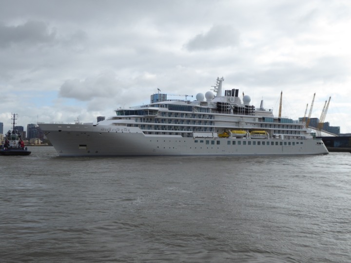 SILVER ENDEAVOUR * romagic. 24 *Click a Photo Above   once Big, click Right    Arrow in corner >   to start Slide Show   or Fast F/FW  > L:164x28.4m (538x93ft+) SILVER ENDEAVOUR Friday 05 April  08:30am The First Super Yacht to visit London 2024 Two Tugs spun the ship around at the 02 Dome to reverse back to the Greenwich Tier Terminal. Departure: Sunday 7th at 13:00