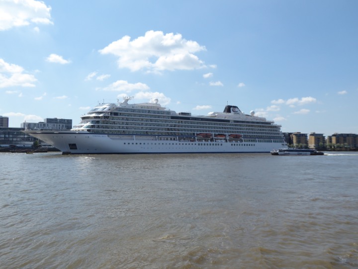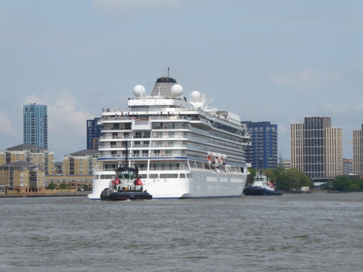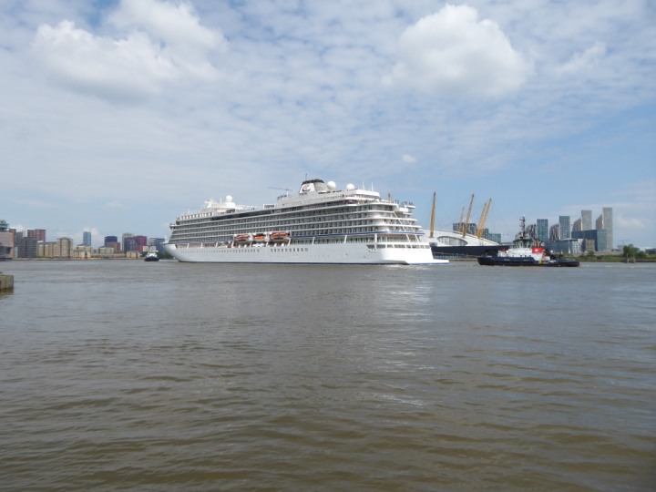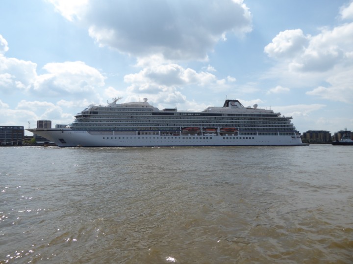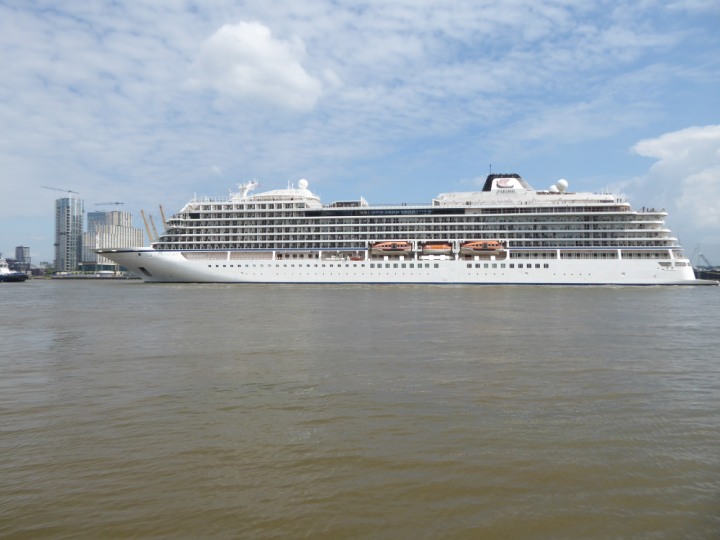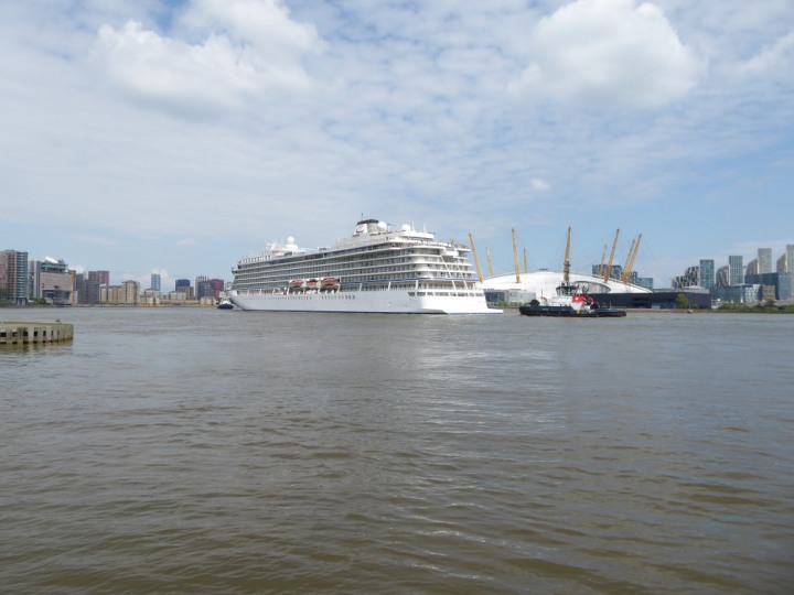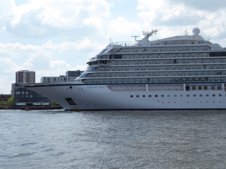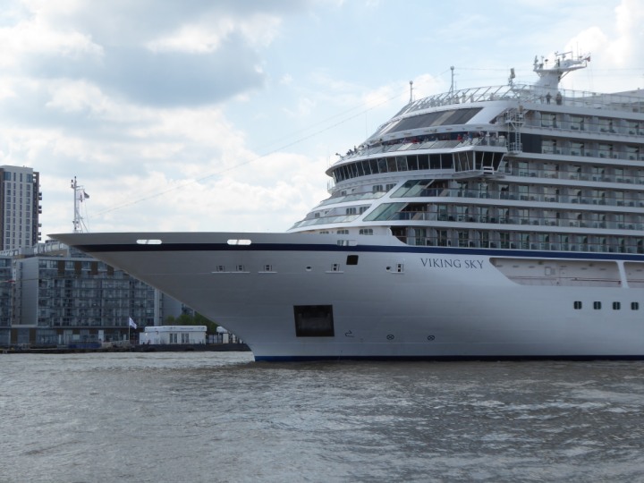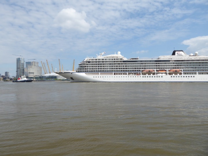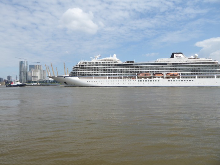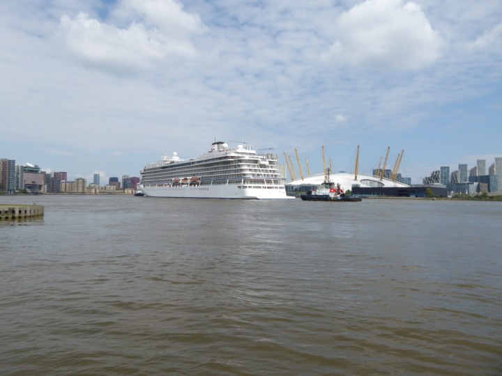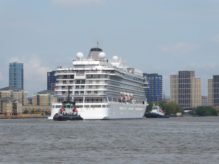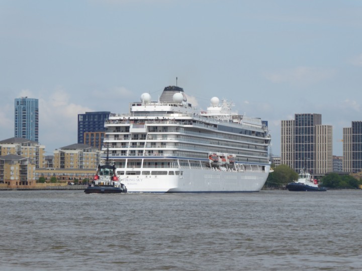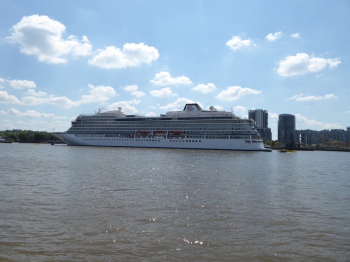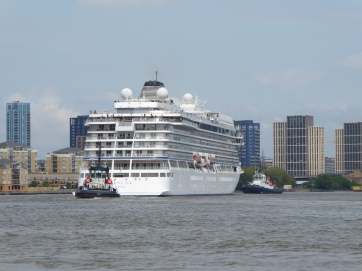 VIKING SKY romagic. 24 * *Click a Photo Above   once Big, click Right    Arrow in corner >   to start Slide Show   or Fast F/FW  > VIKING SKY Sunday 05 May  Ship arrived early morning on the high tide, (no pic's)  but I did get down to Greenwich Tier on Tuesday for it's departure at 13:30pm.  Sunny bright day, really warm T-Shirt weather, the last few  days rain. L:227x29m (745x94ft+)