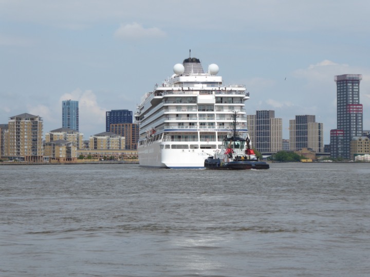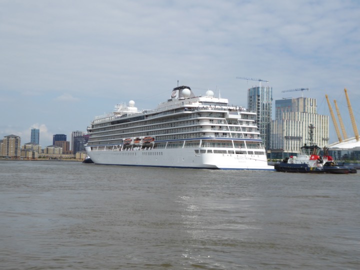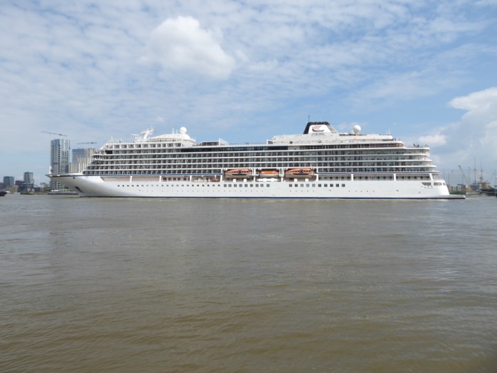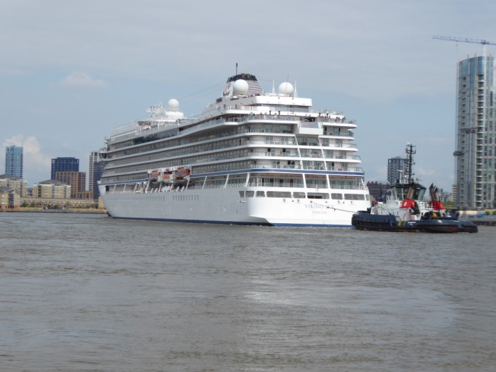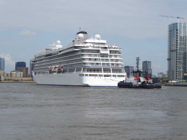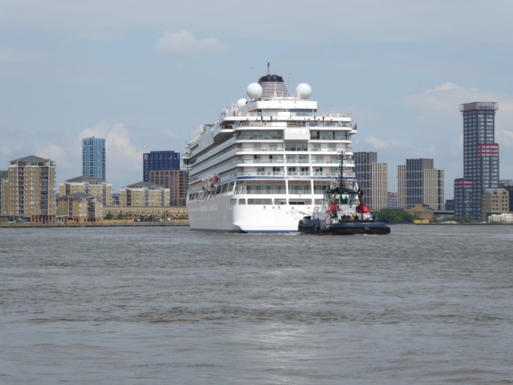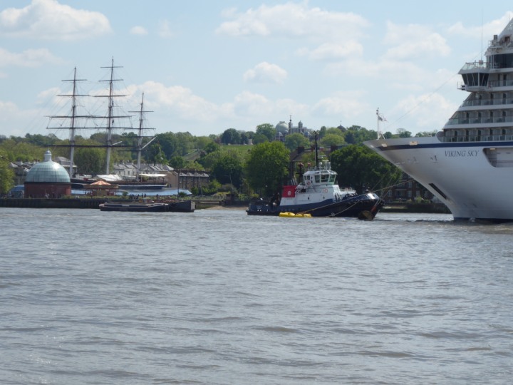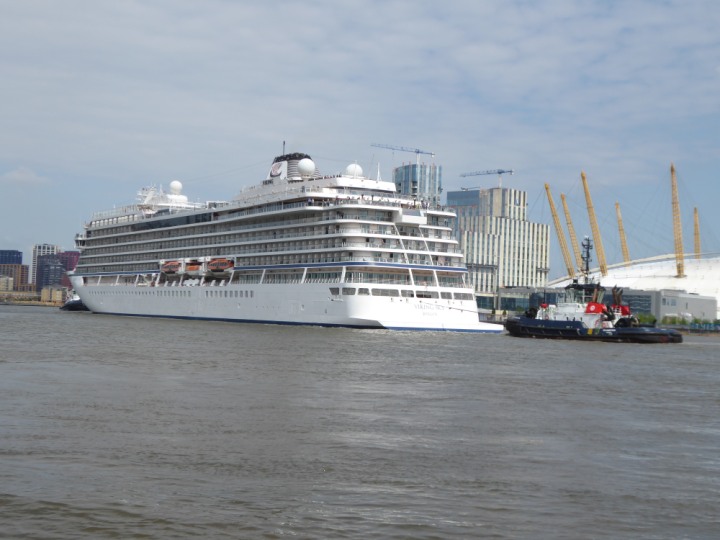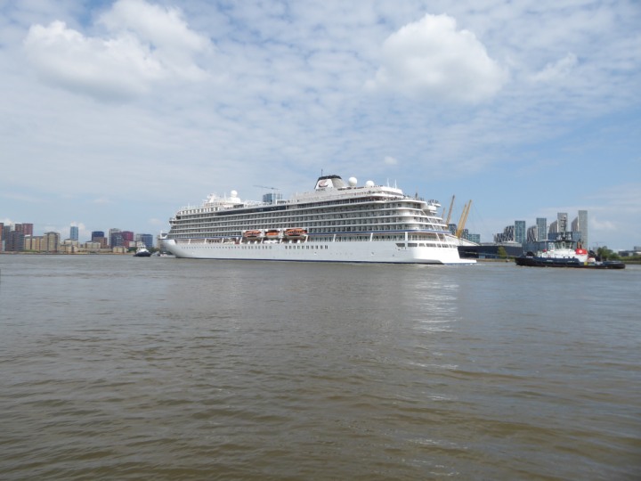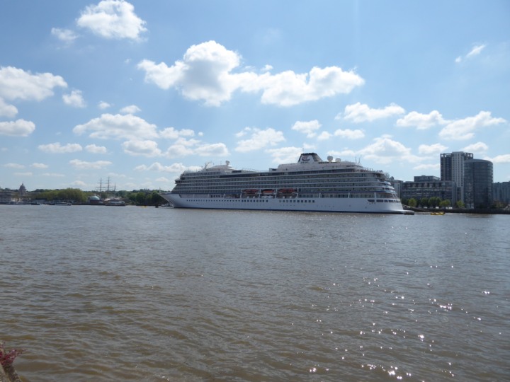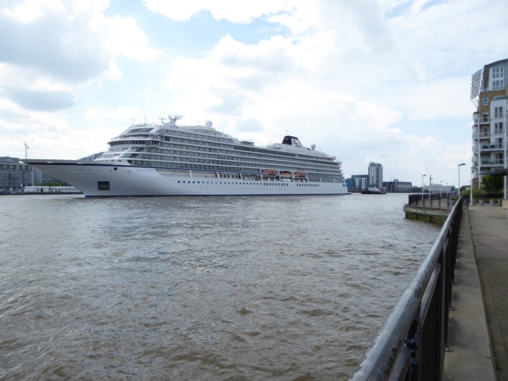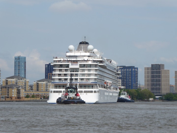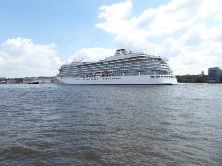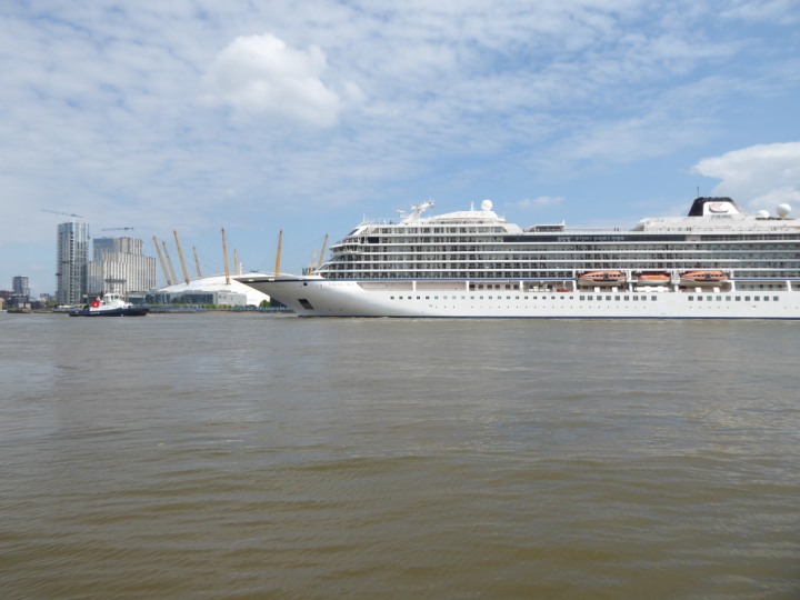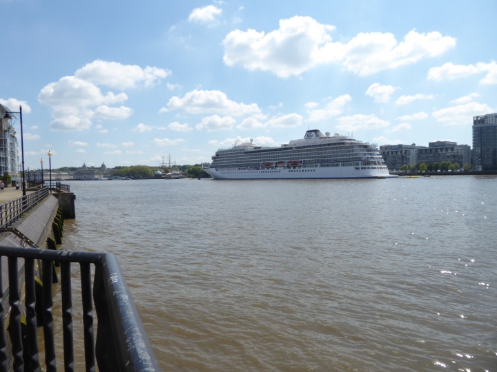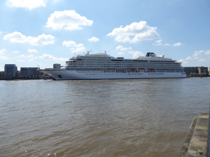 VIKING SKY romagic. 24 * *Click a Photo Above   once Big, click Right    Arrow in corner >   to start Slide Show   or Fast F/FW  > VIKING SKY Sunday 05 May  Ship arrived early morning on the high tide, (no pic's)  but I did get down to Greenwich Tier on Tuesday for it's departure at 13:30pm.  Sunny bright day, really warm T-Shirt weather, the last few  days rain. L:227x29m (745x94ft+)