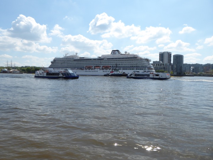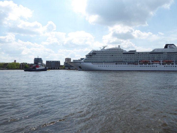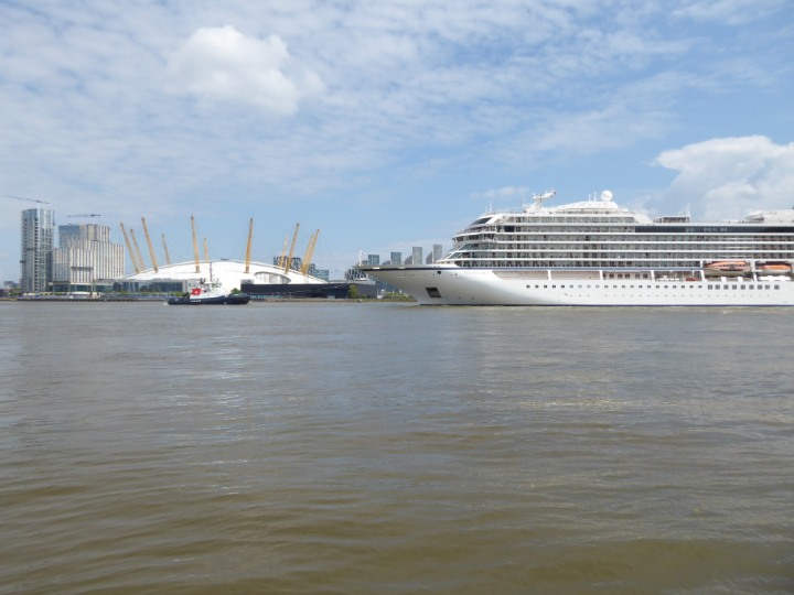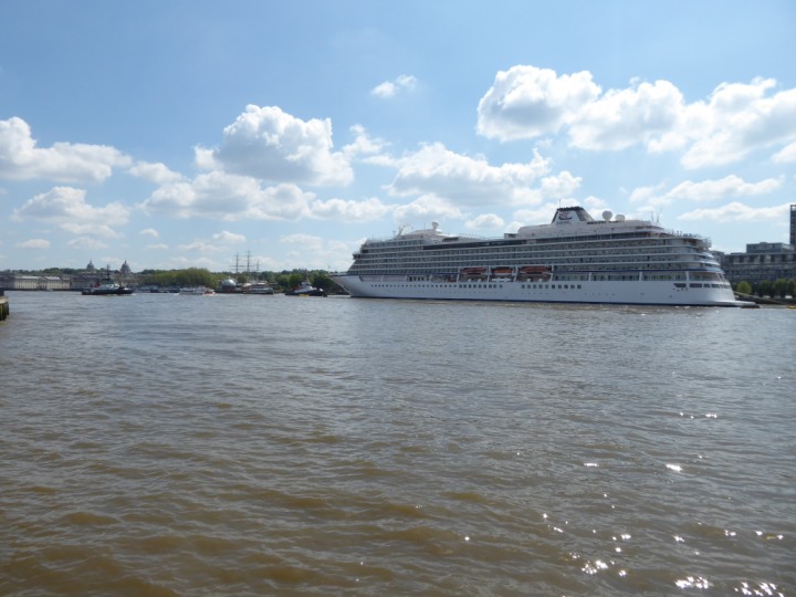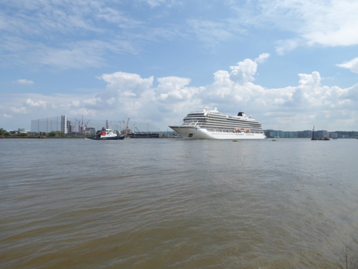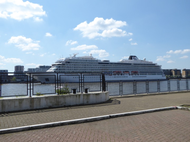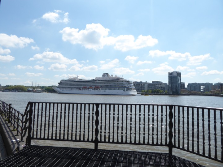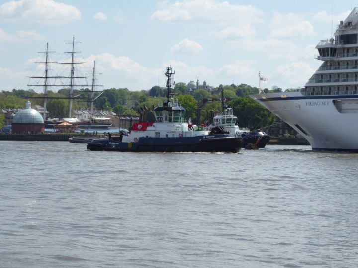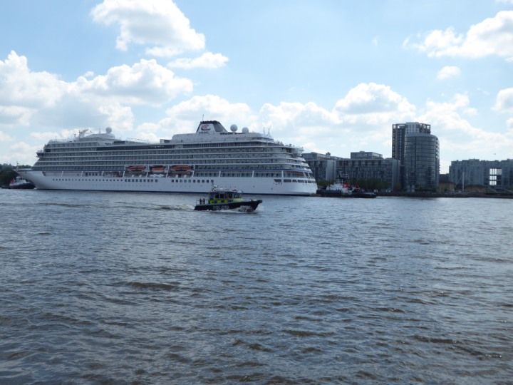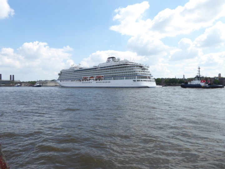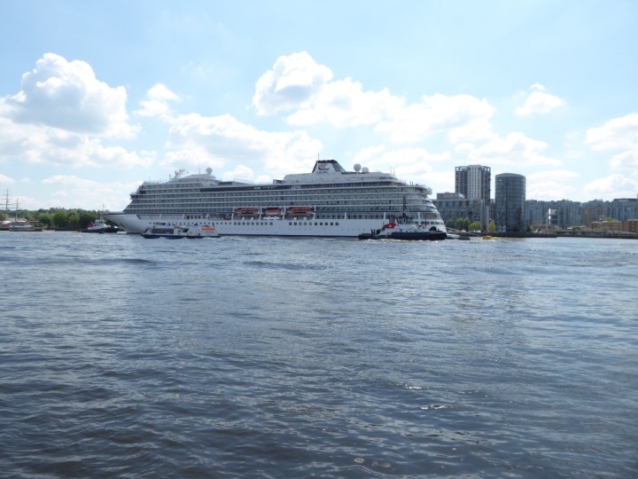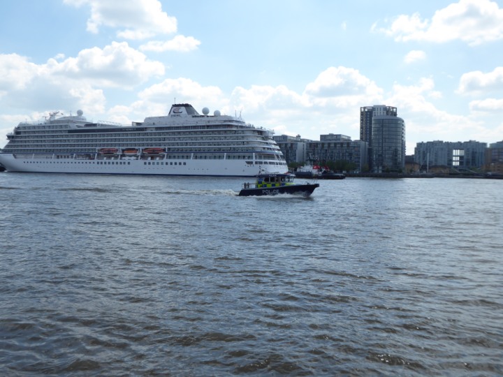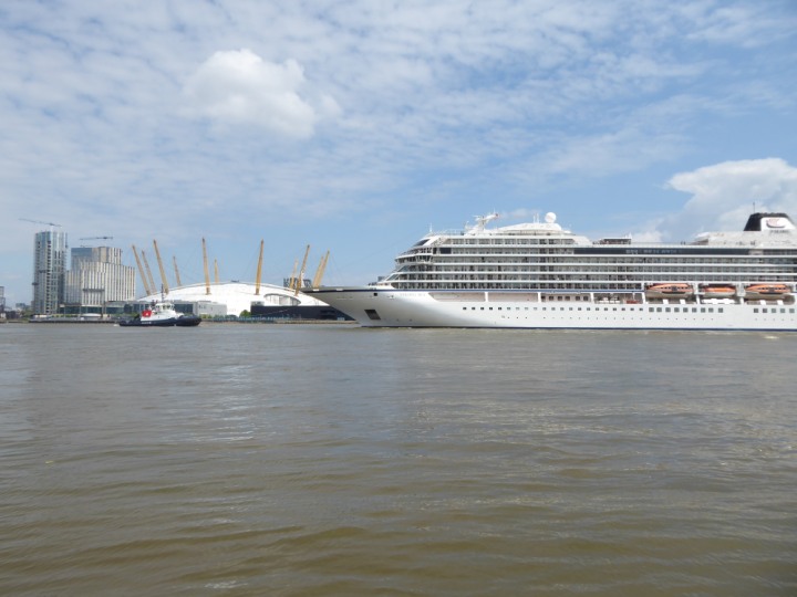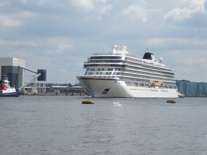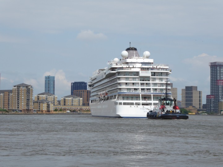 VIKING SKY romagic. 24 * *Click a Photo Above   once Big, click Right    Arrow in corner >   to start Slide Show   or Fast F/FW  > VIKING SKY Sunday 05 May  Ship arrived early morning on the high tide, (no pic's)  but I did get down to Greenwich Tier on Tuesday for it's departure at 13:30pm.  Sunny bright day, really warm T-Shirt weather, the last few  days rain. L:227x29m (745x94ft+)